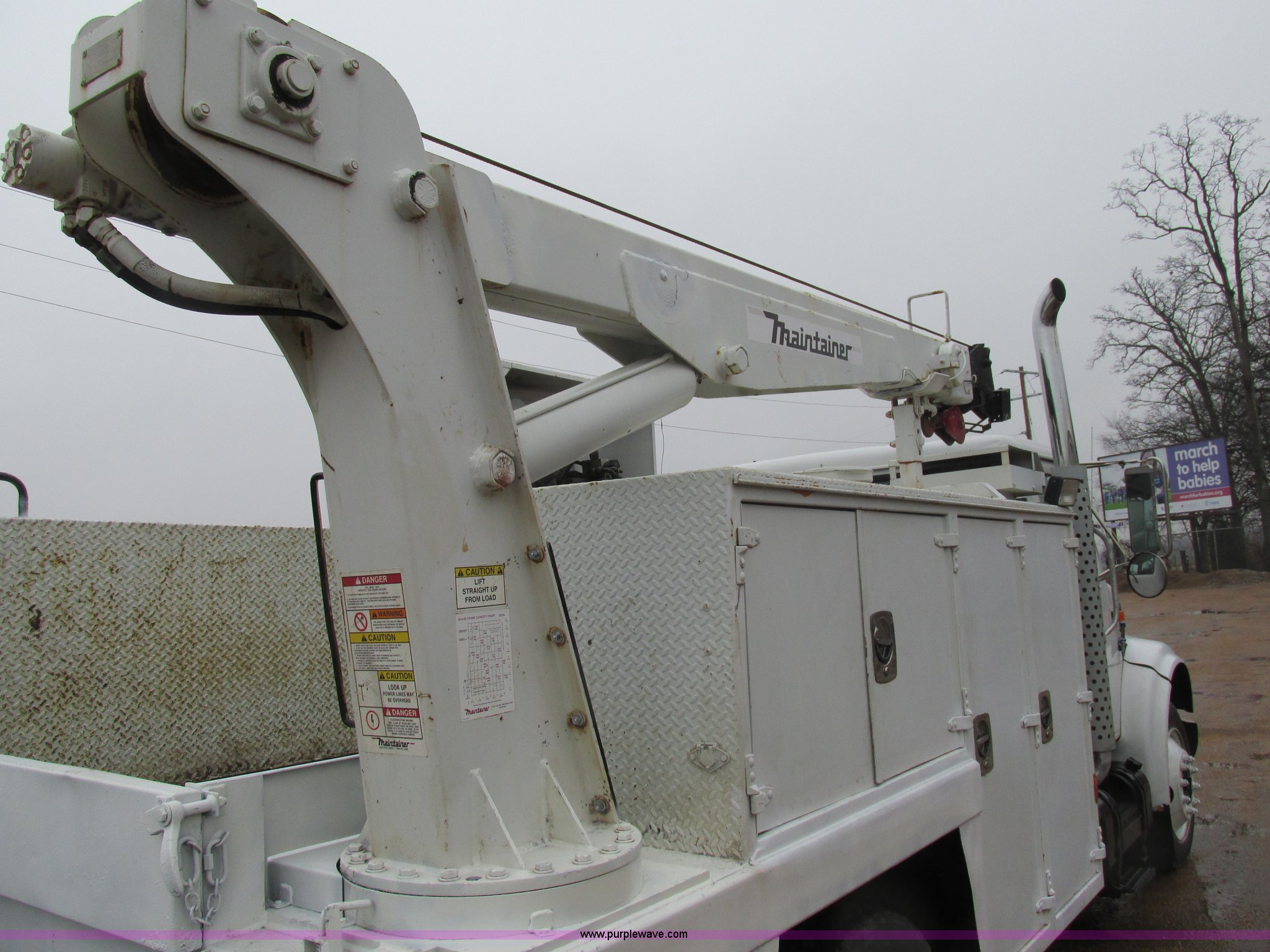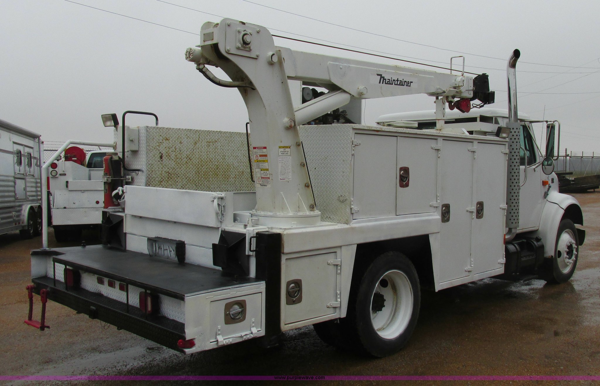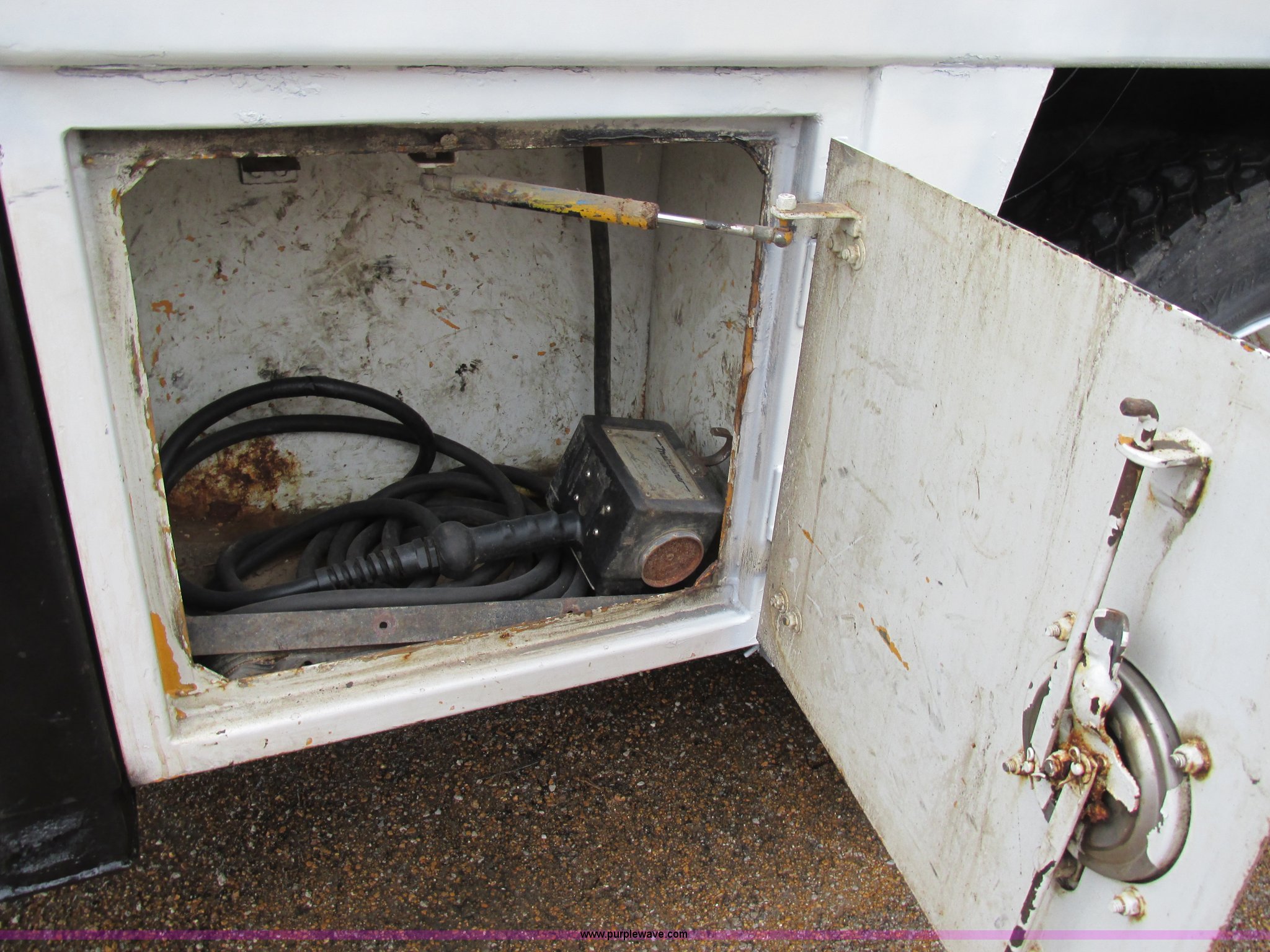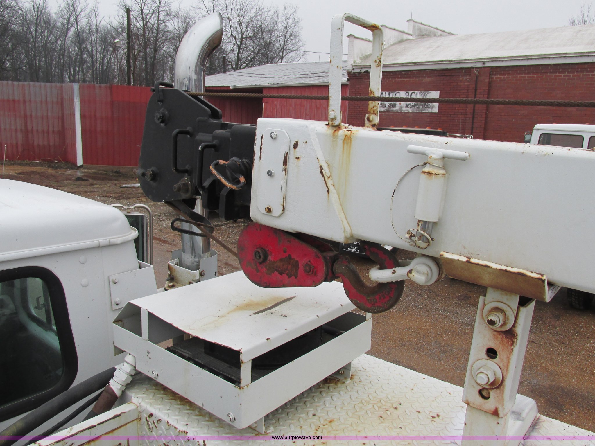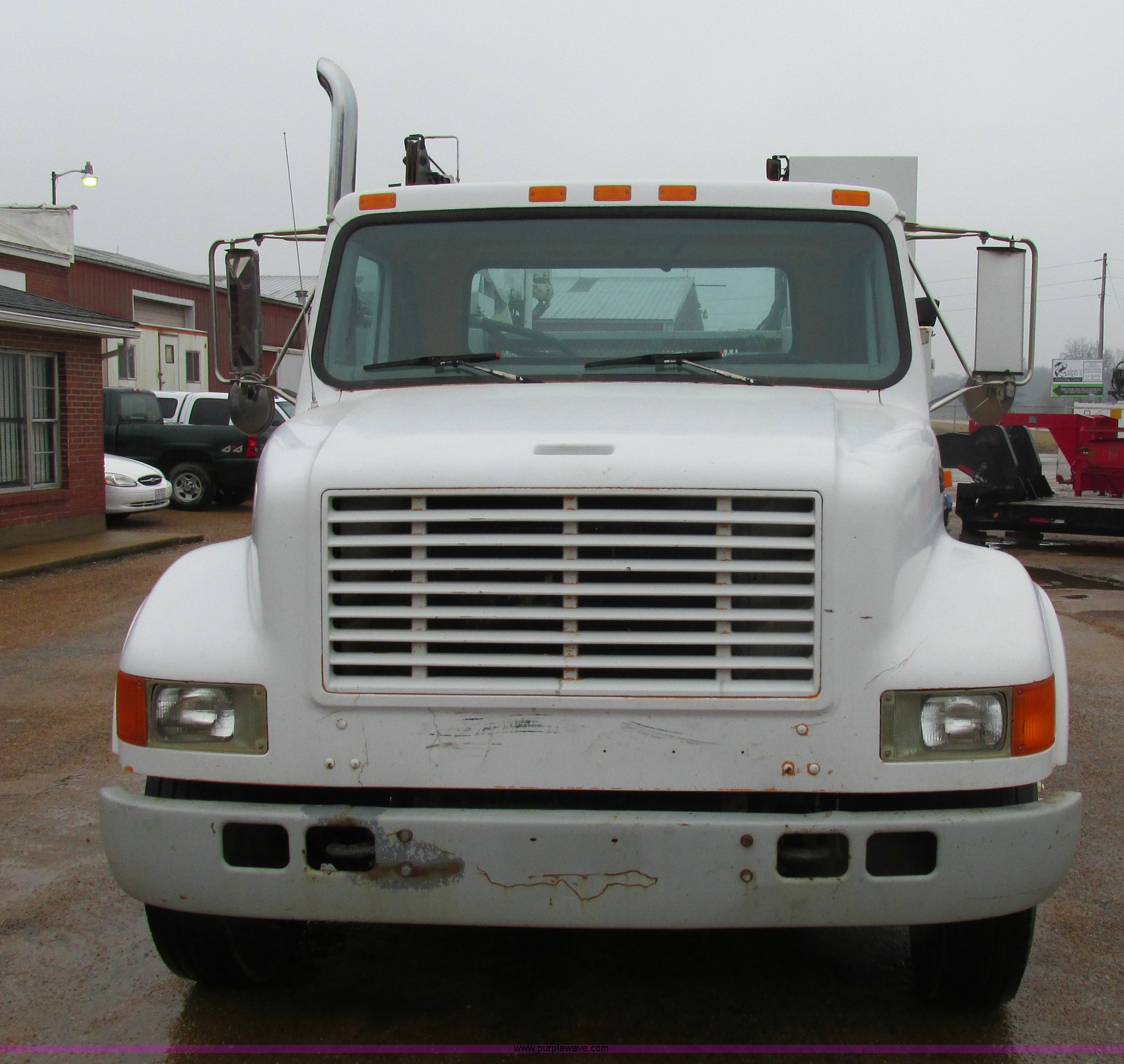 Purple Wave is selling a used Service Truck in Illinois. This item is a 1997 International 4700 service truck with the following: 307,948 miles on odometer, International DT466E 7.6L L6 diesel engine, Allison automatic transmission, Push button, AC and heat, Cruise, AM/FM/CD, Air suspension seat, Uniden CB radio, Maintainer M370 service bed, 11'L, Crane, 8,000 lbs capacity, Hydraulic operation, Serial 970701710528, Snatch block, Tethered remote, Hydraulic outriggers, Air hose reel, Air compressor, Front and rear work lights, Vented boxes, 26" x 94" rear work platform, Fire extinguisher, Dual fuel tanks, 45 and 25 gallon capacities, Hydraulic brakes, 225/70R22.5 tires, GVW 26,000 lbs, One passenger side box rusted