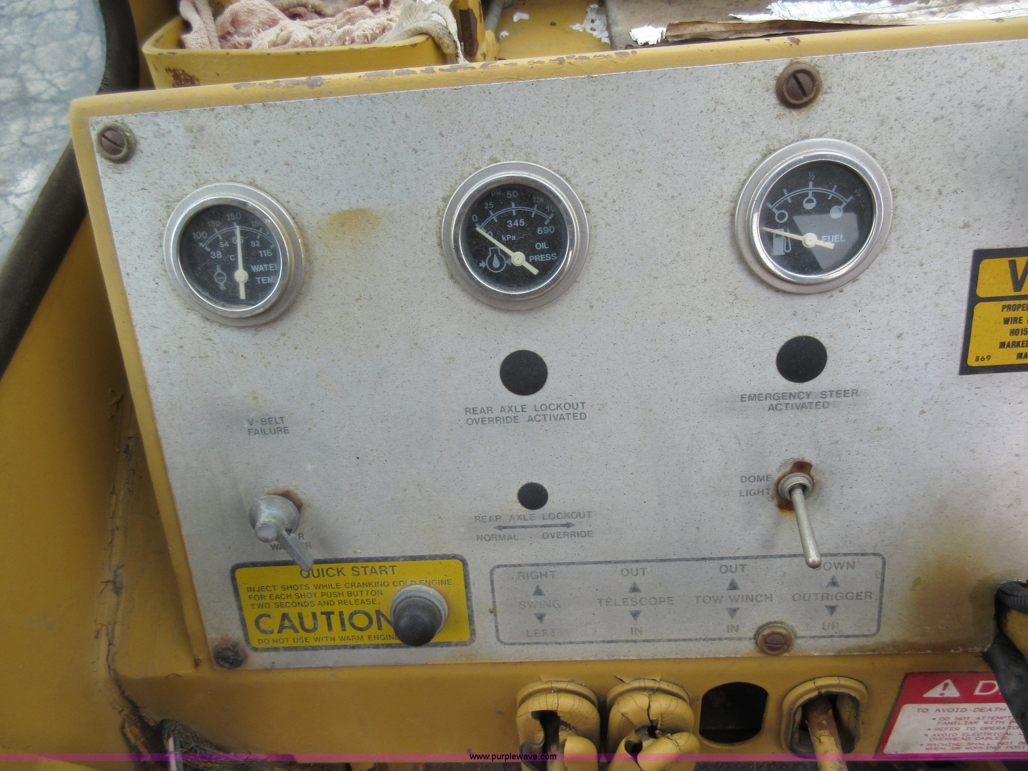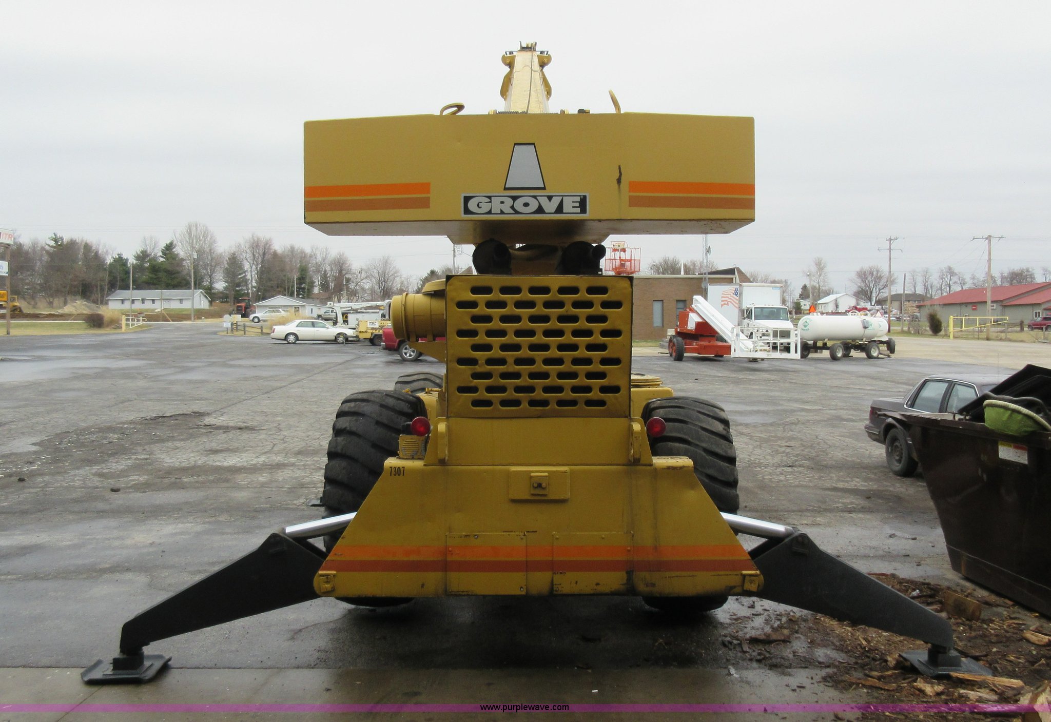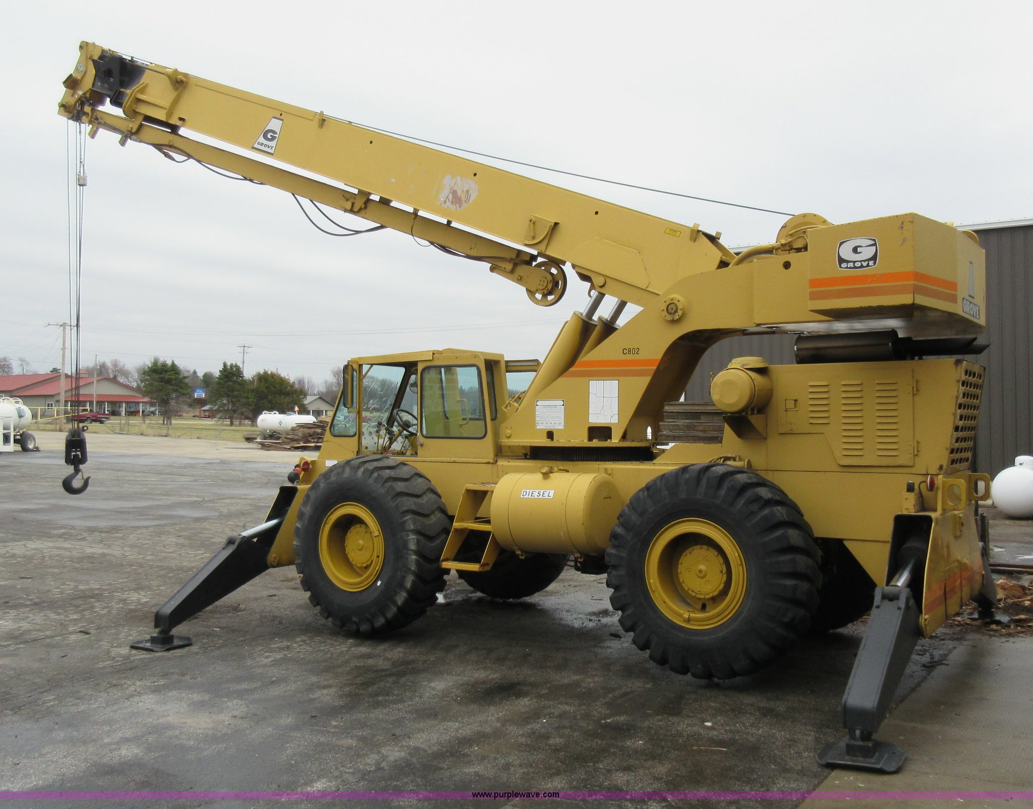 Purple Wave is selling a used Rough or All Terrain Crane in Illinois. This item is a Grove RT58C rough terrain crane with the following: 2,555 hours on meter, Cummmins eight cylinder diesel engine, Hydrostatic transmission, Four wheel drive, Enclosed cab, Heat, Lift Tec radio two block alarm, 20 ton Johnson load block, Hydraulic outriggers, 20.5-25 tires, Serial 47307