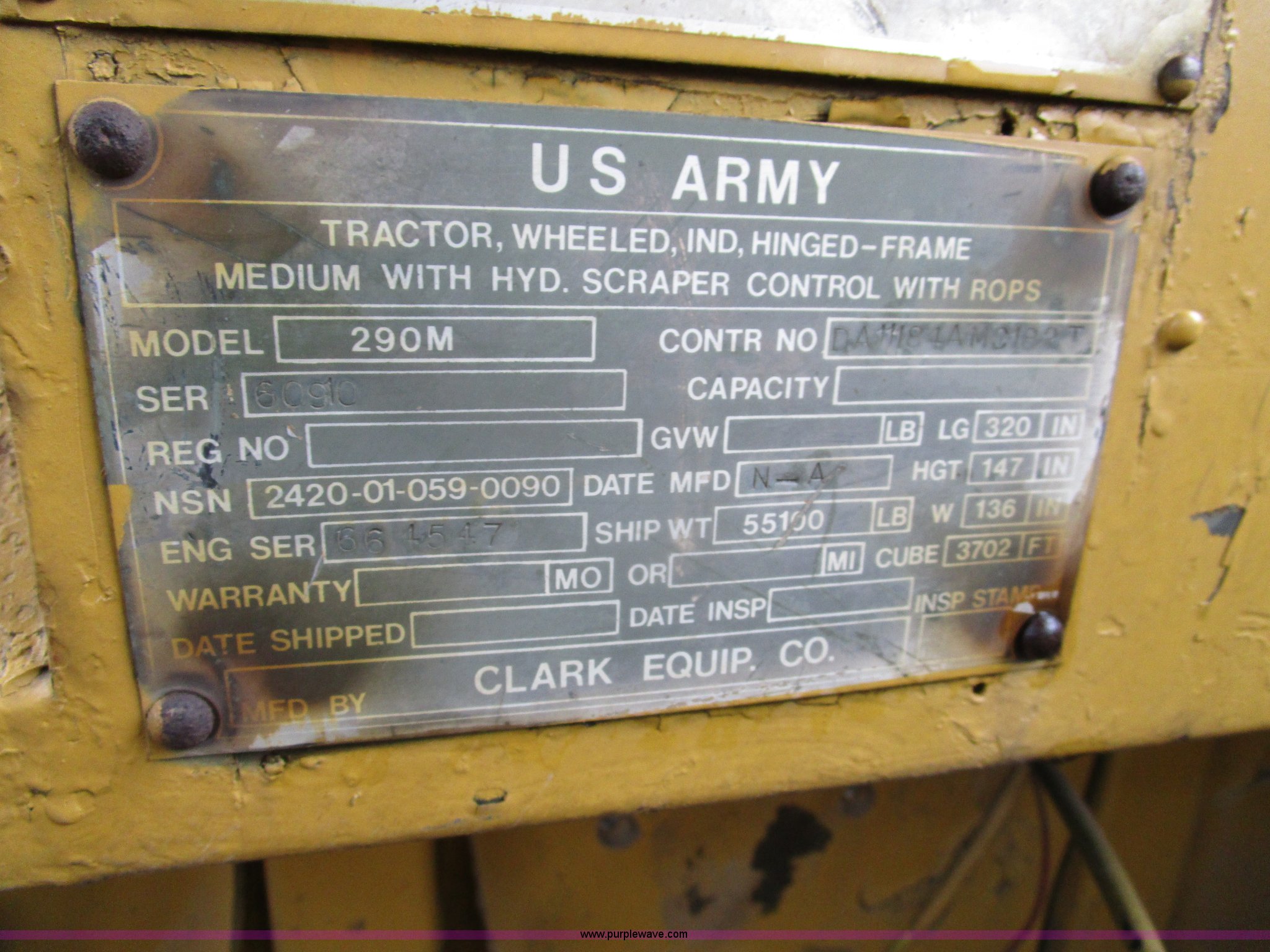 Purple Wave is selling a used Wheel Dozer in Kansas. This item is a Clark Z90M dozer with the following: 947 hours on meter, Cummins six cylinder turbo diesel engine, 4F-2R gears, 136"W dozer face, 18 cubic yard capacity, 10'31" bowl blade, 29.5-29 tires, Serial 60910