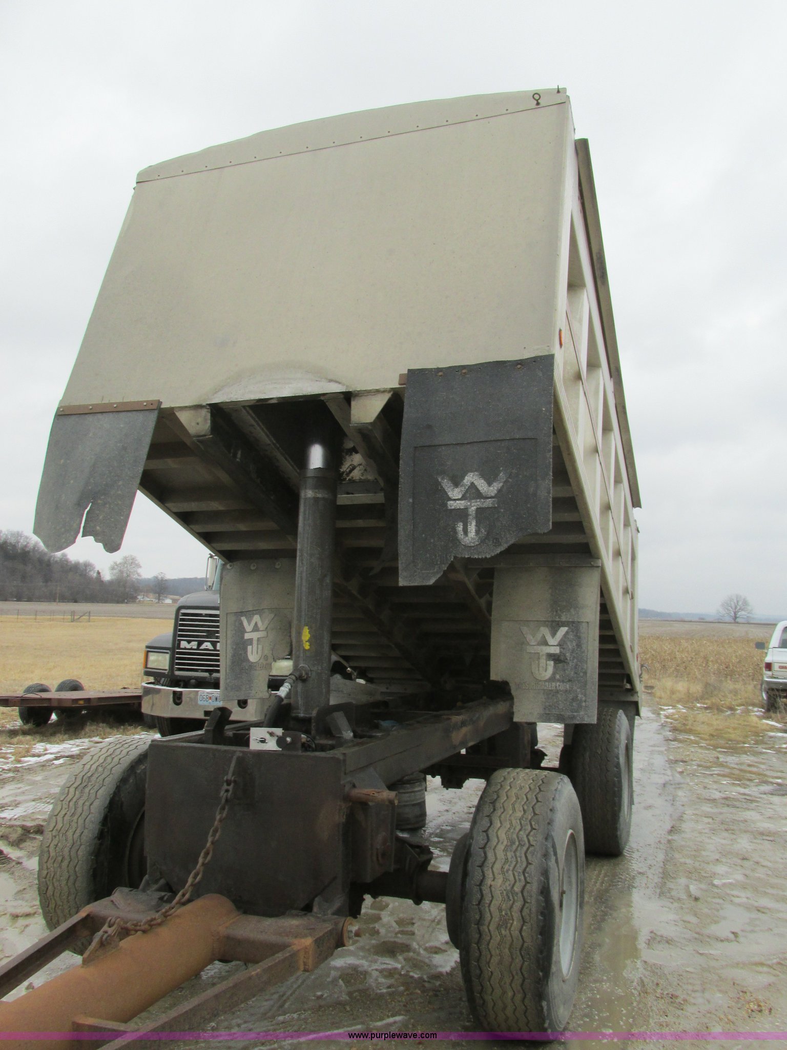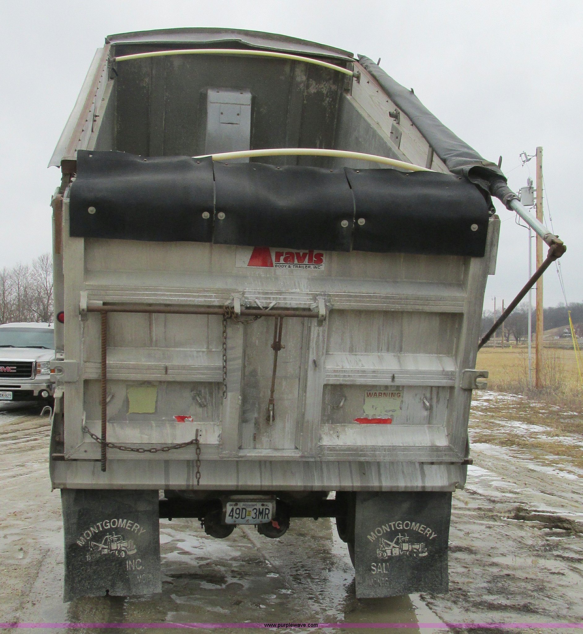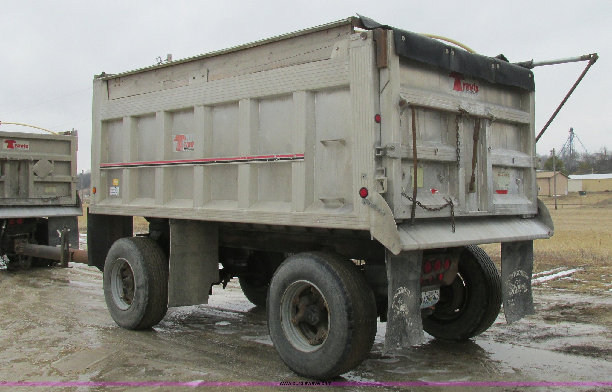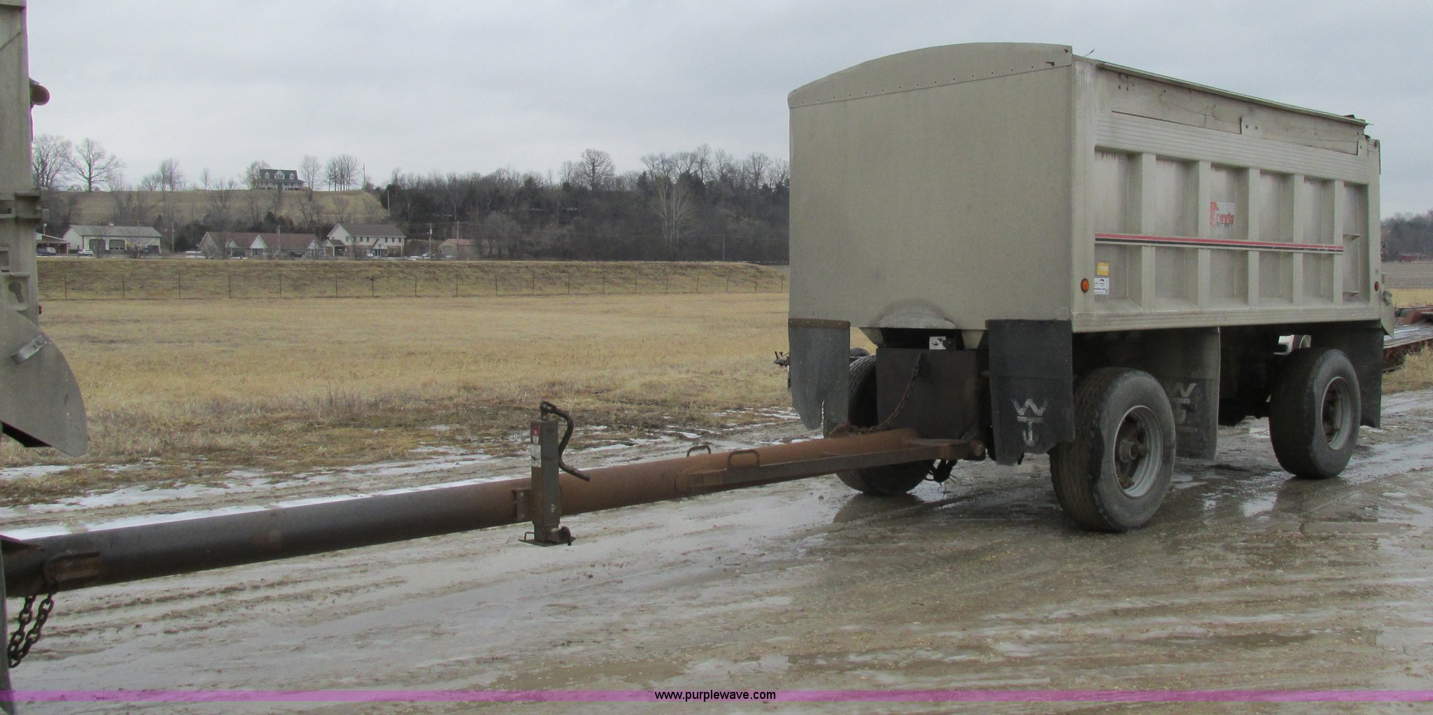 Purple Wave is selling a used End Dump Rock Trailer in Missouri. This item is a 1993 shop built pup dump trailer with the following: 15'L aluminum body, 60"H sideboards, Single ram three stage hoist, Air operated end gate, Grain chute door, Rollover tarp, Hoses, Jack, Safety chains, Pintle hitch, Air suspension, Air brakes, 385/65R22.5 tires