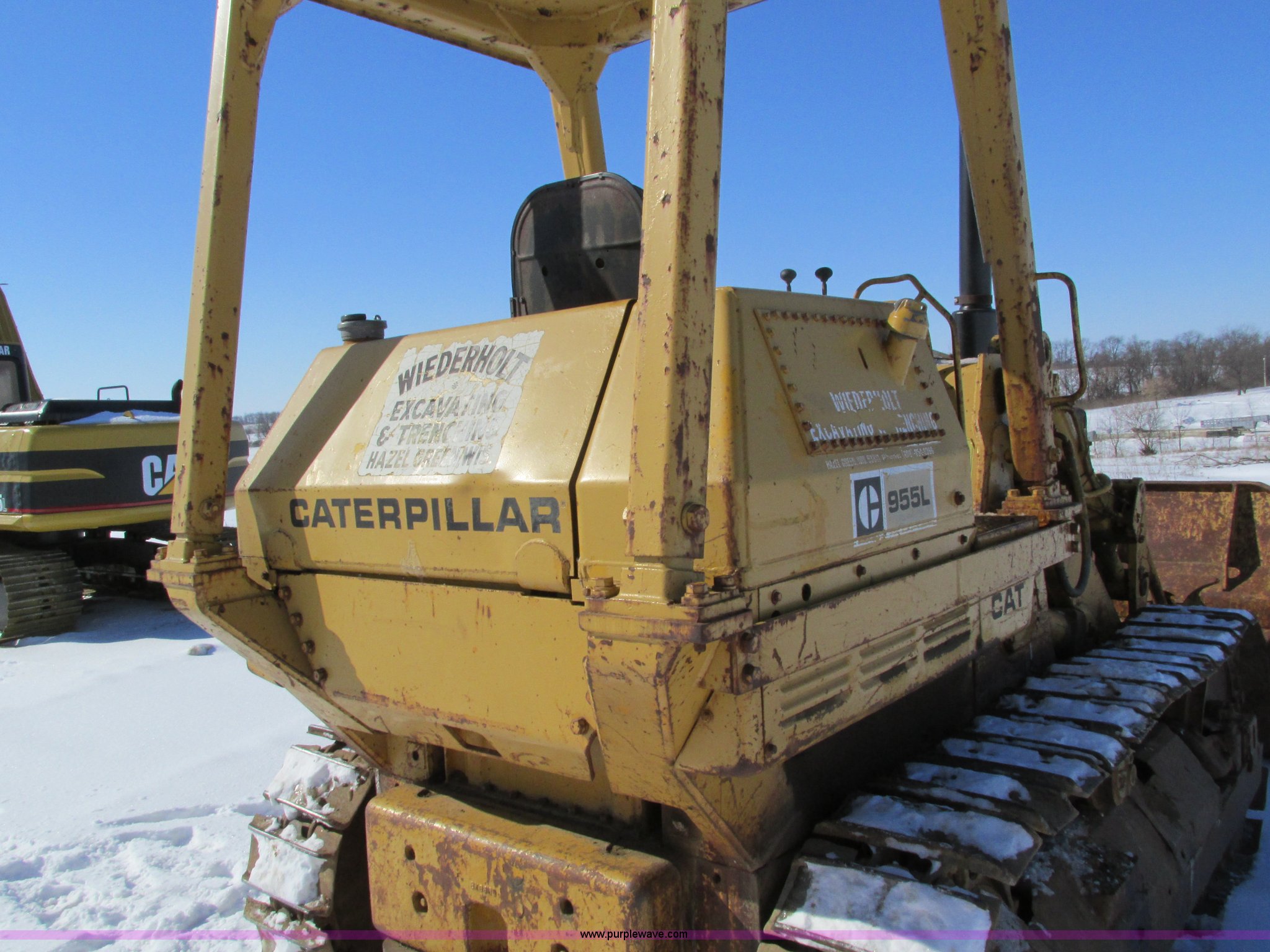 Purple Wave is selling a used Crawler Loader in Wisconsin. This item is a 1976 Caterpillar 955L track loader with the following: 8,524 hours on meter, Caterpillar 3304 four cylinder diesel engine, Serial 78P28578, Powershift transmission, 3F-3R gears, Canopy, Suspension seat, Two lever loader control, Engine enclosures, Clutch brake steering, General purpose eight tooth bucket, 7.5'W, 2 cu. yd. capacity, Rear counter weights, Six bottom rollers, 16.5"W double grouser track pads, Additional rails and sprockets, Berco CR4322, 33,126 lbs. base operating weight, Serial 85J10550