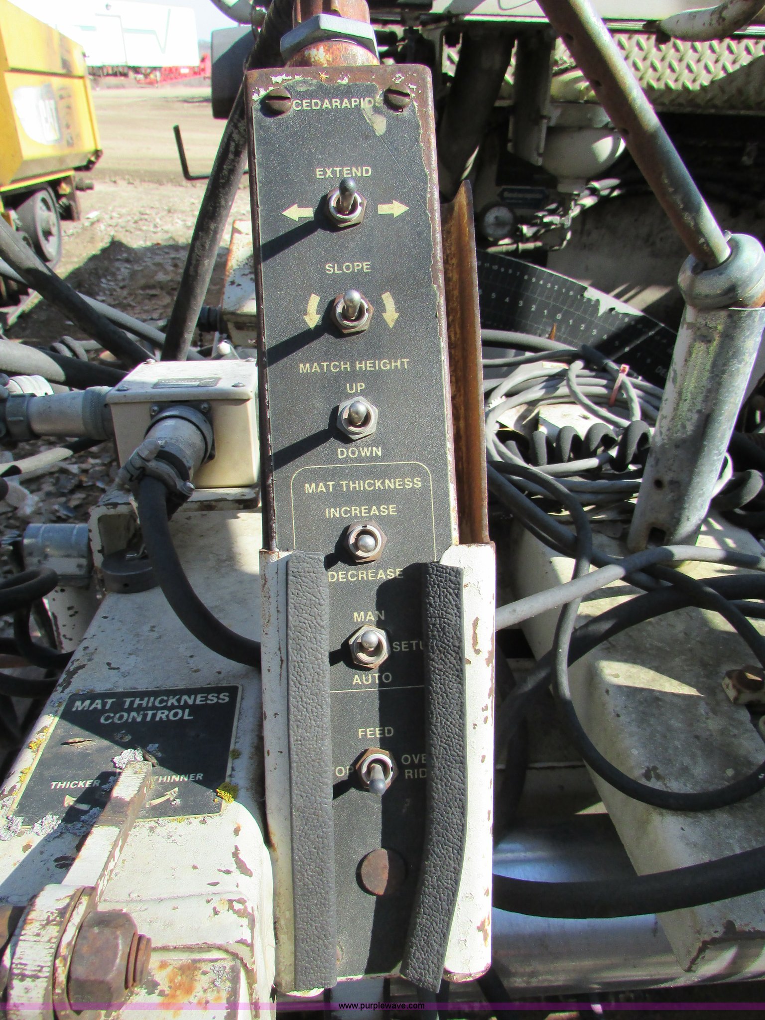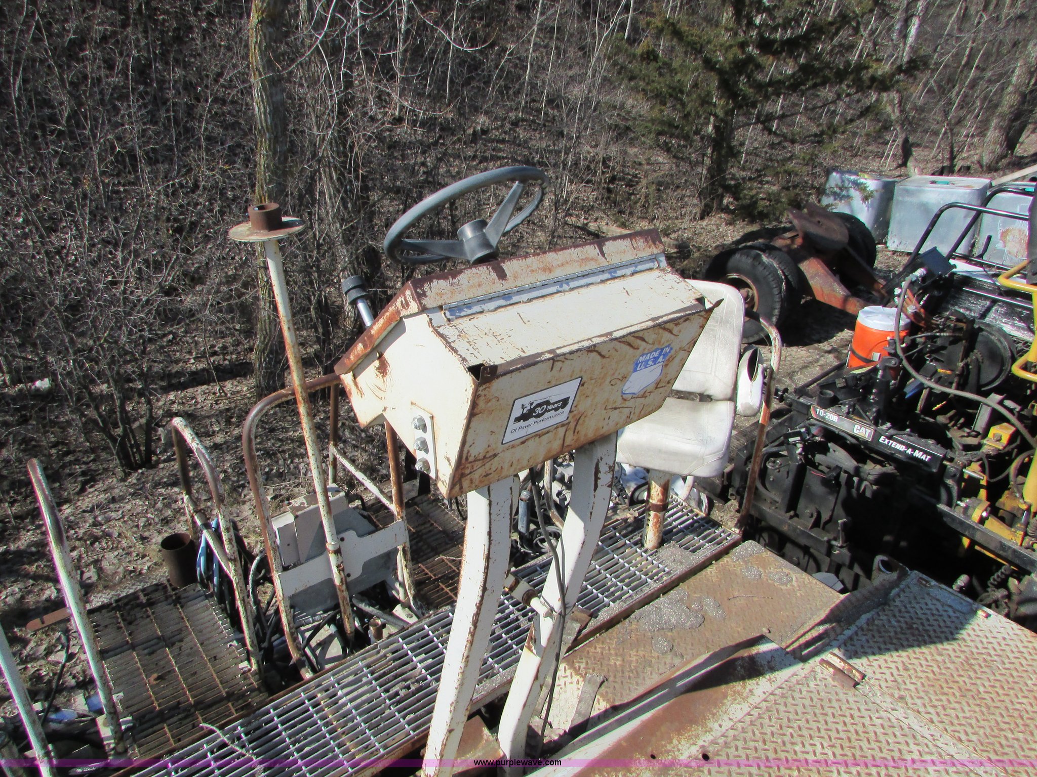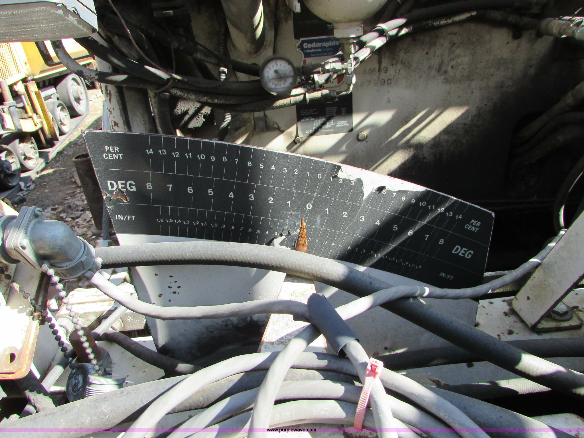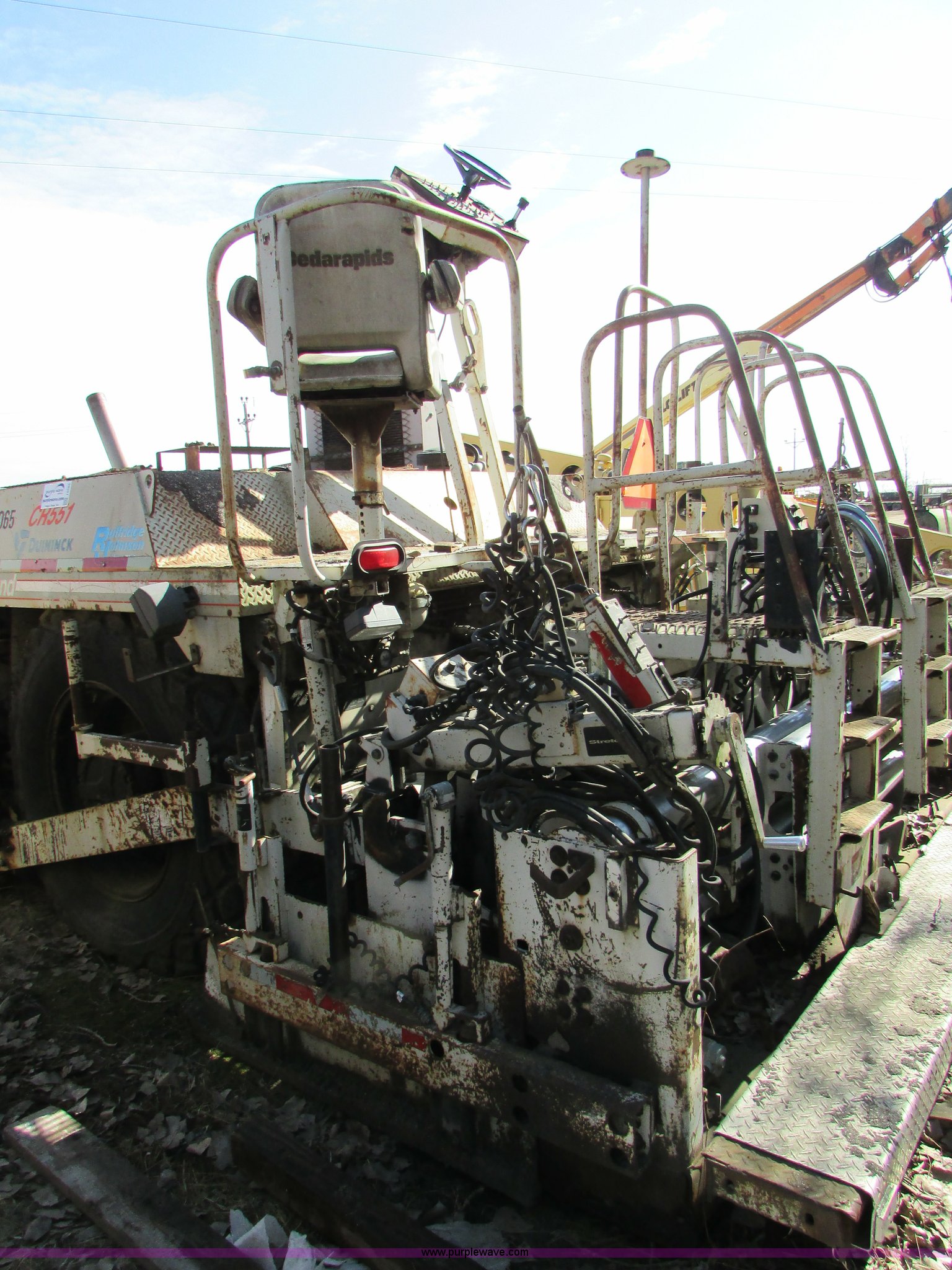 Purple Wave is selling a used Paver or Screed in Minnesota. This item is a Cedarapids CR551 asphalt paver with the following: 10,403 hours on meter, Cummins six cylinder diesel engine, Hydrostatic transmission, Locking differential, Dual operator stations, 10' hopper, Dual chain interior, 16" auger discharge, Dual burners, Individual burner control, Adjustable conveyor control, Adjustable hopper, Stretch 20 hydraulic screed, Model 937990, Serial 44669, 24.5-32 tires, Serial 44669, Unit# 65