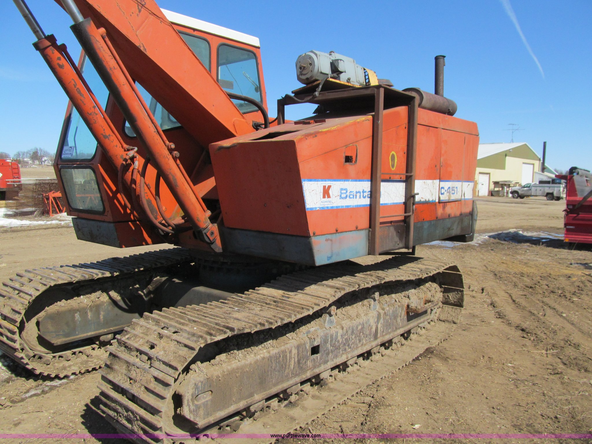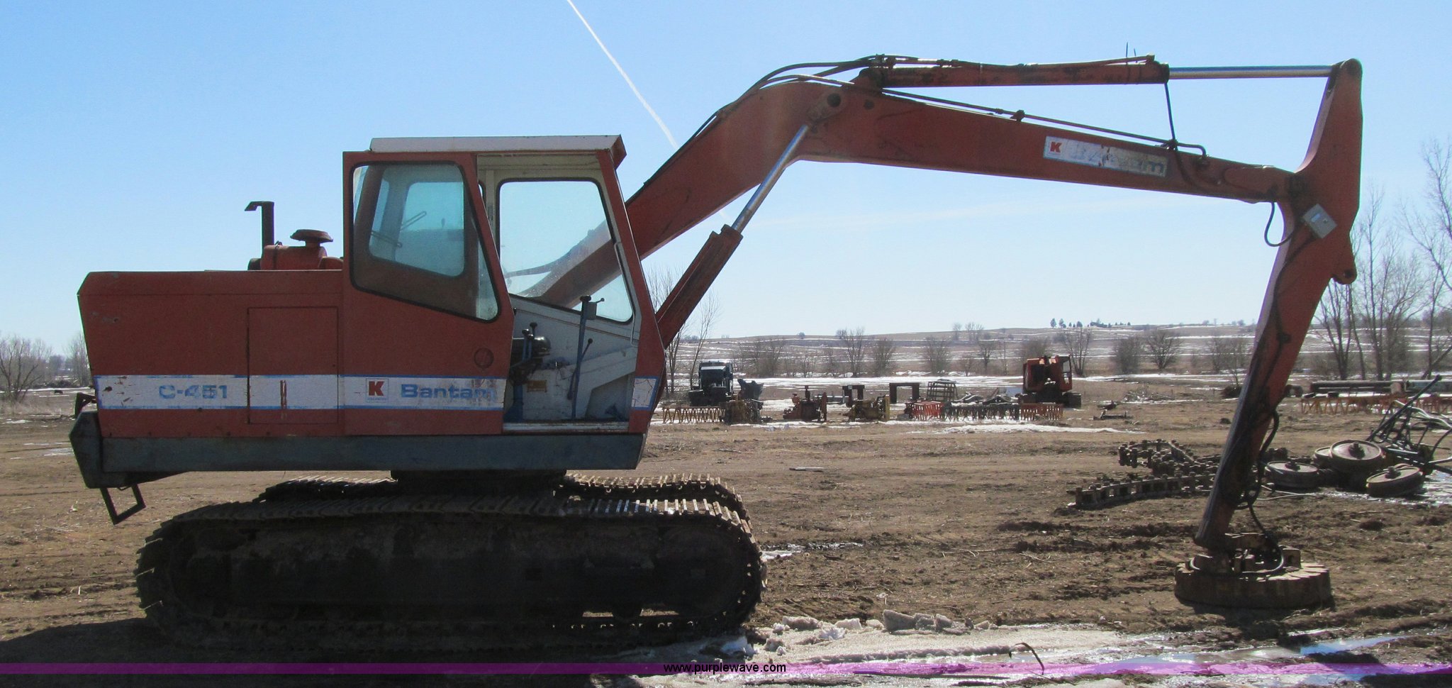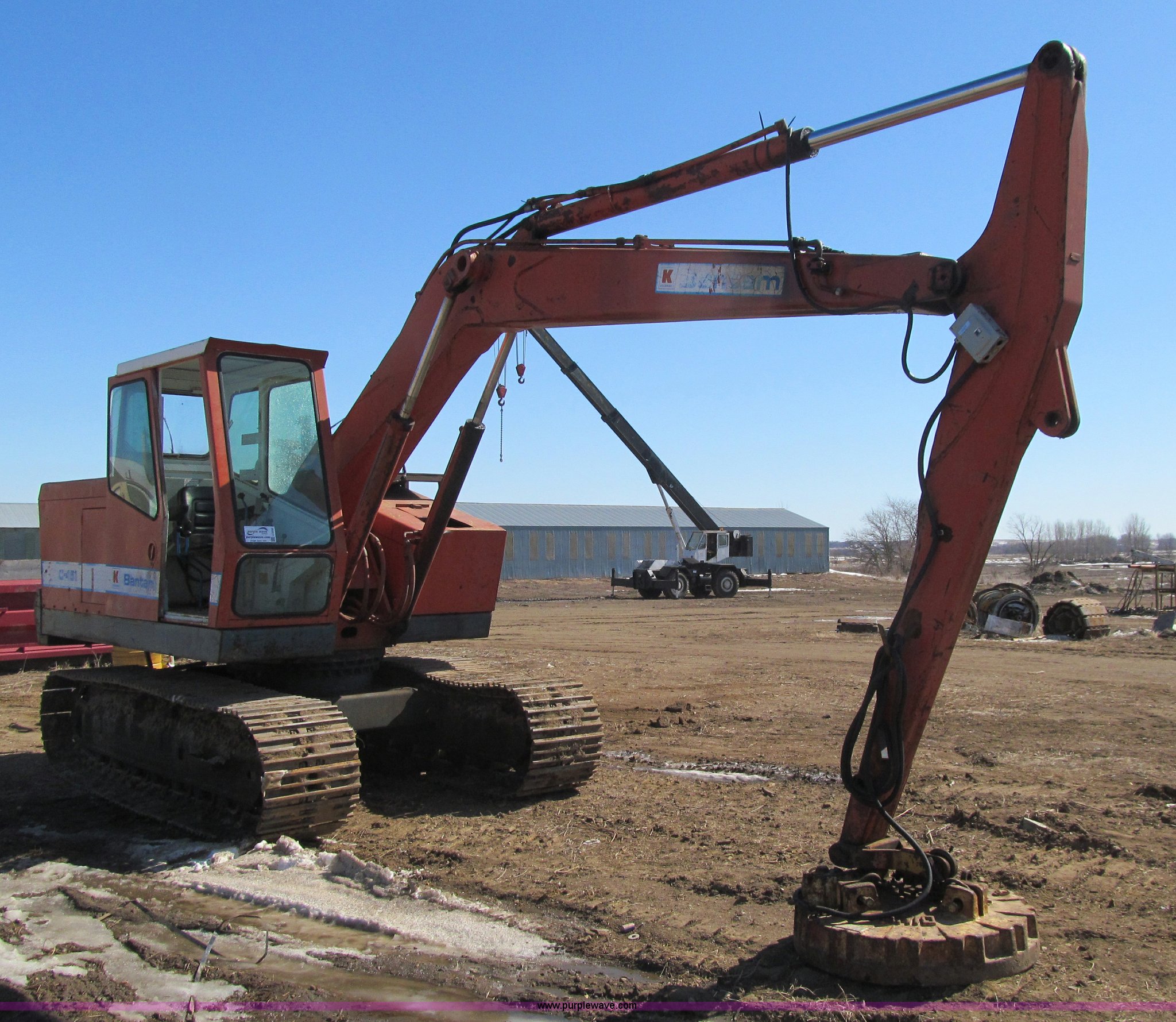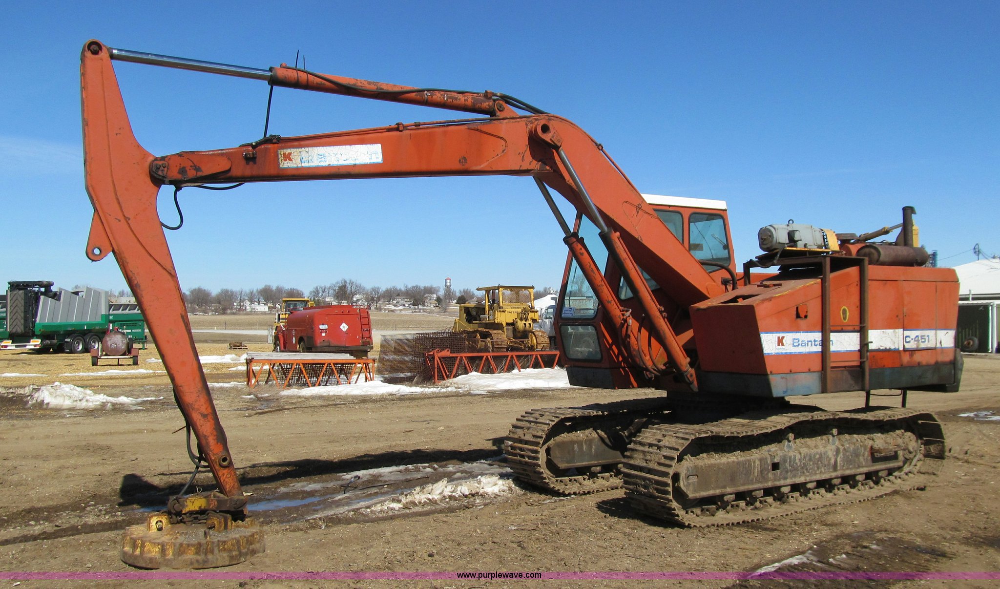 Purple Wave is selling a used Hydraulic Excavator in Iowa. This item is a Bantam C451 excavator with electromagnet with the following: Detroit Diesel four cylinder diesel engine, Enclosed cab, Hand controls, Square D magnet controller, Hydrostatic travel, 96" stick length, Ohio 40" electromagnet, Seven bottom rollers, 24" triple grouser track pads, No bucket cylinder, bucket linkage, bucket, Serial C451-372