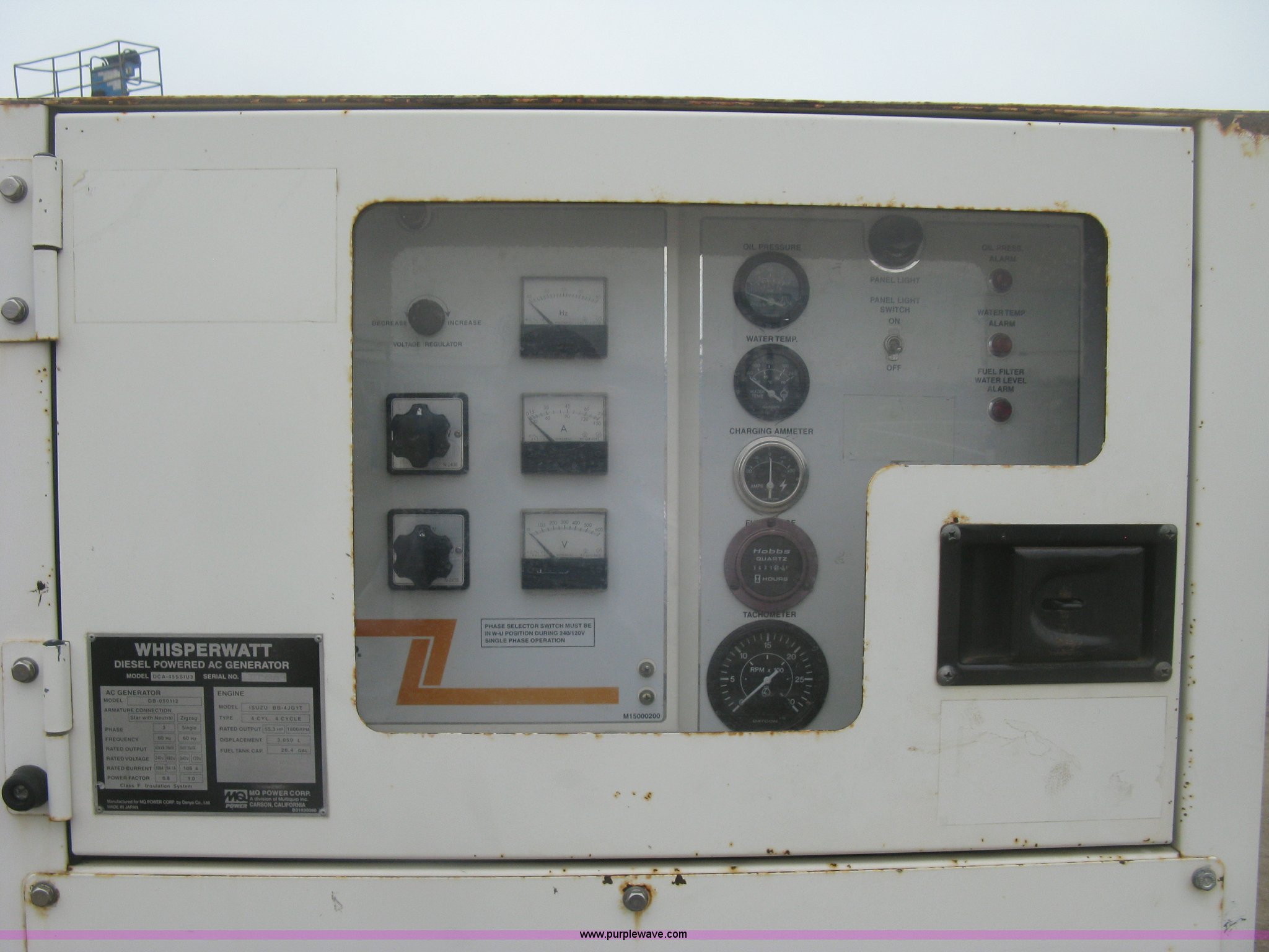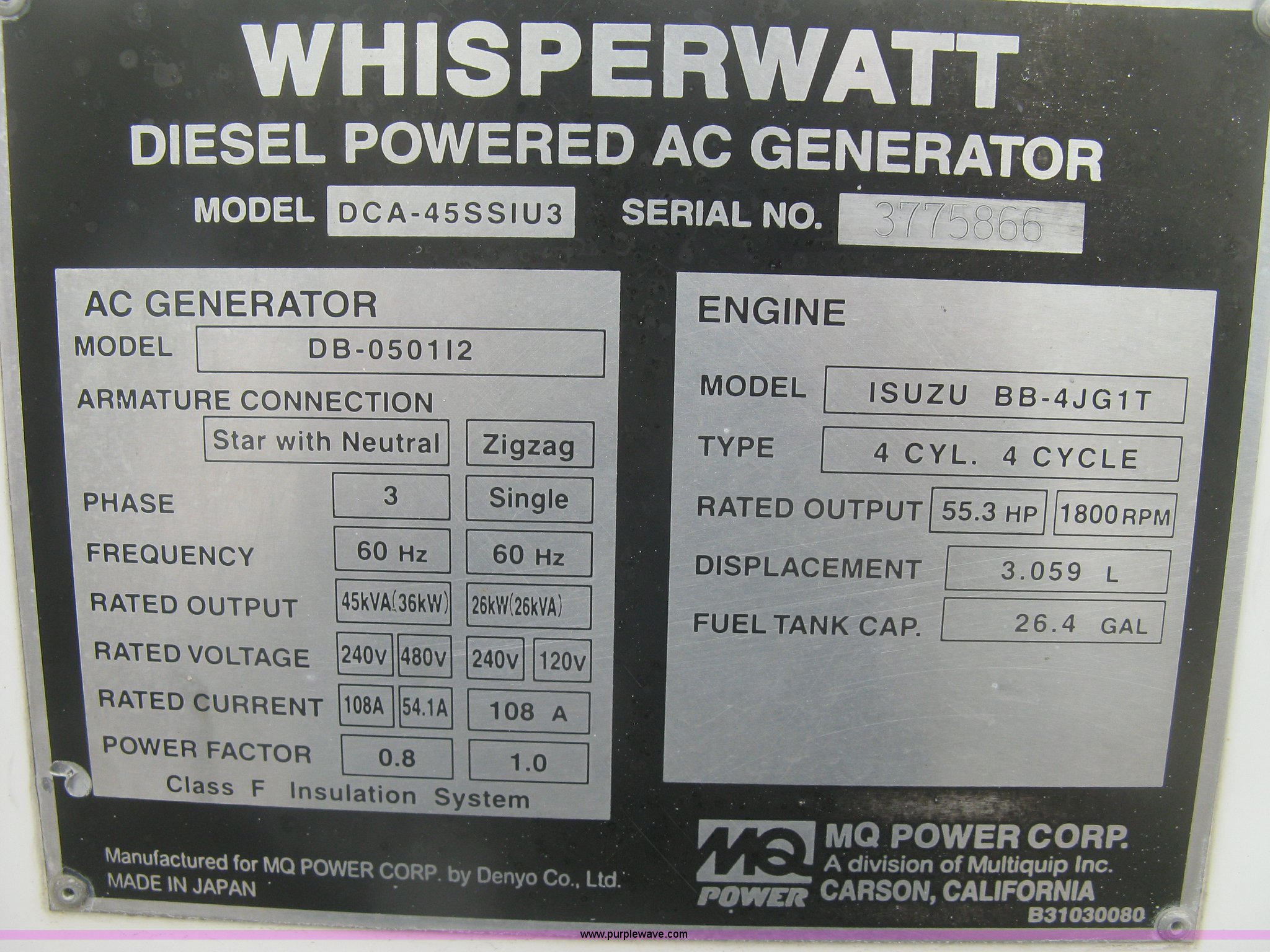 Purple Wave is selling a used Generator Set in Kansas. This item is a 2006 MQ Whisperwatt 45 generator with the following: 3,341 hours on meter, Isuzu BB-4JG1T four cylinder diesel engine, 45 KVA AC generator, Modle DB-050112, Single and three phase application, 52 gallon auxiliary fuel tank, Surge brakes, 1 /78" and 2" ball hitch, ST205/75D14 tires, Serial DCA-45SS1U3