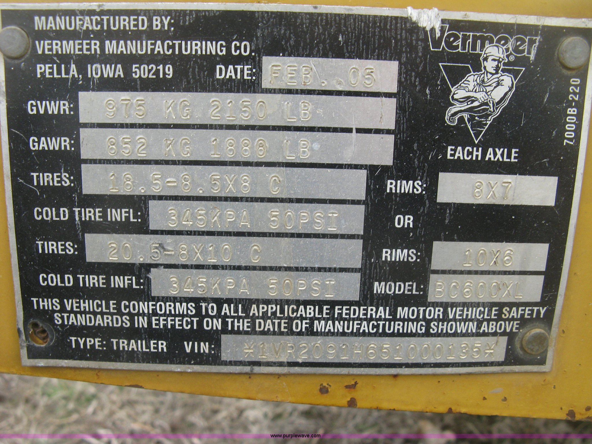 Purple Wave is selling a used Wood Chipper or Stump Grinder in Kansas. This item is a 2005 Vermeer BC600XL wood chipper with the following: 1,055 hours on meter, Kohler Command Pro 27 gas engine, Auto Feed II hopper, Oscillating discharge chute, 6" x 6" infeed opening, 2" ball hitch, Removable tongue, 18.5 x 8.5-8 tires, Unused replacement knives, Serial 1VR2091H651000135