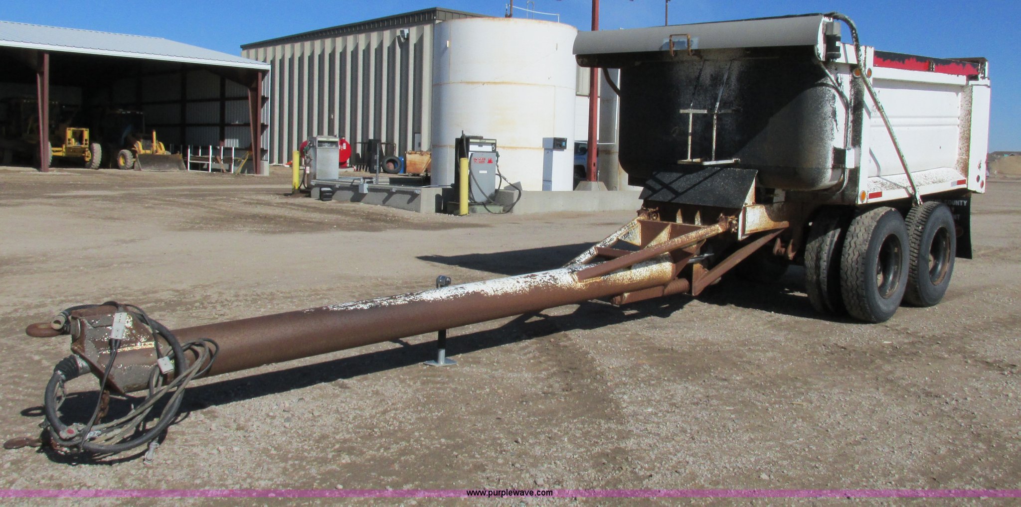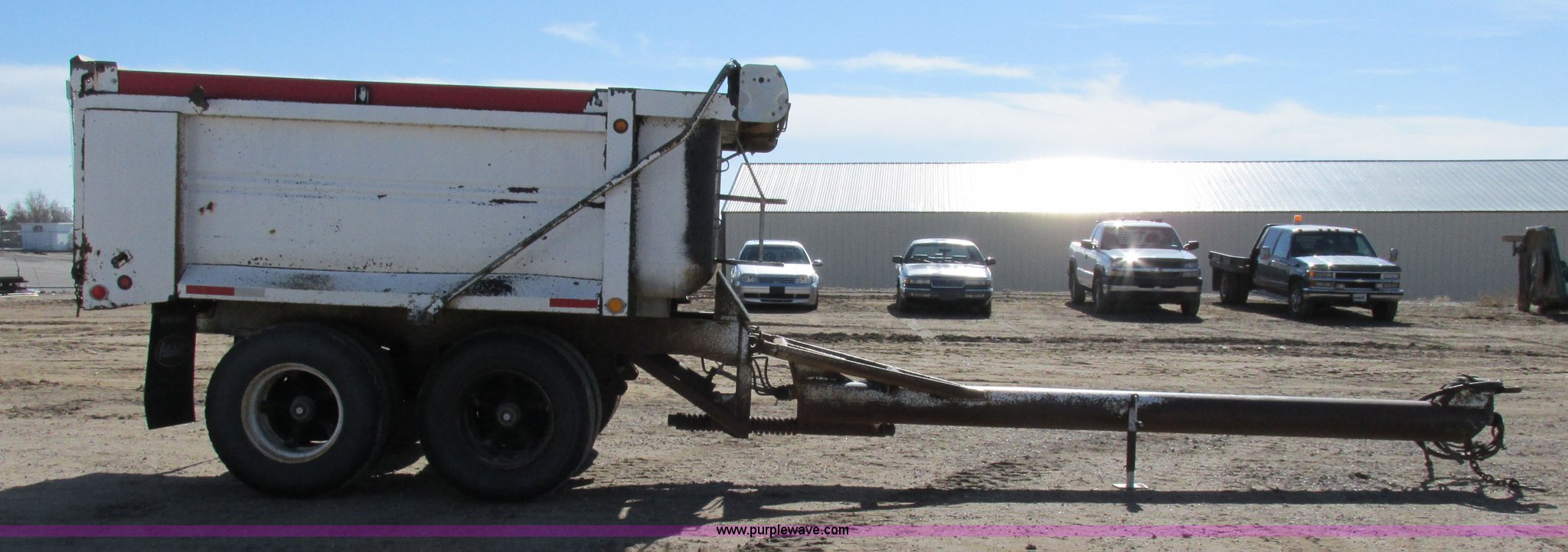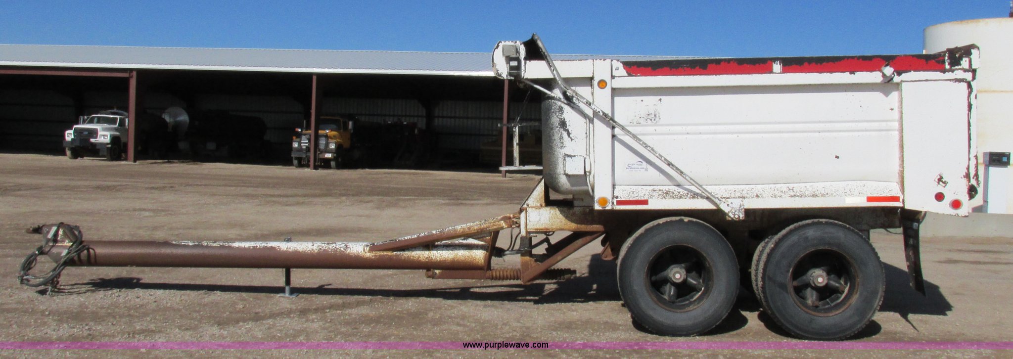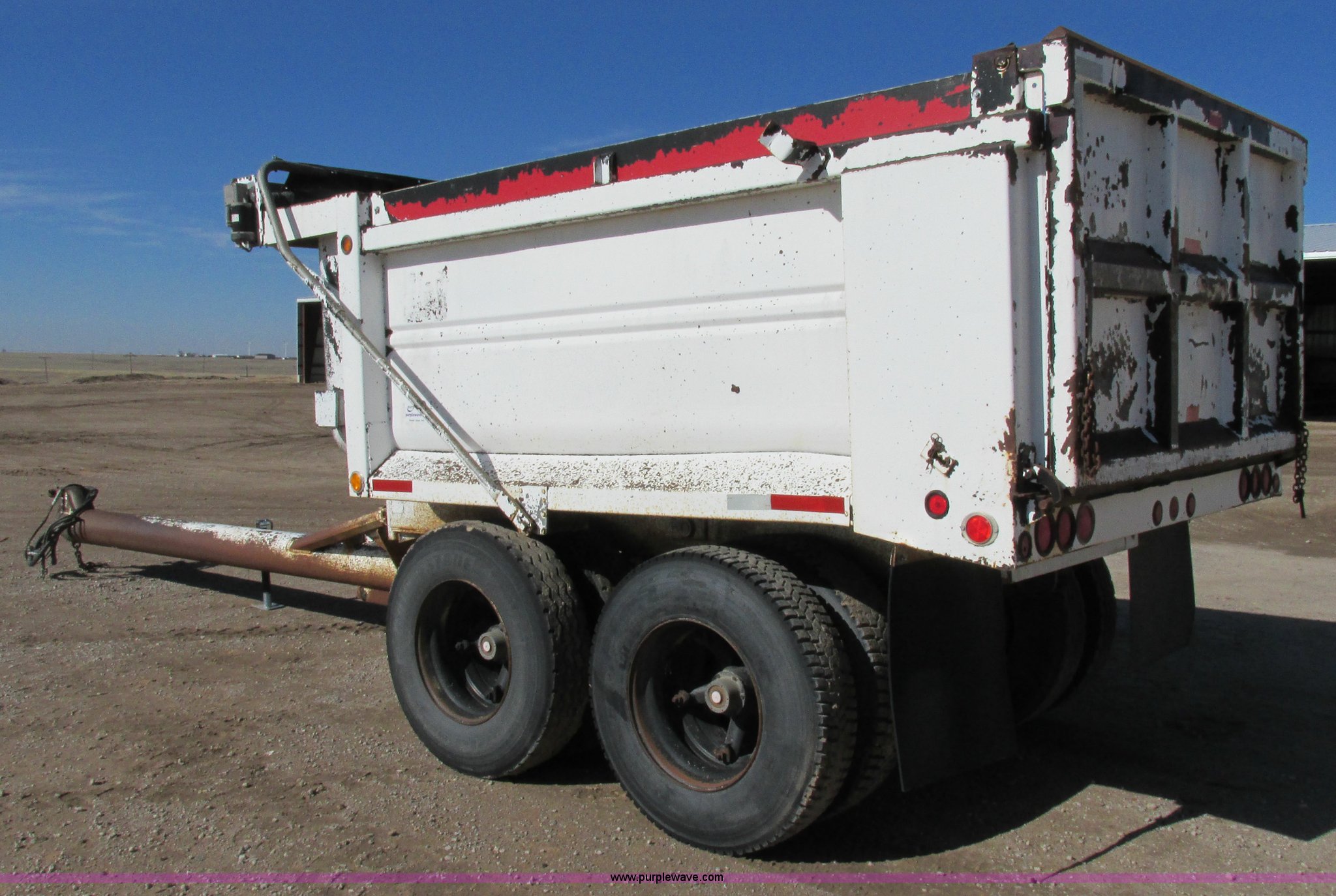 Purple Wave is selling a used Dump Trailer in Kansas. This item is a 1983 Clement end dump pup trailer with the following: 12'L x 86"W x 48"H, Approx. 12 to 13 yard capacity, Rounded floor corners, Air operated end gate, Aero electric rollover tarp, Single hydraulic ram, 17'L tongue, Pintle hitch, Spring suspension, Air brakes, 11R22.5 tires