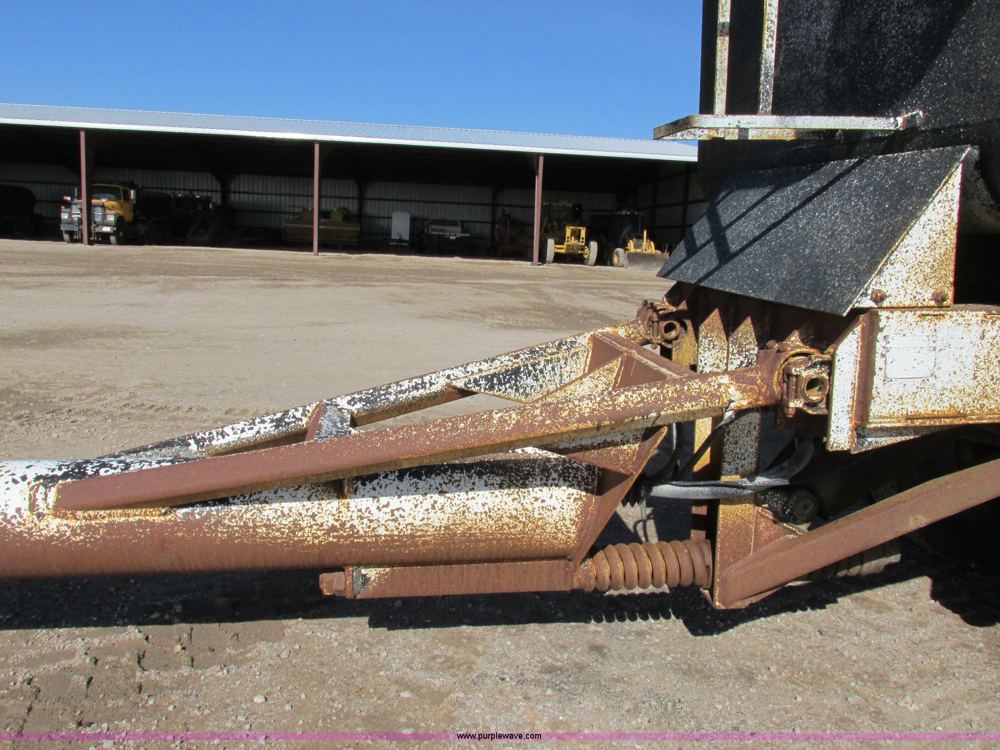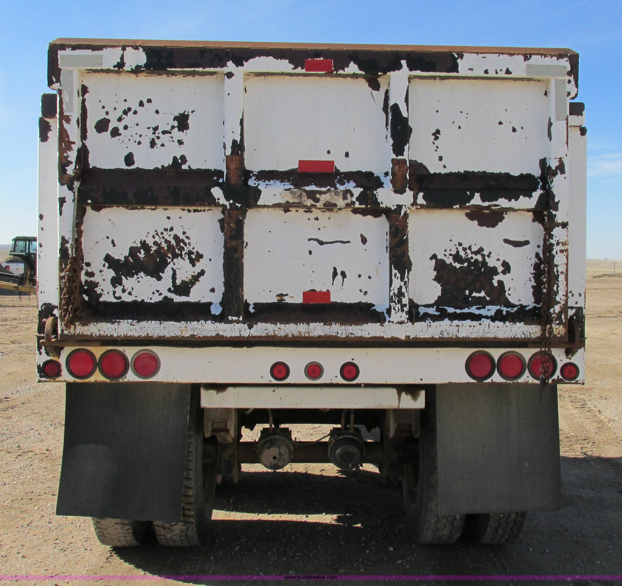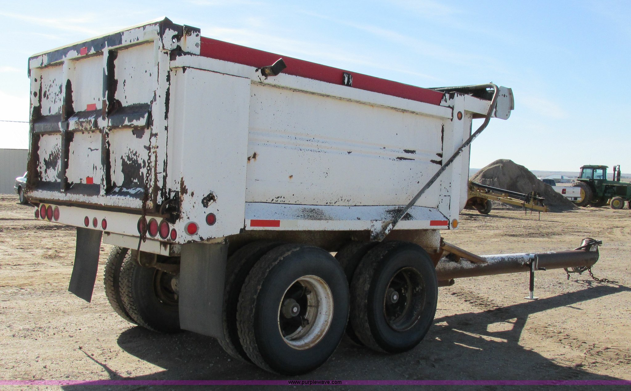 Purple Wave is selling a used Dump Trailer in Kansas. This item is a 1983 Clement end dump pup trailer with the following: 12'L x 86"W x 48"H, Approx. 12 to 13 yard capacity, Rounded floor corners, Air operated end gate, Aero electric rollover tarp, Single hydraulic ram, 17'L tongue, Pintle hitch, Spring suspension, Air brakes, 11R22.5 tires