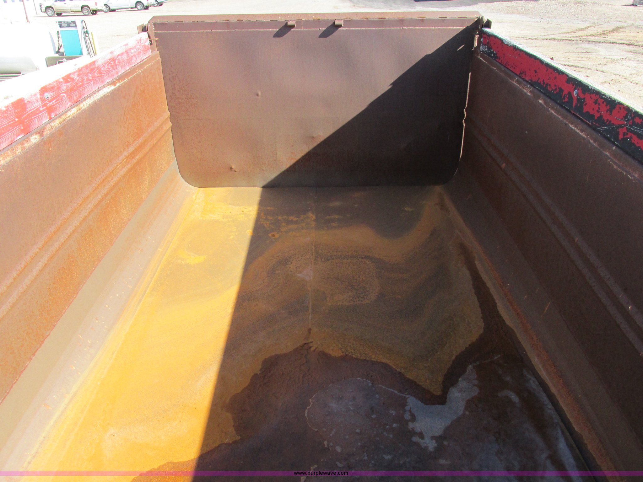 1983 Clement end dump pup trailer. 12'L x 86"W x 48"H, Approx. 12 to 13 yard capacity, Rounded floor corners, Air operated end gate, Aero electric rollover tarp, Single hydraulic ram, 17'L tongue, Pintle hitch, Spring suspension, Air brakes, 11R22.5 tires. 1C9DB12BXDM110238. Gray County. 915 N Main. Cimmaron, KS 67835