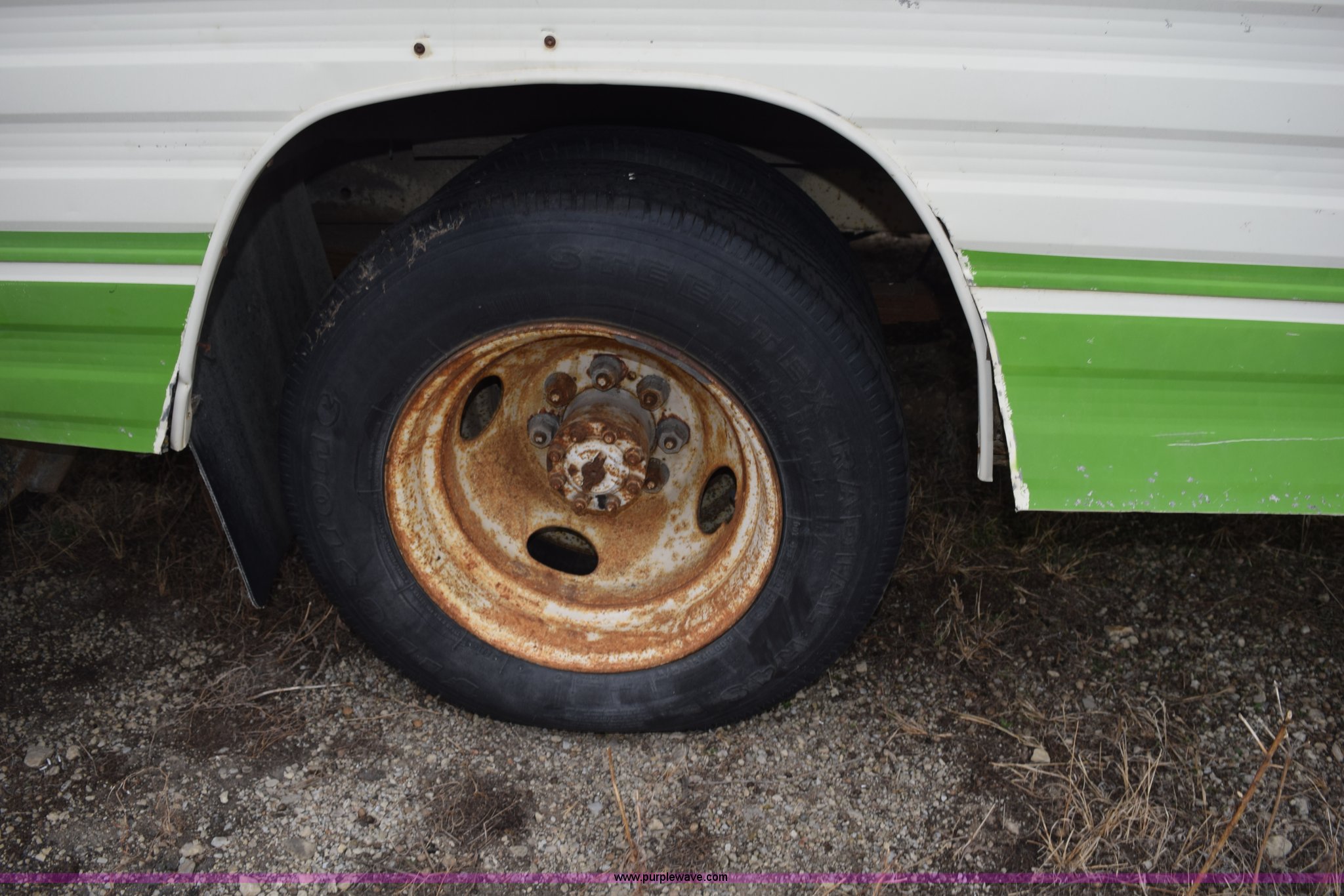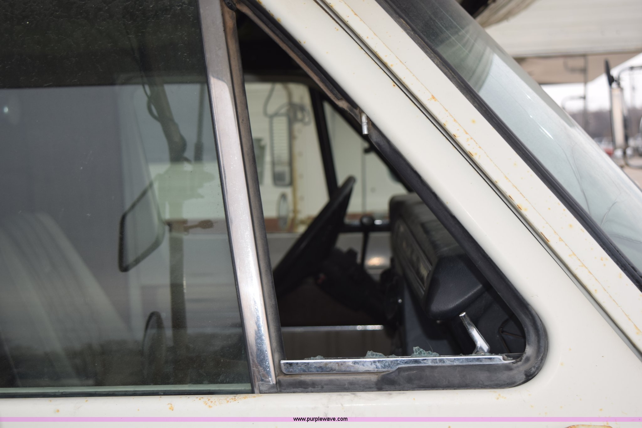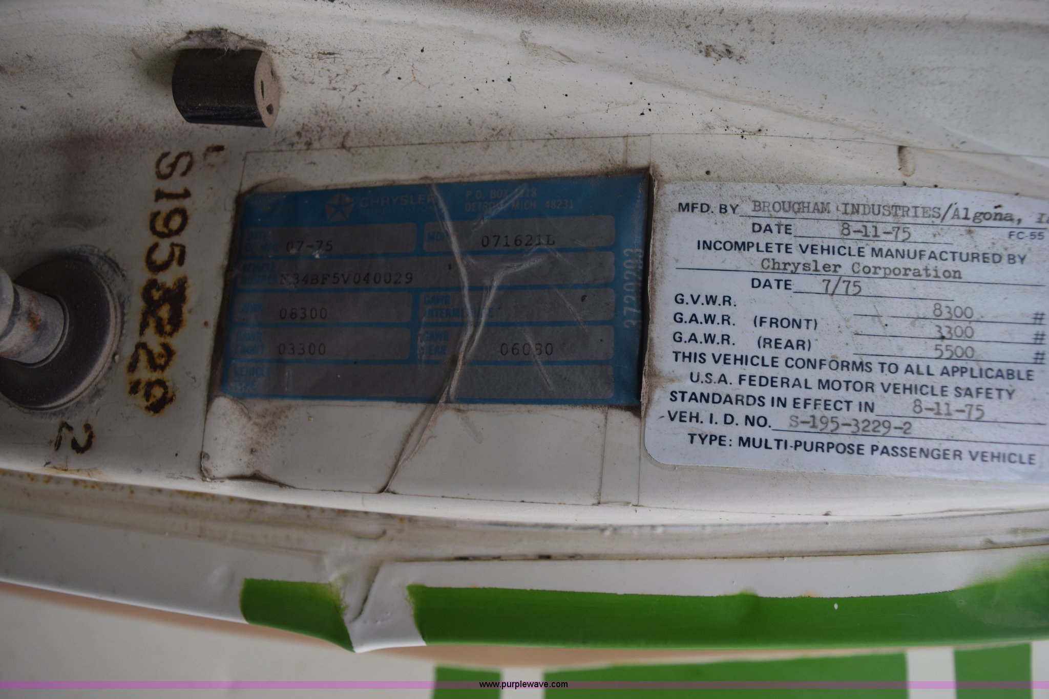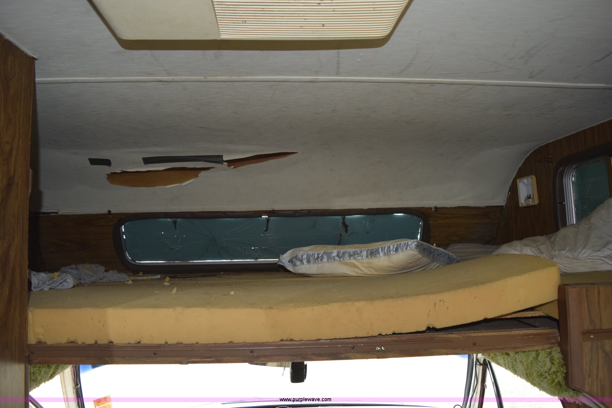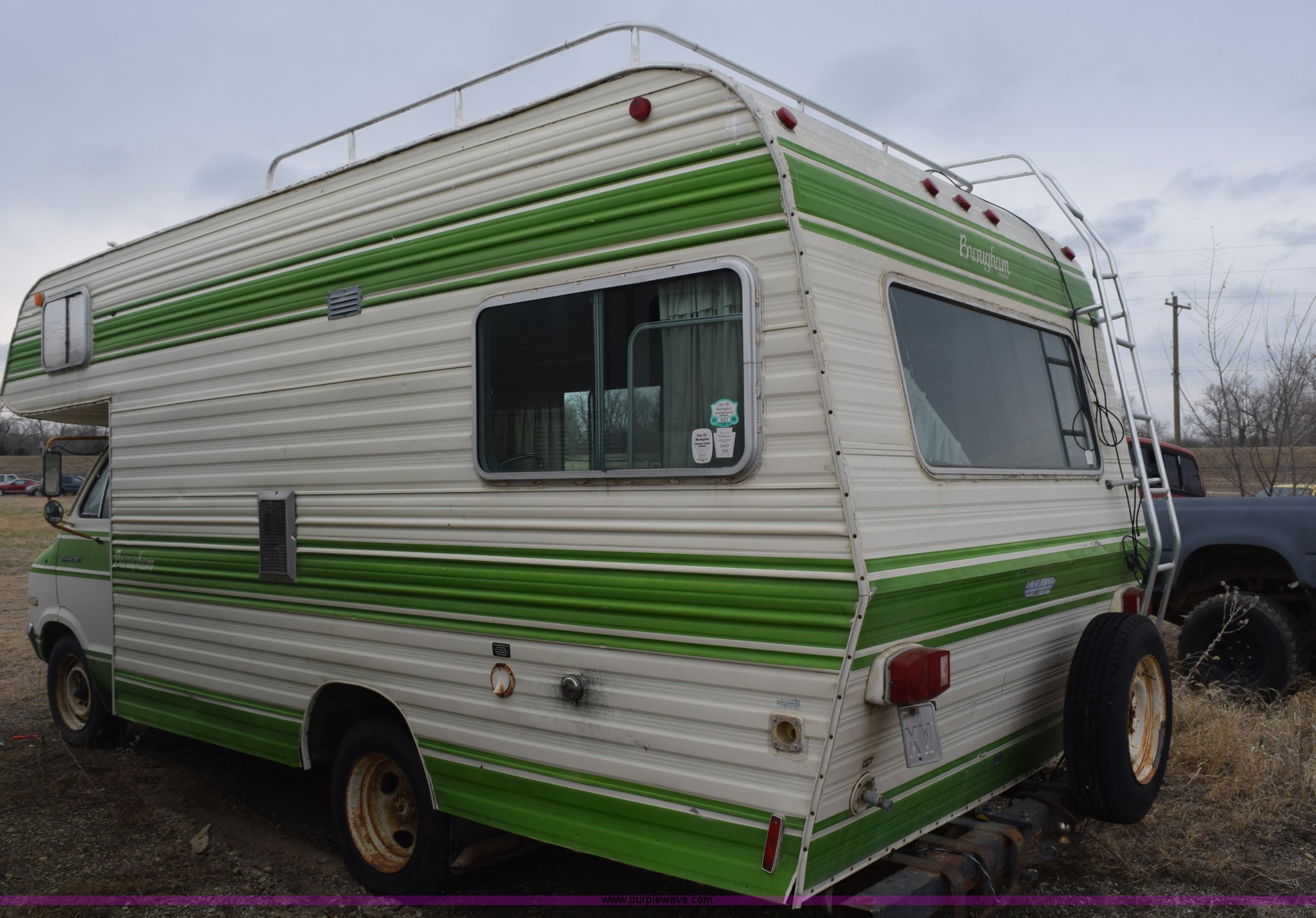 Purple Wave is selling a used RV in Kansas. This item is a 1975 Dodge Sportsman camper with the following: V8 gas engine, Automatic transmission, AC and heat, Cruise, AM/FM/CD, Manual windows and locks, Bathroom, Refrigerator, 8.00-16.5 tires, Windshield cracked, Water damage, No keys, Interior/exterior cosmetic damage, Unknown operating condition