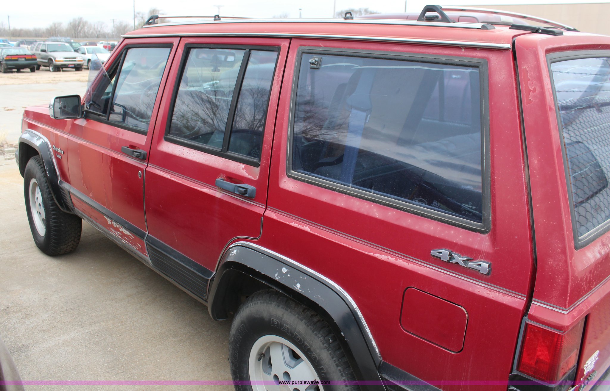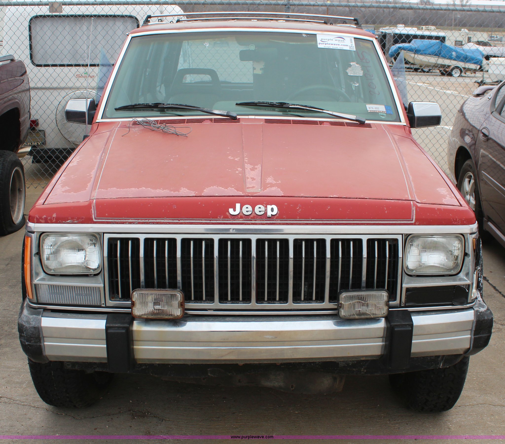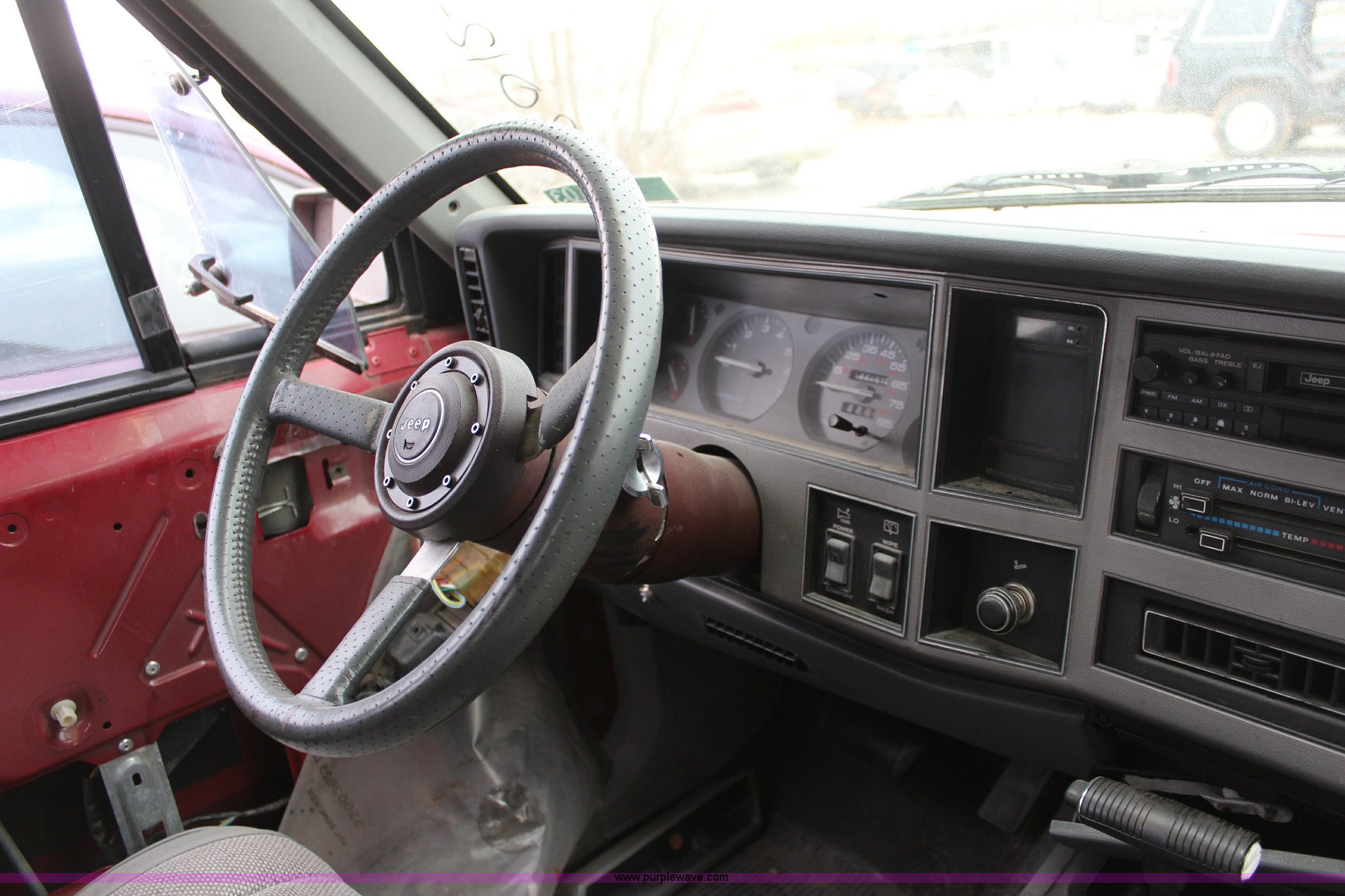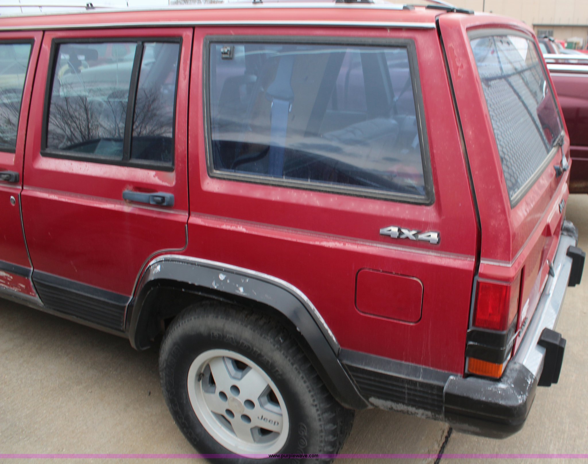Purple Wave is selling a used Passenger Vehicle in Kansas. This item is a 1990 Jeep Cherokee SUV with the following: 144,167 miles on odometer, 4.0L L6 OHV 12V gas engine, Automatic transmission, Tilt, AM/FM/Cassette, Power windows and locks, Cloth interior, Receiver hitch, 235/75R15 tires, No keys, Interior/exterior cosmetic damage, Unknown operating condition, Unit# 2012-165