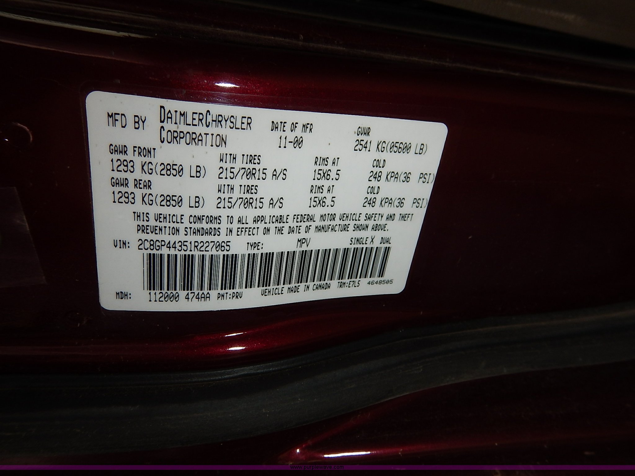 2001 Chrysler Town & Country LX. Unknown miles on odometer, 3.3L V6 OHV 12V FFV gas engine, Automatic transmission, AC and heat , Tilt, Cruise, AM/FM/Cassette, Power windows, seats, locks and mirrors, Cloth interior , 215/65R16 tire size, No keys, Unknown operating condition , Interior/exterior cosmetic damage, Unit# AV2014058. Vehicle abandoned. No additional information available.. Buyer will receive paperwork indicating the abandoned status of the vehicle and which is sufficient to receive a title.. See removal details below. 2C8GP44351R227065. NAFI Abandoned Vehicles. H Street. Fort Riley, KS 66442
