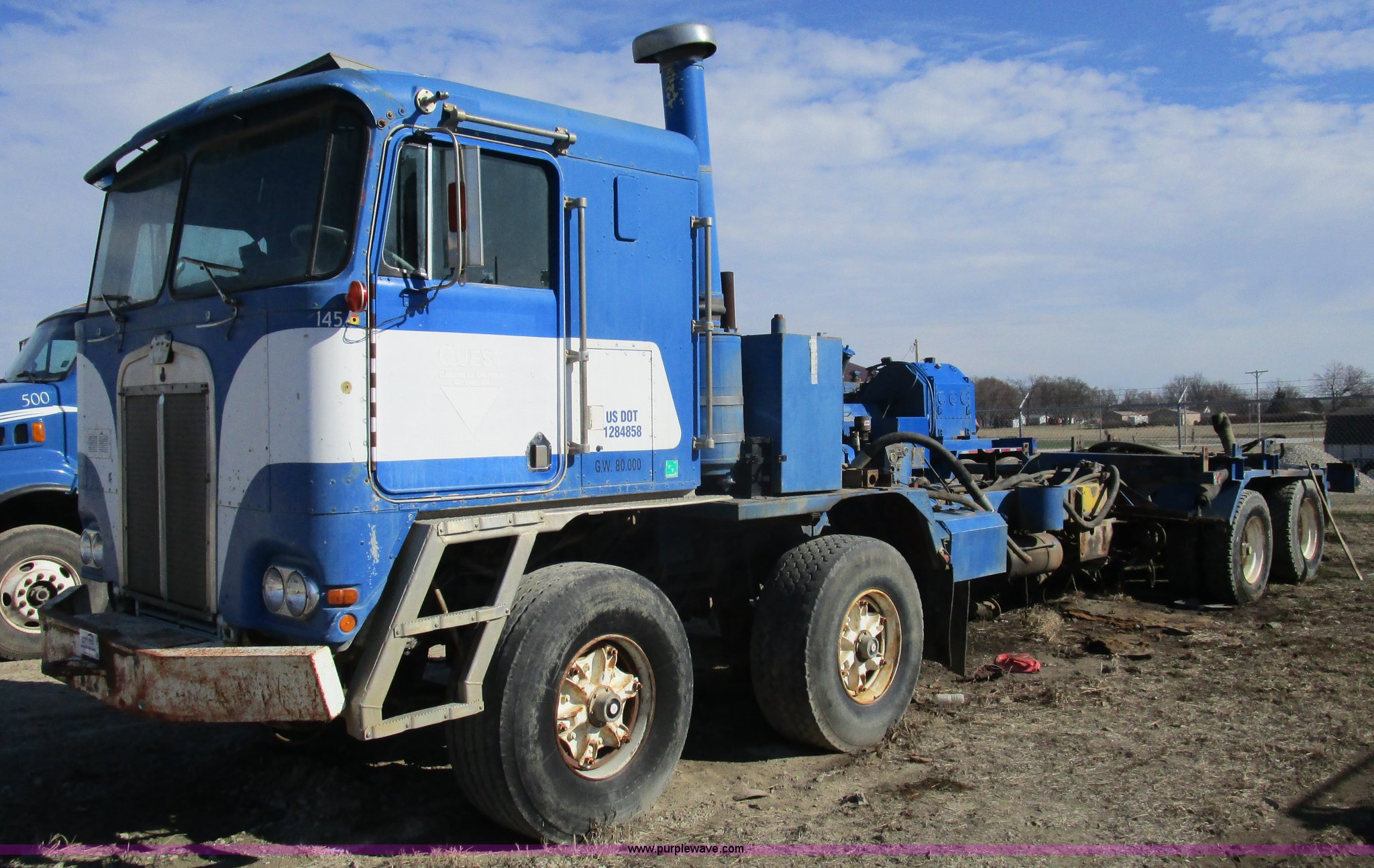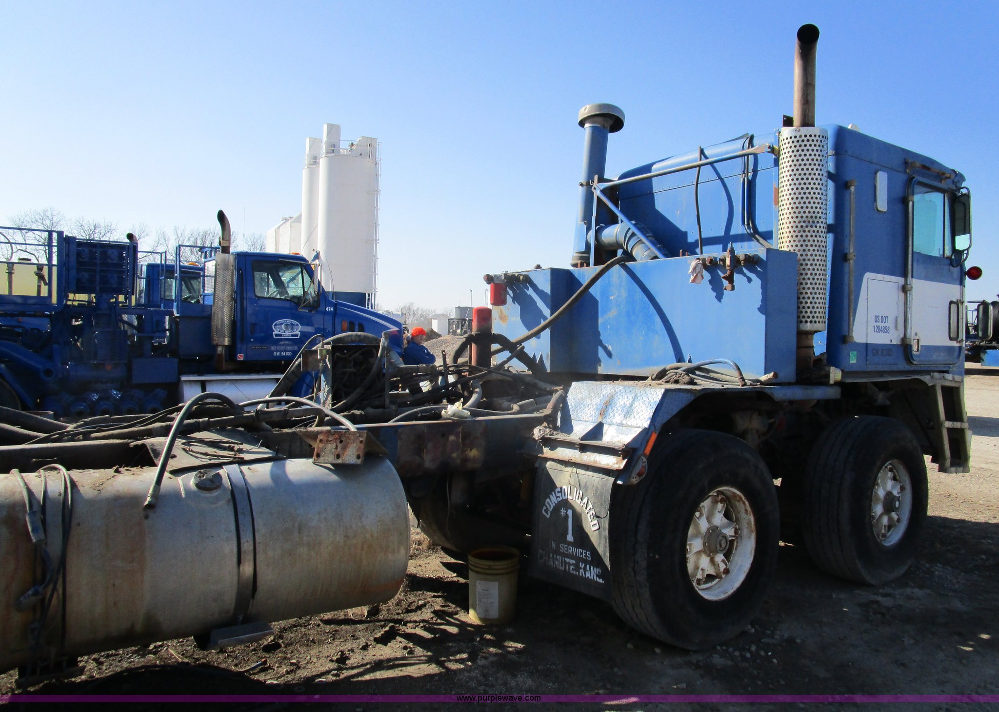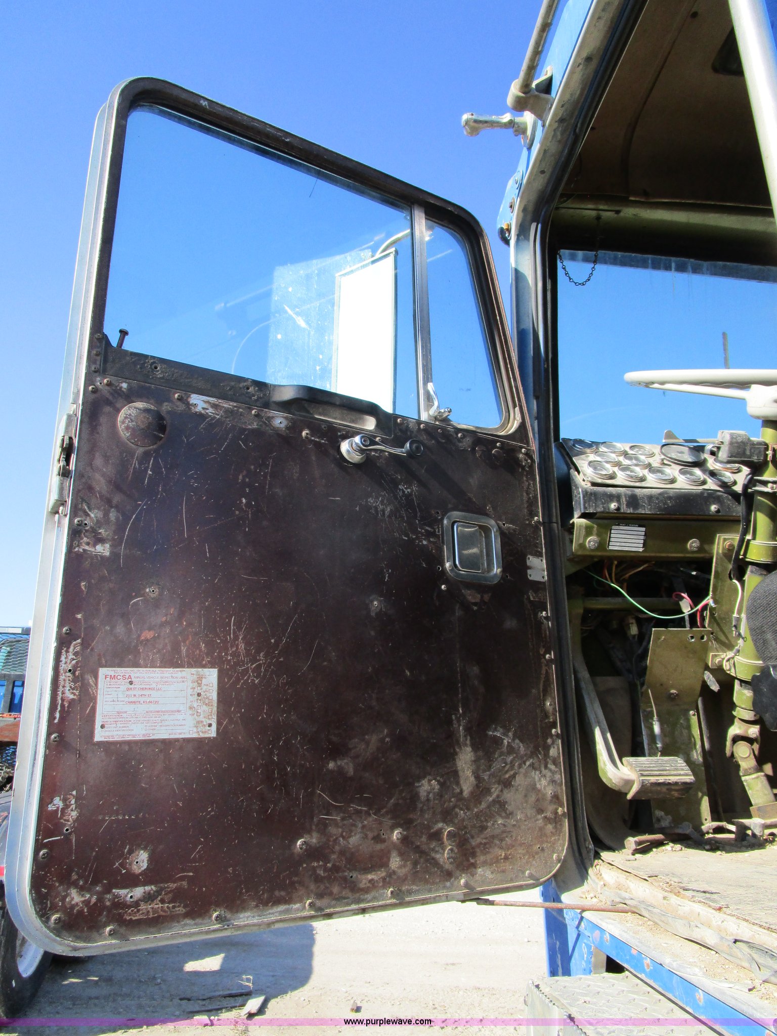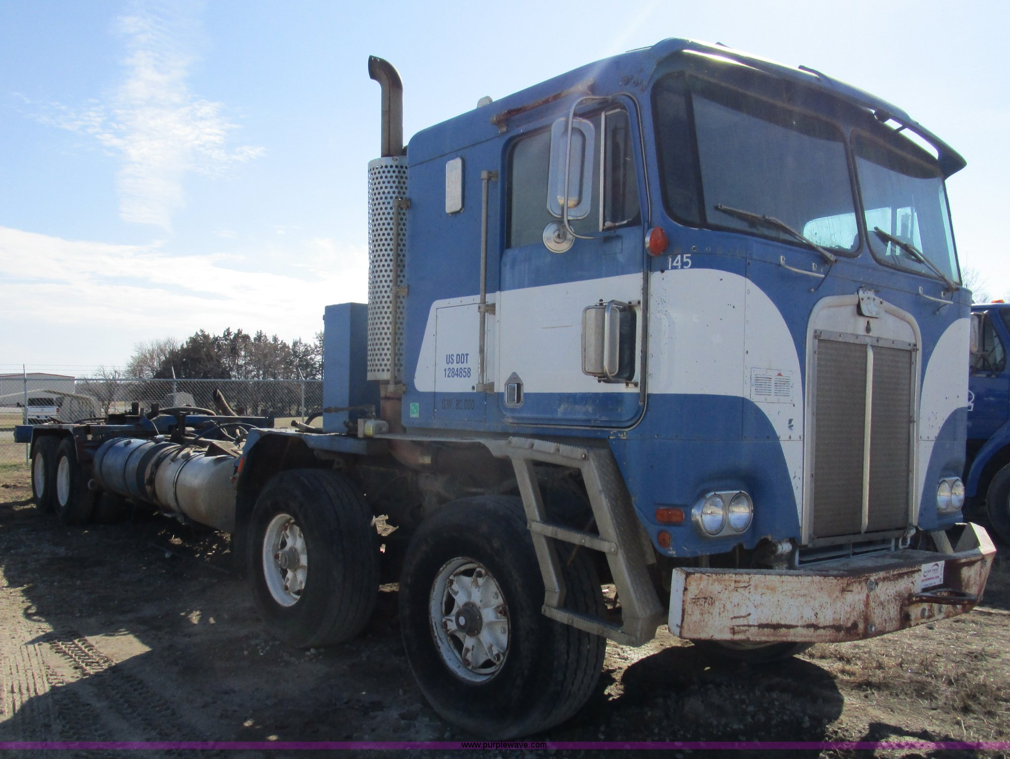 Purple Wave is selling a used Truck Tractor in Kansas. This item is a 1980 Kenworth K100 semi truck with the following: 799,280 miles on odometer, 4,073 hours on meter, Caterpillar 3406 diesel engine, 13 speed manual transmission, Deep reduction, Heat, AM/FM/cassette, Passenger daylight door, PTO, 120 gallon fuel tank, Full steel fenders, Single rear exhaust stack, Spring suspension, Air brakes, Trailer brake controller, Jake brake, Dual steer axles, 485/65R22.5 front tires, 11R22.5 rear tires, Non-operational starter, Drive shaft disconnected, Portion of drive shaft missing, Unit # 145