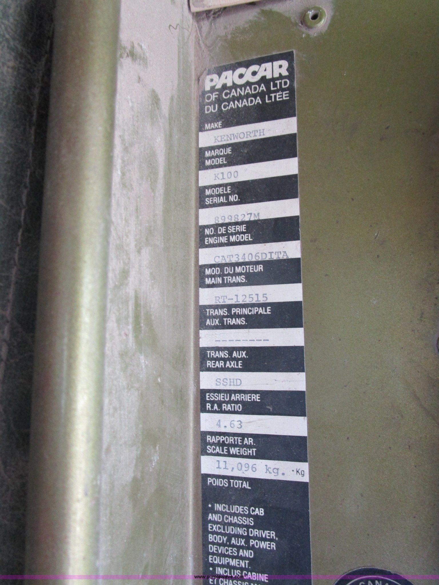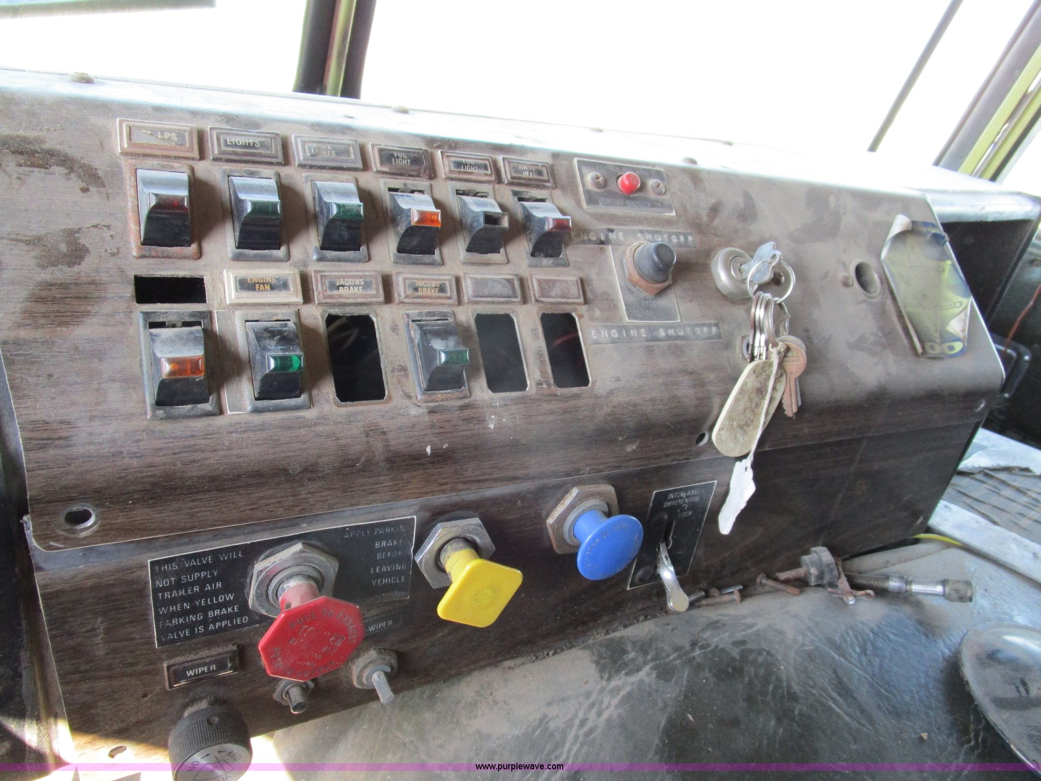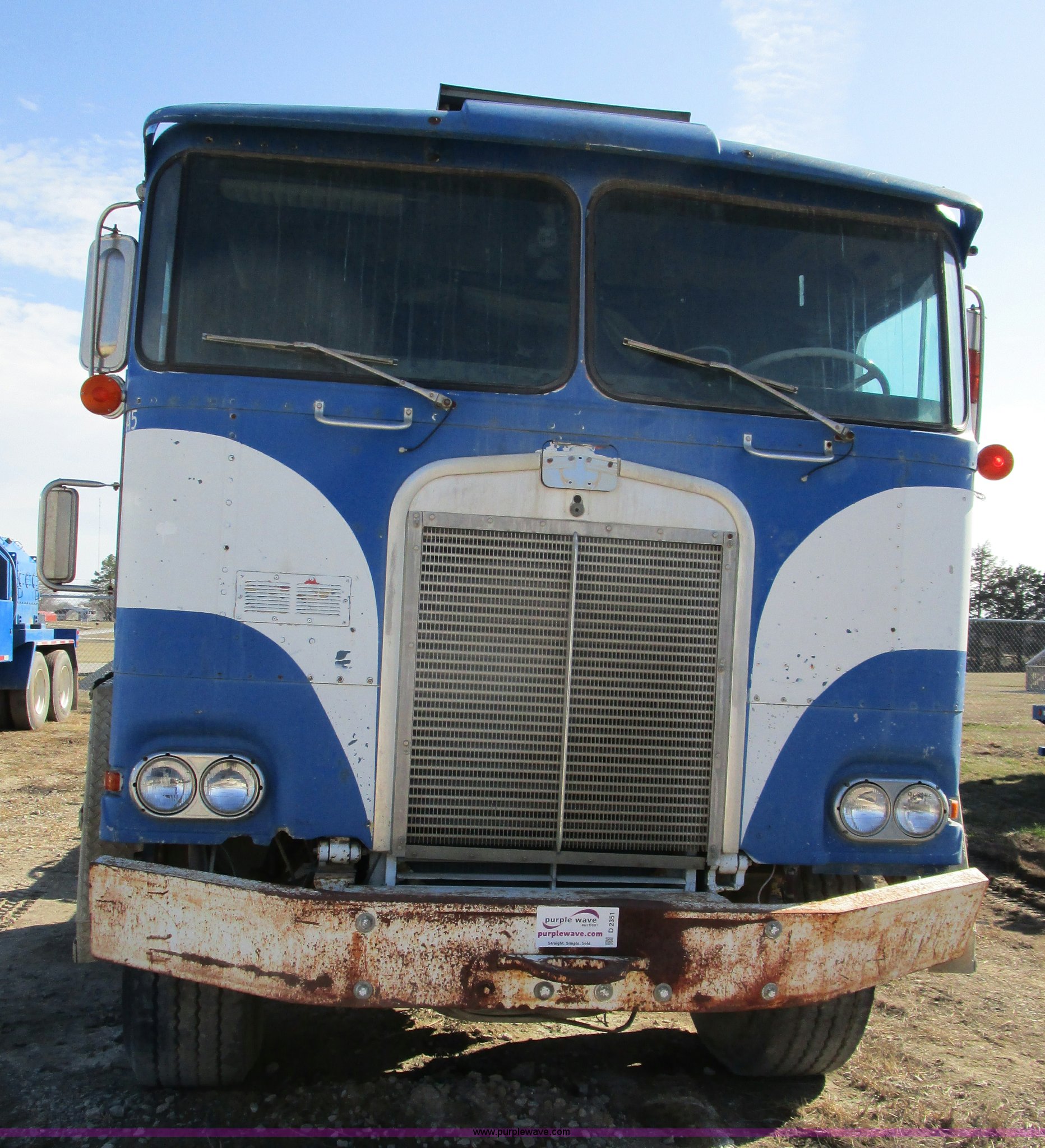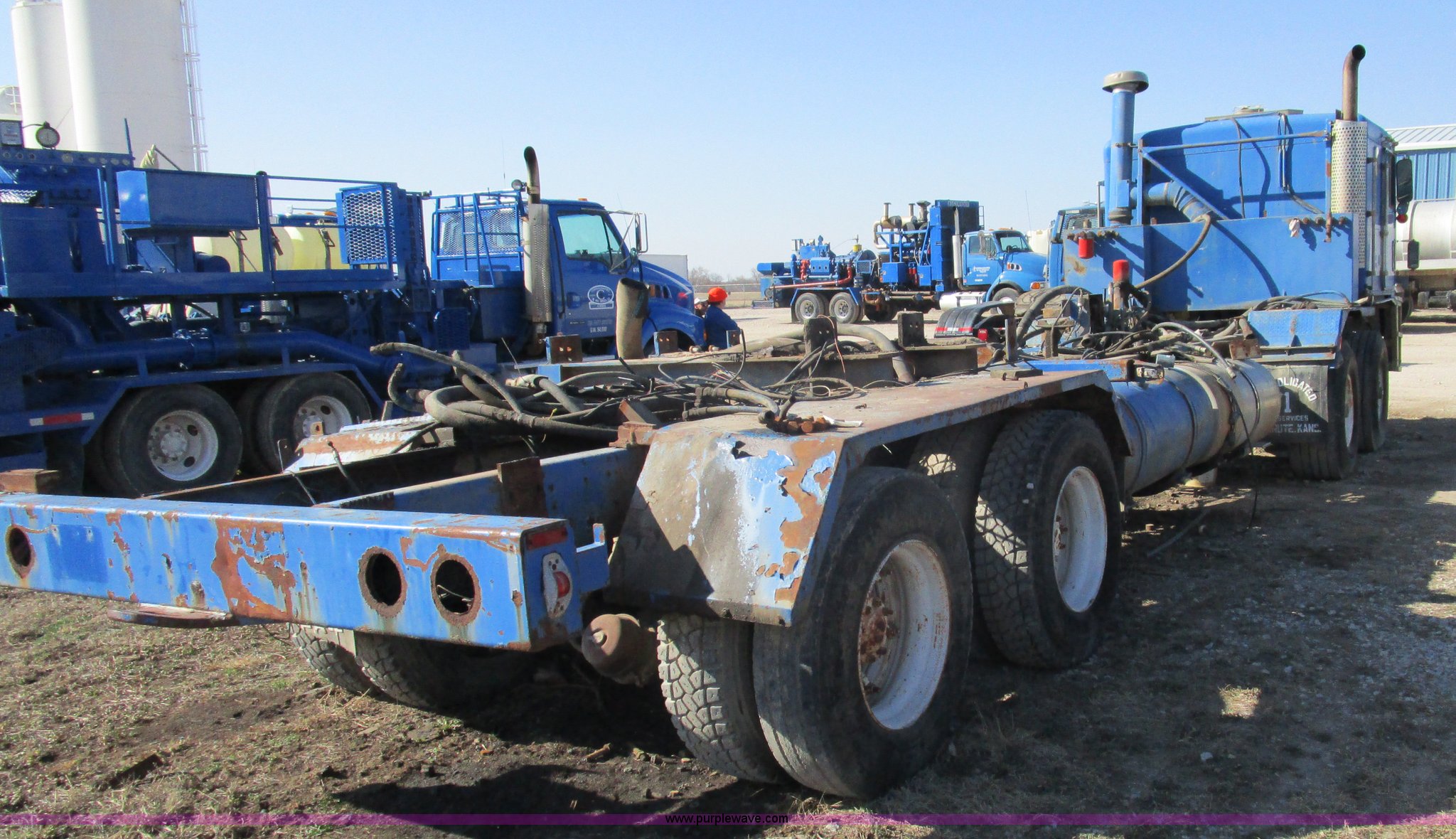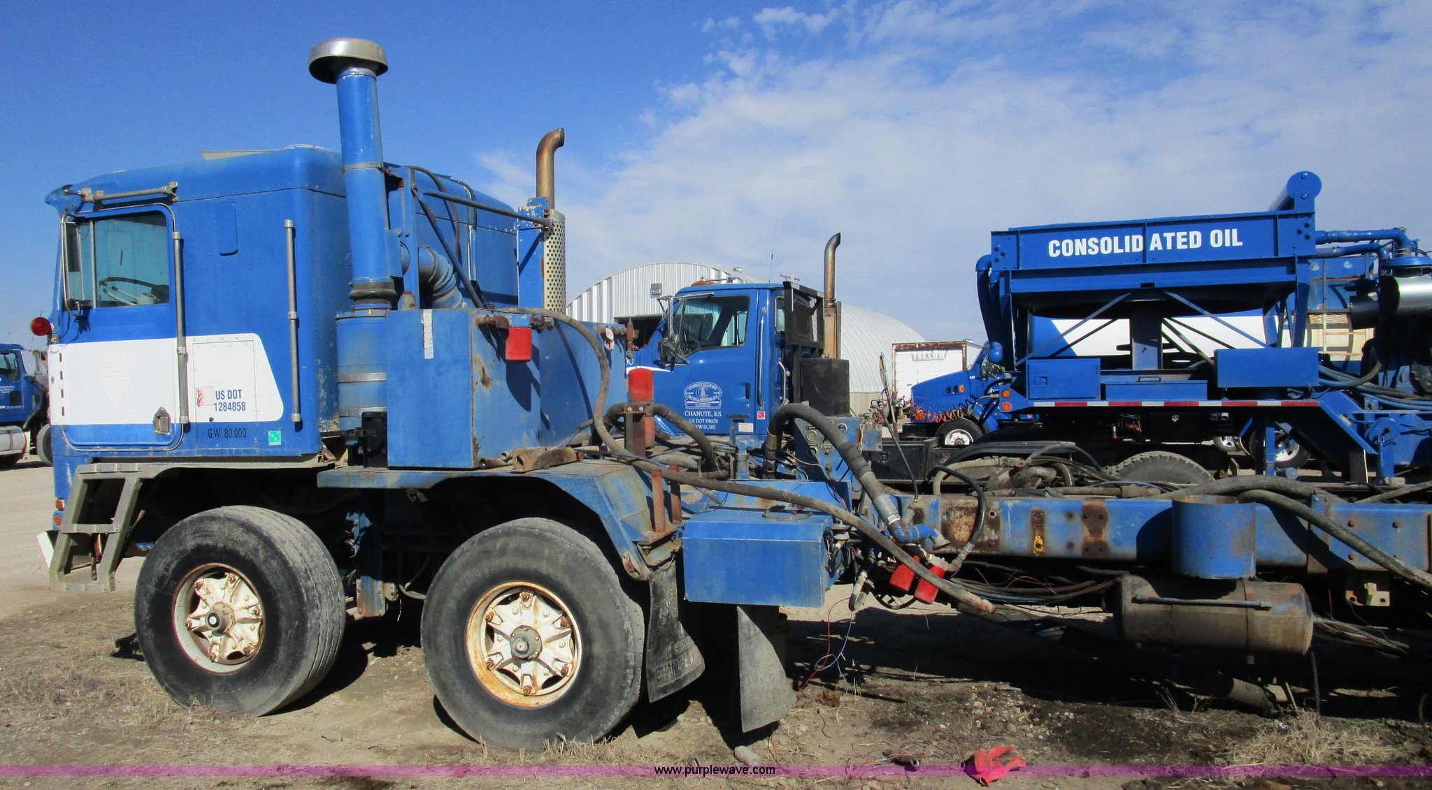Purple Wave is selling a used Truck Tractor in Kansas. This item is a 1980 Kenworth K100 semi truck with the following: 799,280 miles on odometer, 4,073 hours on meter, Caterpillar 3406 diesel engine, 13 speed manual transmission, Deep reduction, Heat, AM/FM/cassette, Passenger daylight door, PTO, 120 gallon fuel tank, Full steel fenders, Single rear exhaust stack, Spring suspension, Air brakes, Trailer brake controller, Jake brake, Dual steer axles, 485/65R22.5 front tires, 11R22.5 rear tires, Non-operational starter, Drive shaft disconnected, Portion of drive shaft missing, Unit # 145