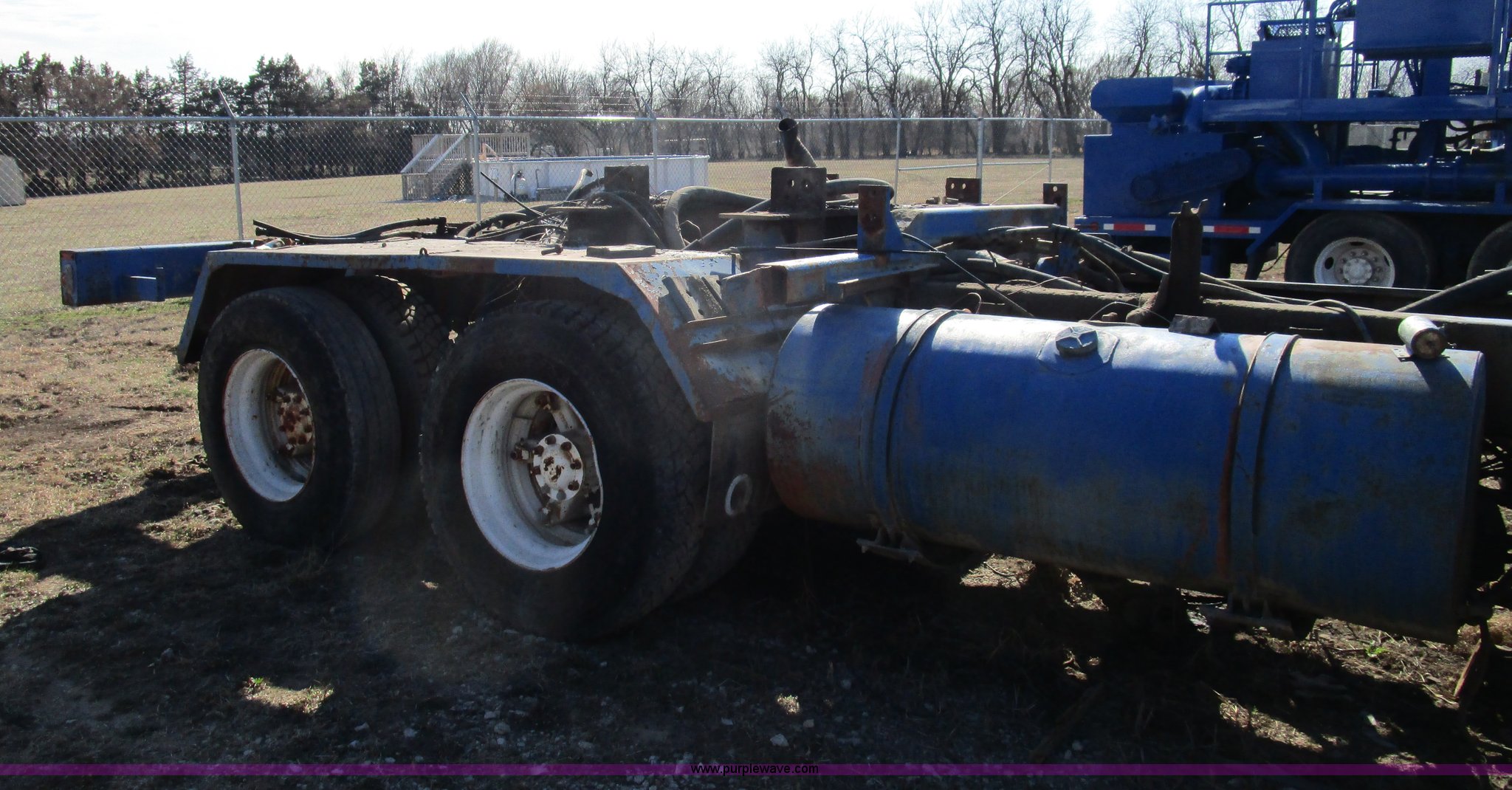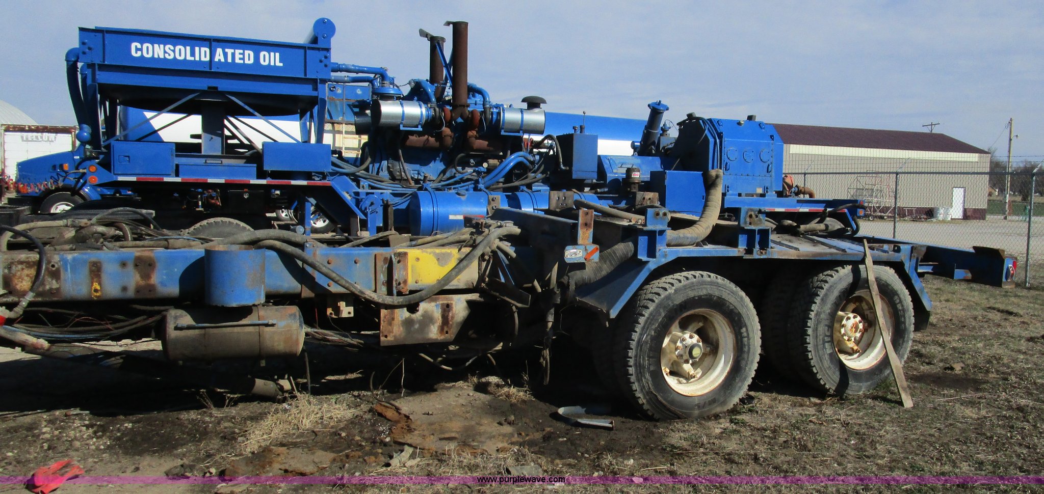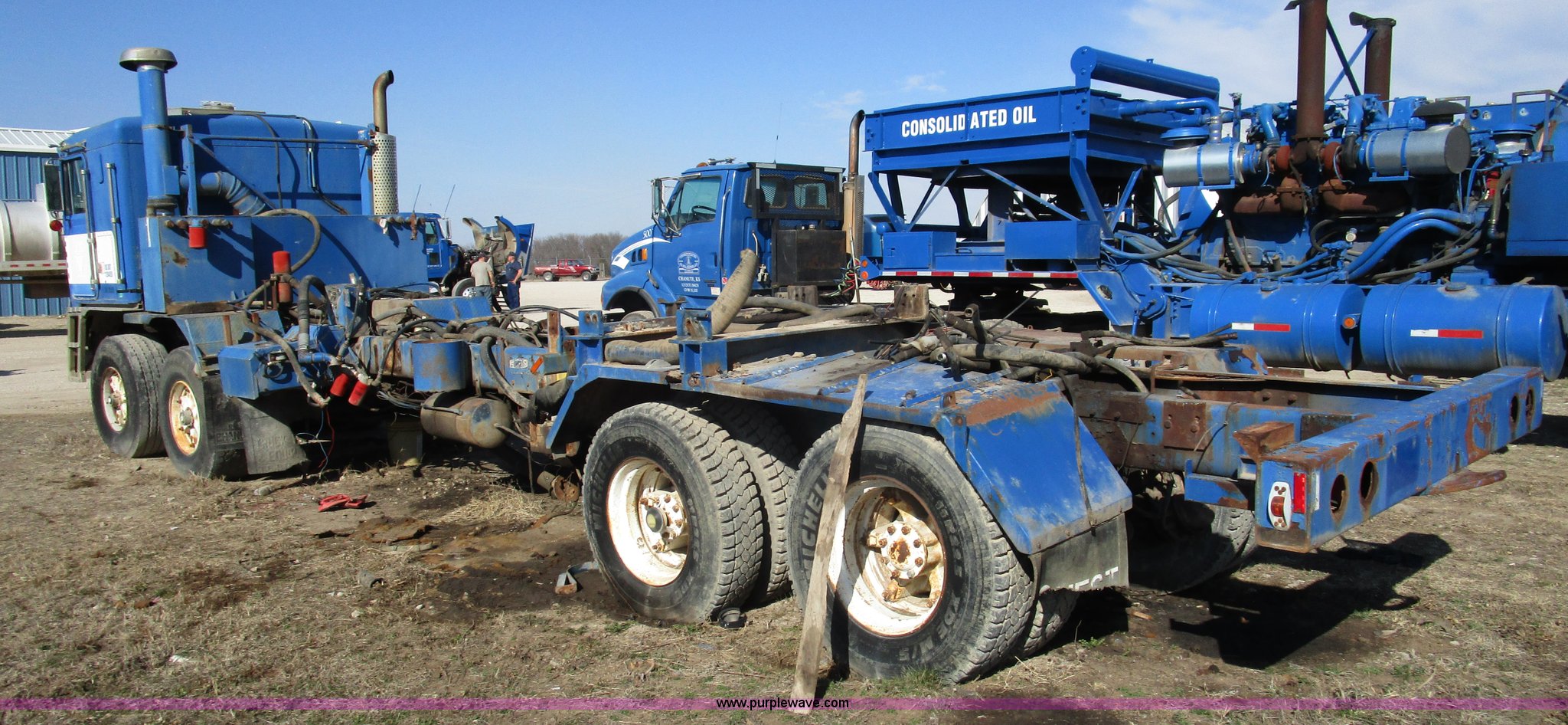 1980 Kenworth K100 semi truck. 799,280 miles on odometer, 4,073 hours on meter, Caterpillar 3406 diesel engine, 13 speed manual transmission Deep reduction, Heat, AM/FM/cassette, Passenger daylight door, PTO, 120 gallon fuel tank, Full steel fenders, Single rear exhaust stack, Spring suspension, Air brakes Trailer brake controller, Jake brake, Dual steer axles, 485/65R22.5 front tires, 11R22.5 rear tires, Non-operational starter, Drive shaft disconnected, Portion of drive shaft missing, Unit # 145. 899827M. Consolidated Oil Well Services. 8655 Dorn Road. Thayer, KS 66776