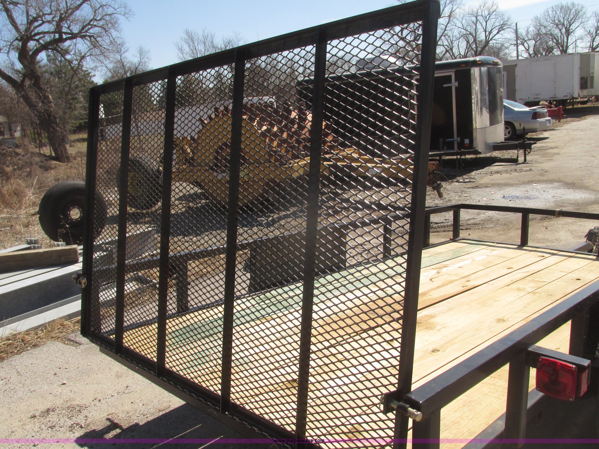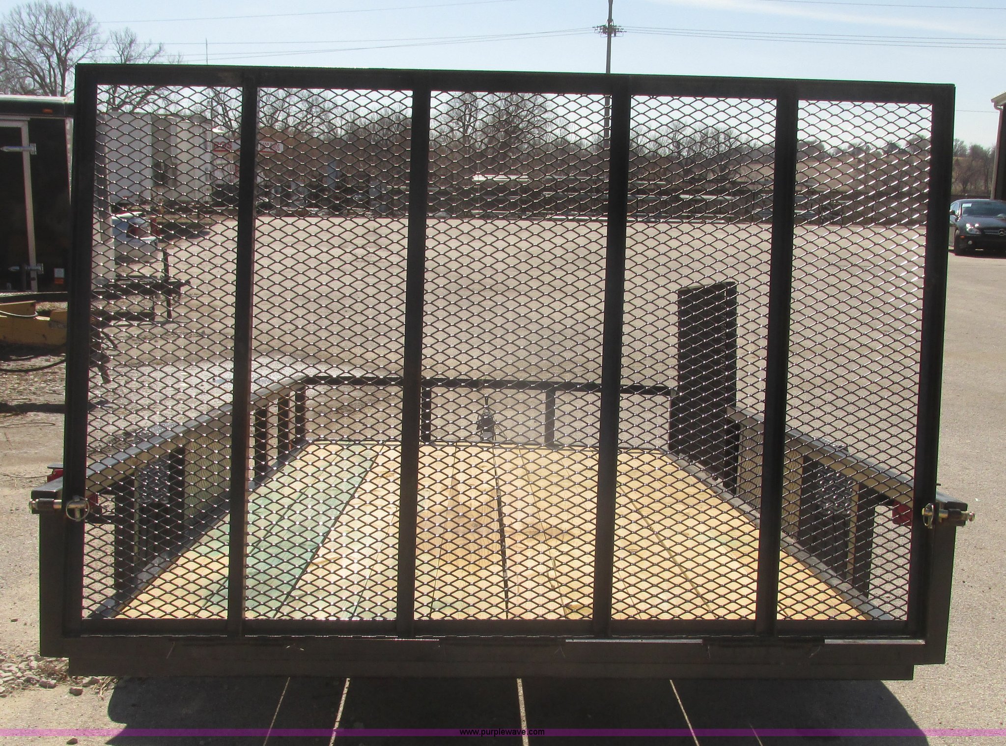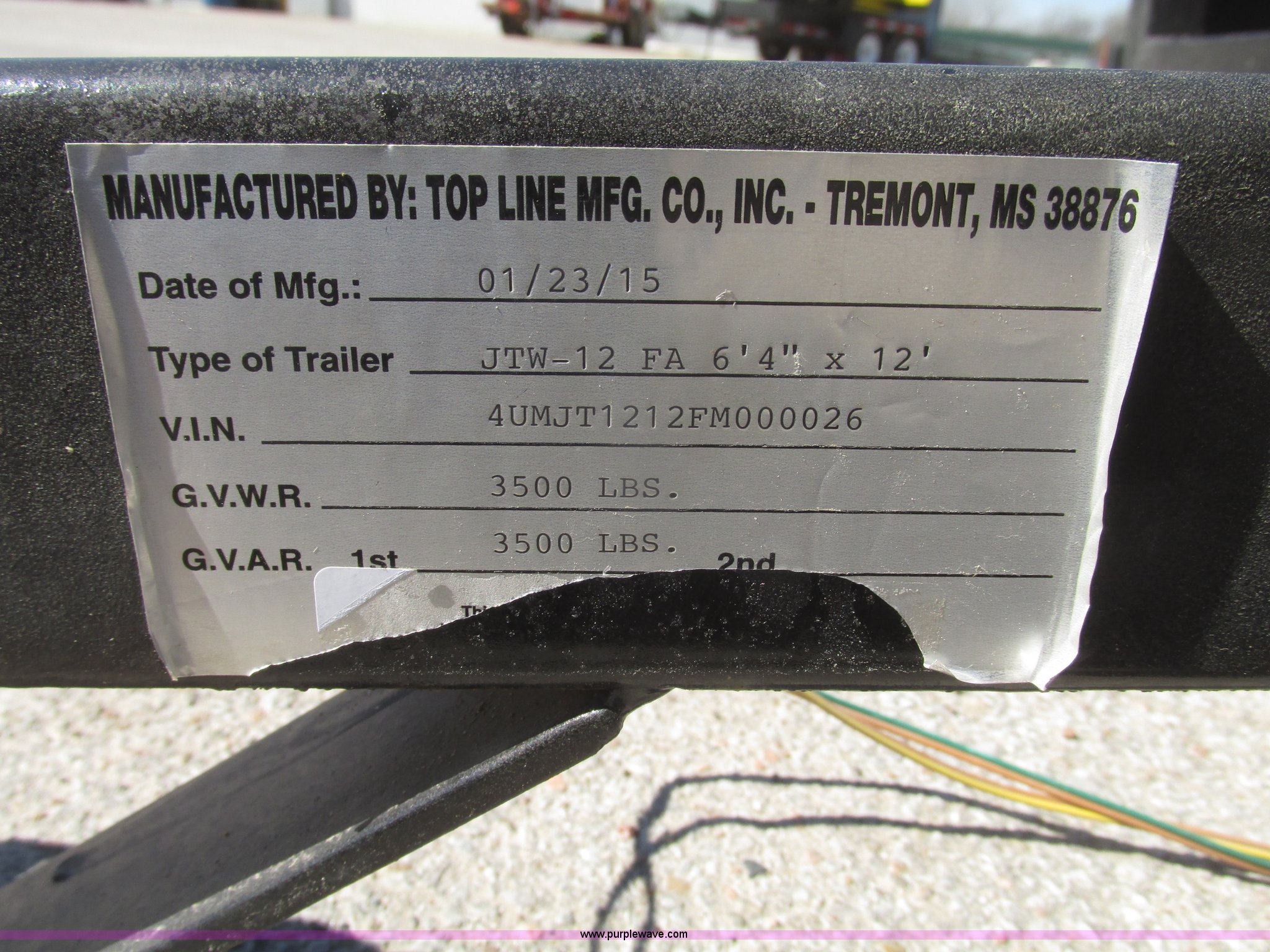 2015 Topline JTW-12 utility trailer. 140"L x 72"W I.D. 18"H rails, Wood deck, 32.5"L x 47"W mesh side ramp, 48"L x 75"W mesh rear ramp, 2" ball hitch, Taillights, Steel fenders, Spring suspension, P205/70R15 tires, GVWR 3,500 lbs, Wire is not hooked up, Side ramp bracket broken. 4UMJT1212FM000026. 6905 N 94th Plaza. Omaha, NE 68122