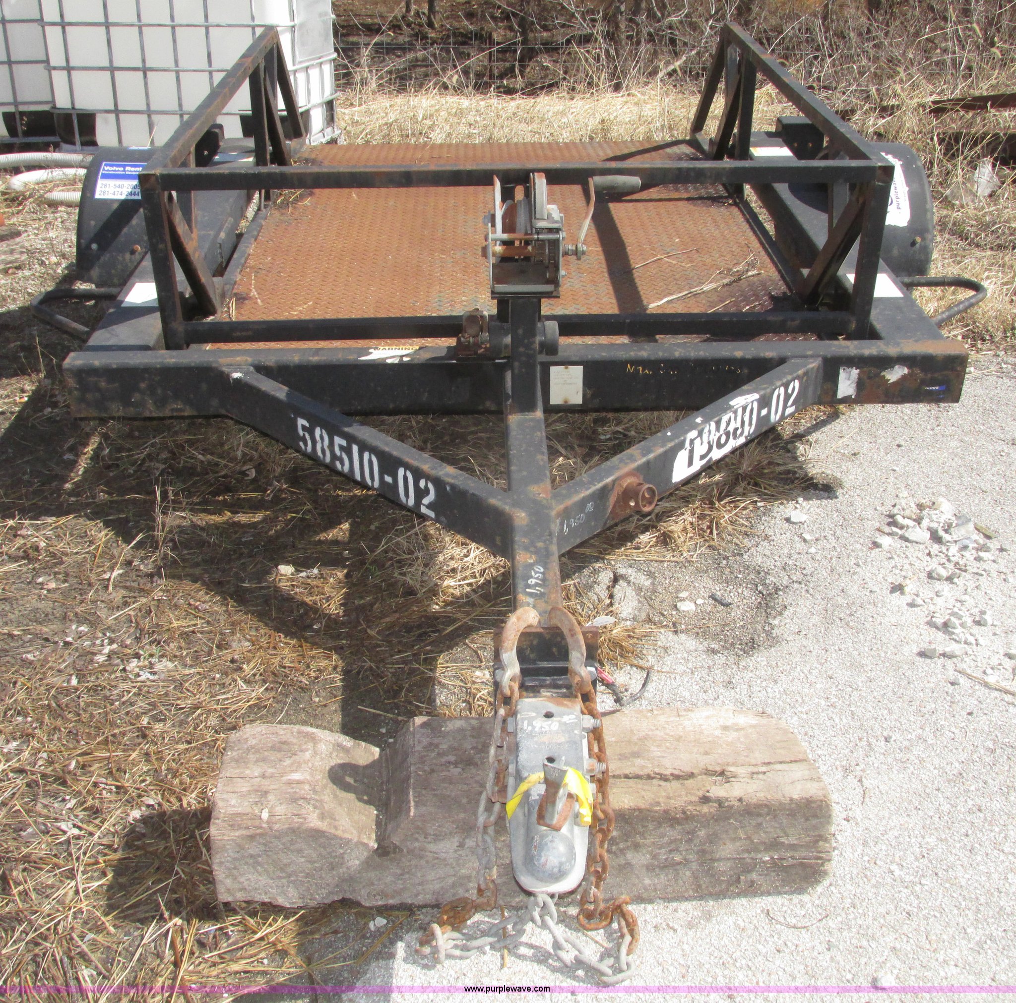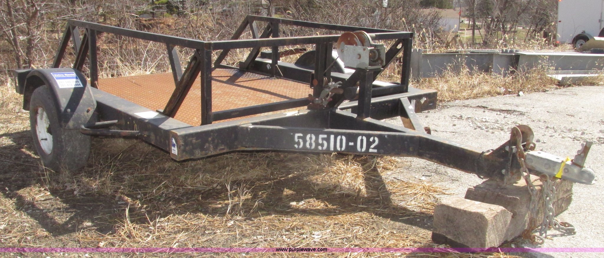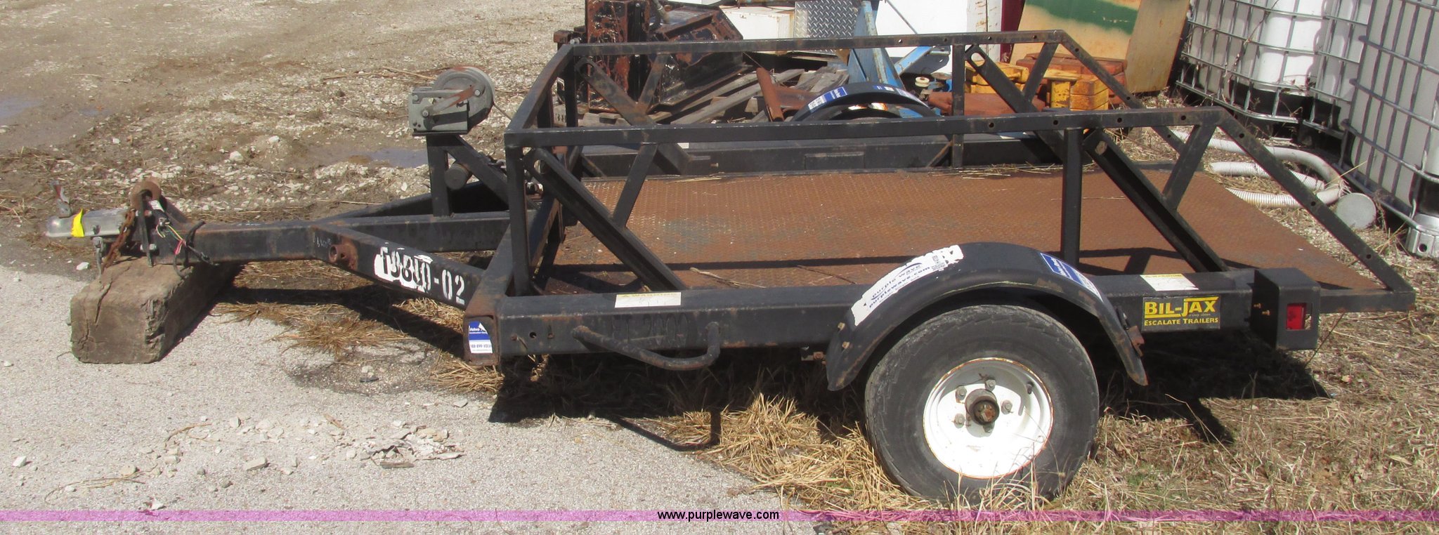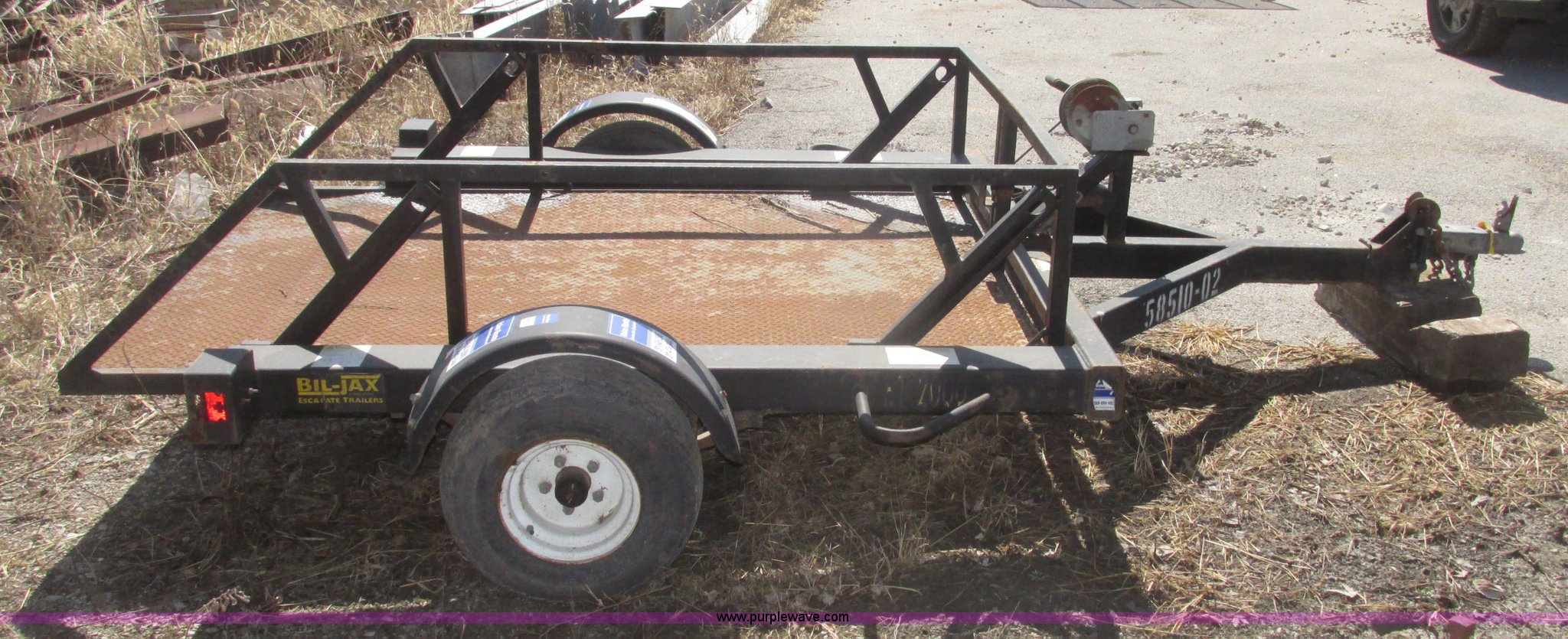 Purple Wave is selling a used Car or Utility Trailer in Nebraska. This item is a 2004 Bil-jax ET-2000 deck level ground loading trailer with the following: 86"L x 58"W I.D., 19"H rails, (2) safety chains, Hooks, Taillights, 2" ball hitch, Manual winch, Four wire trailer wiring, Adapter removed, Spring suspension, 20.5x8.0-10 tires, 2,000 lbs load capacity, GVW 2,800 lbs, Unit# 58510-02