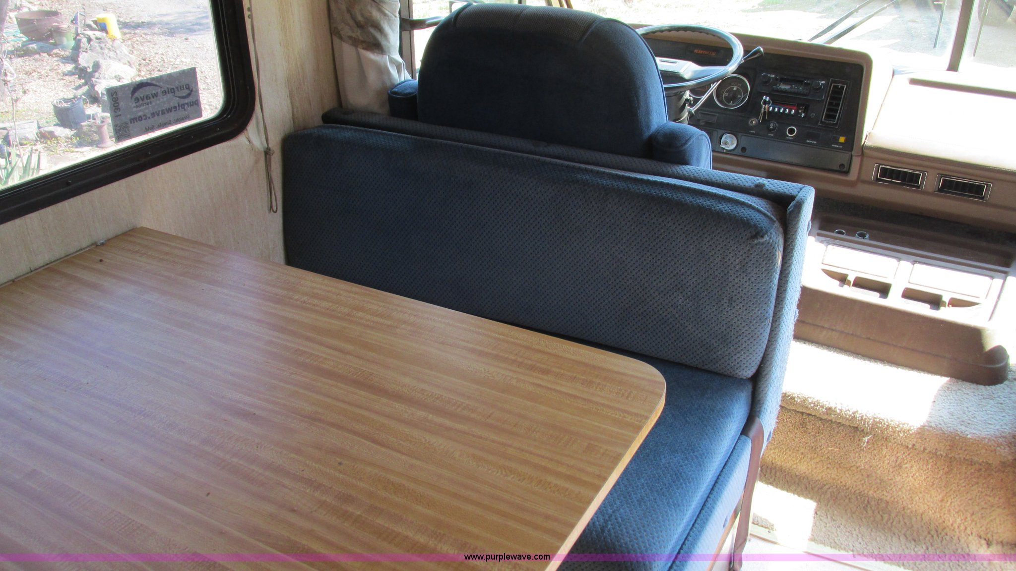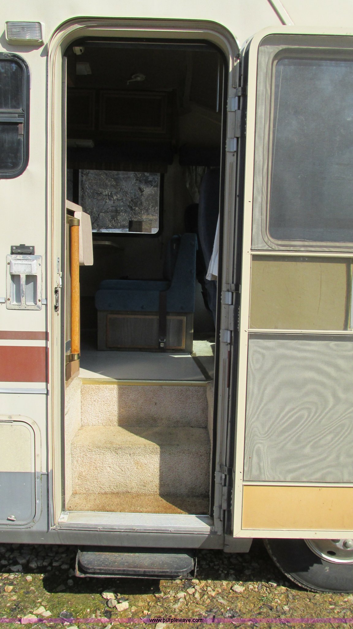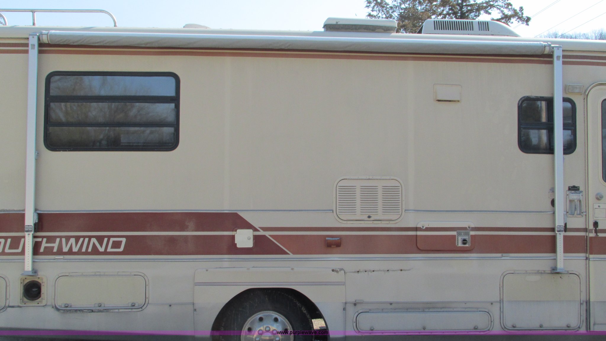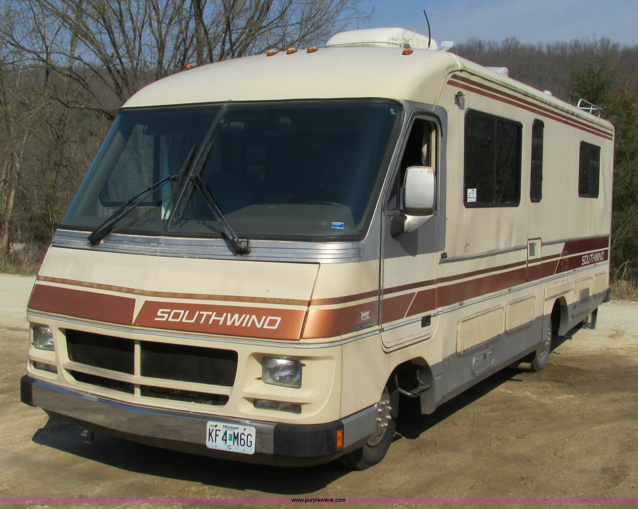 Purple Wave is selling a used RV in Missouri. This item is a 1987 Chevrolet P30 Fleetwood/Southwind RV with the following: 88,645 miles on odometer, 398 hours on meter, 7.4L V8 gas engine, Automatic transmission, AC and heat, Tilt, Cruise, AM/FM/cassette, Manual windows and locks, Cloth interior, Bathroom, Shower, Sink, Shurflow toilet, Bedroom, Four burner propane stove, Dual fuel refrigerator, Gas or electric, Magic Chef microwave, Television, Onan Emerald I generator, Model 4.0BC-E-1R126100AC, 120V AC, 4 kVA, 4 kW, Serial D870887634, Generator will not start, unknown operating condition, Hydraulic level, Passenger sliding window, Dinning seats fold out to a bed, Overhead storage, Awning, Approx. 27'L overall, Trailer wiring, LT235/85R16 tires, GVWR 12,300 lbs, FAWR 5,579 lbs, RAWR 7,500 lbs, Interior/exterior cosmetic damage