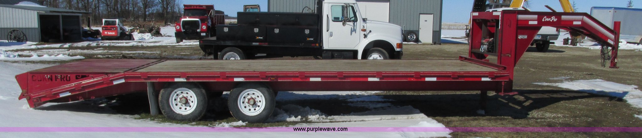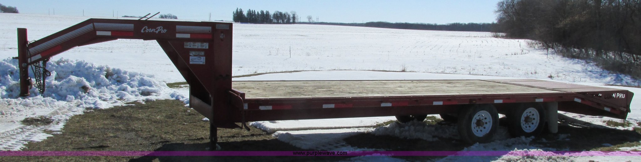 Purple Wave is selling a used Equip. Trailer in Minnesota. This item is a 2009 Cornelius Manufacturing Corn Pro gooseneck equipment trailer with the following: 25'L x 102"W, Side stake pockets, 64'L x 20"W ramps, Super LP8500 electric winch, Single leg landing gear, 235/80R16 tires, GVWR 14,000 lbs
