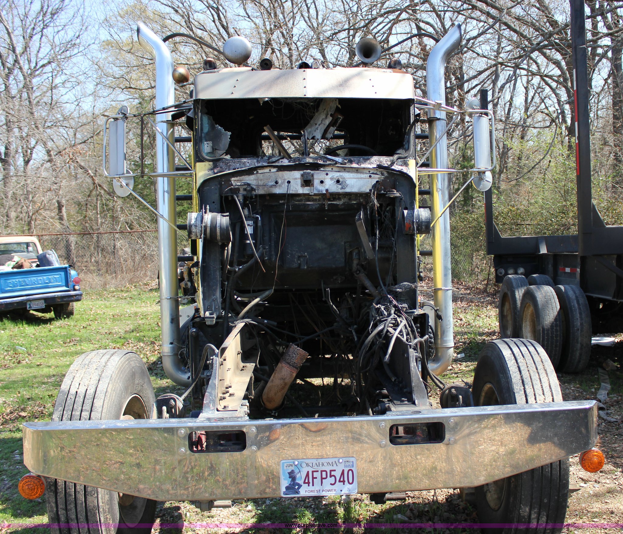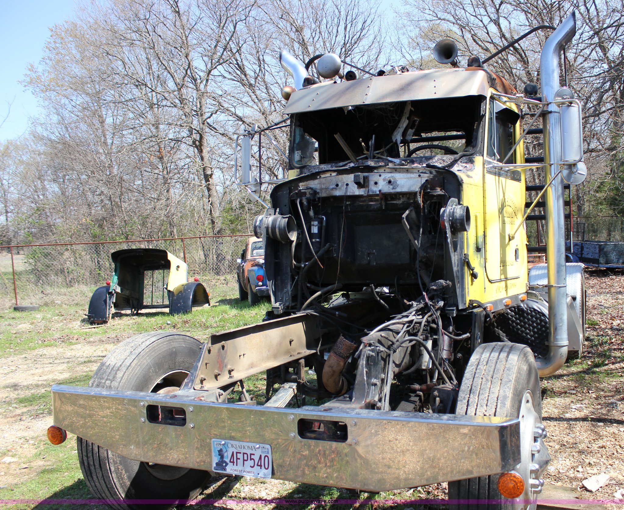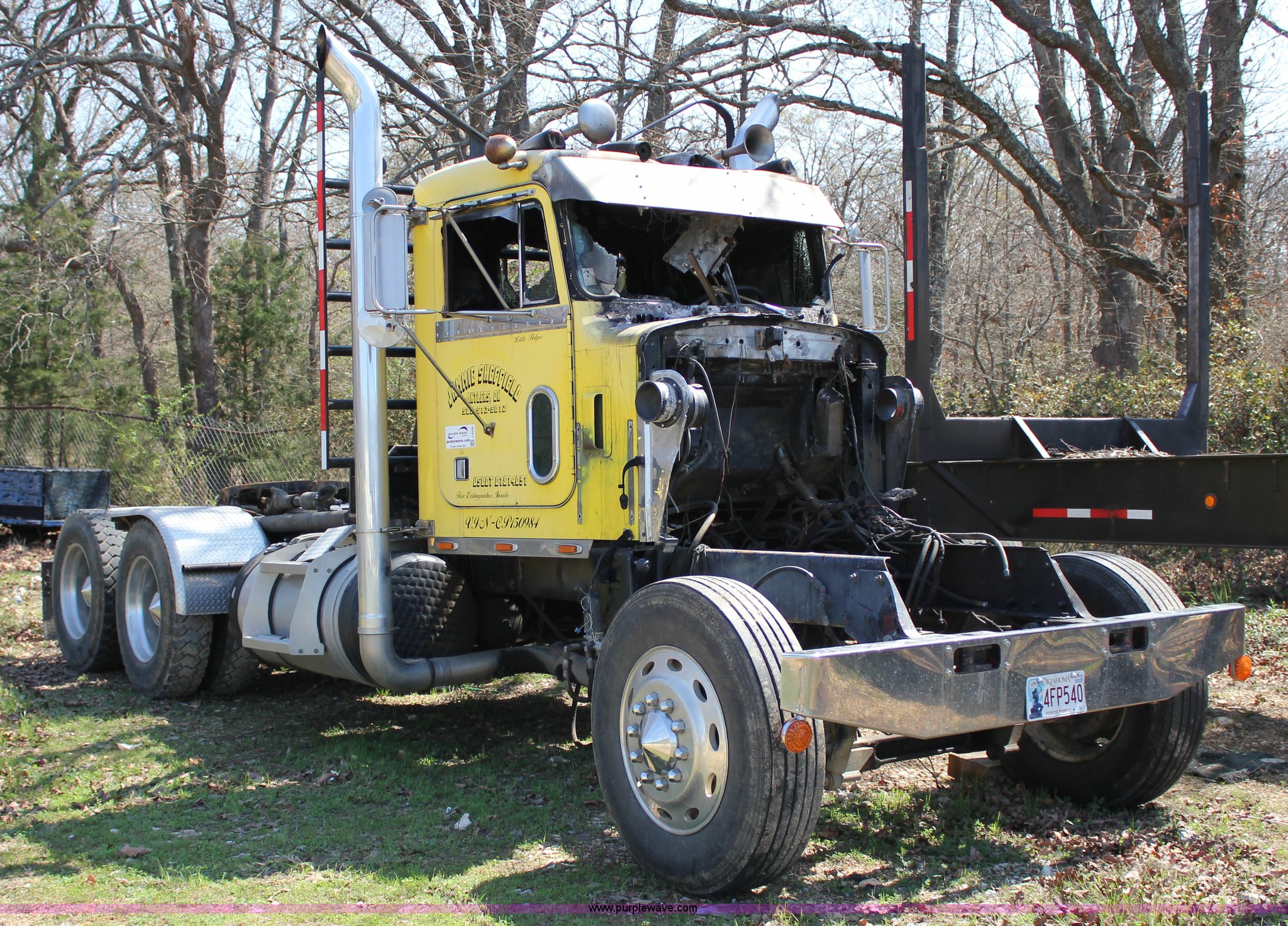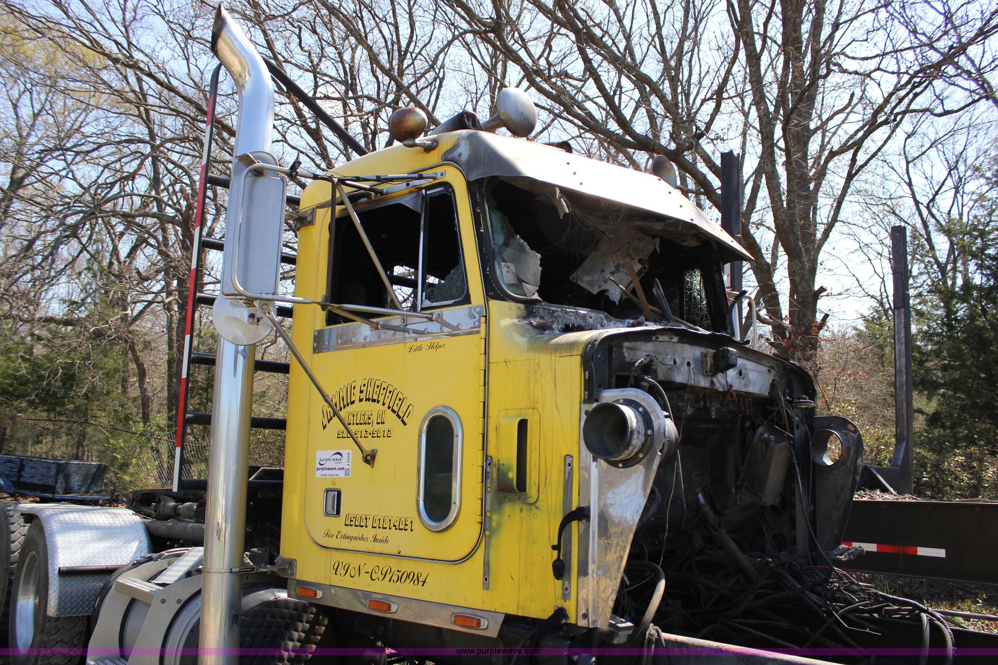 Purple Wave is selling a used Truck Tractor in Oklahoma. This item is a 1982 Peterbilt 382 semi truck with the following: Unknown miles on odometer, Caterpillar 3406B 14.6L L6 diesel engine, No transmission, Passenger daylight door, Visor, Custom headache rack, Pierce winch system, Dual 100 gallon fuel tanks, Dual rear exhaust stacks, PTO, Air suspension, Air brakes, 11R24.5 tires, Air horns will be removed prior to auction, Fire damage, Parts missing
