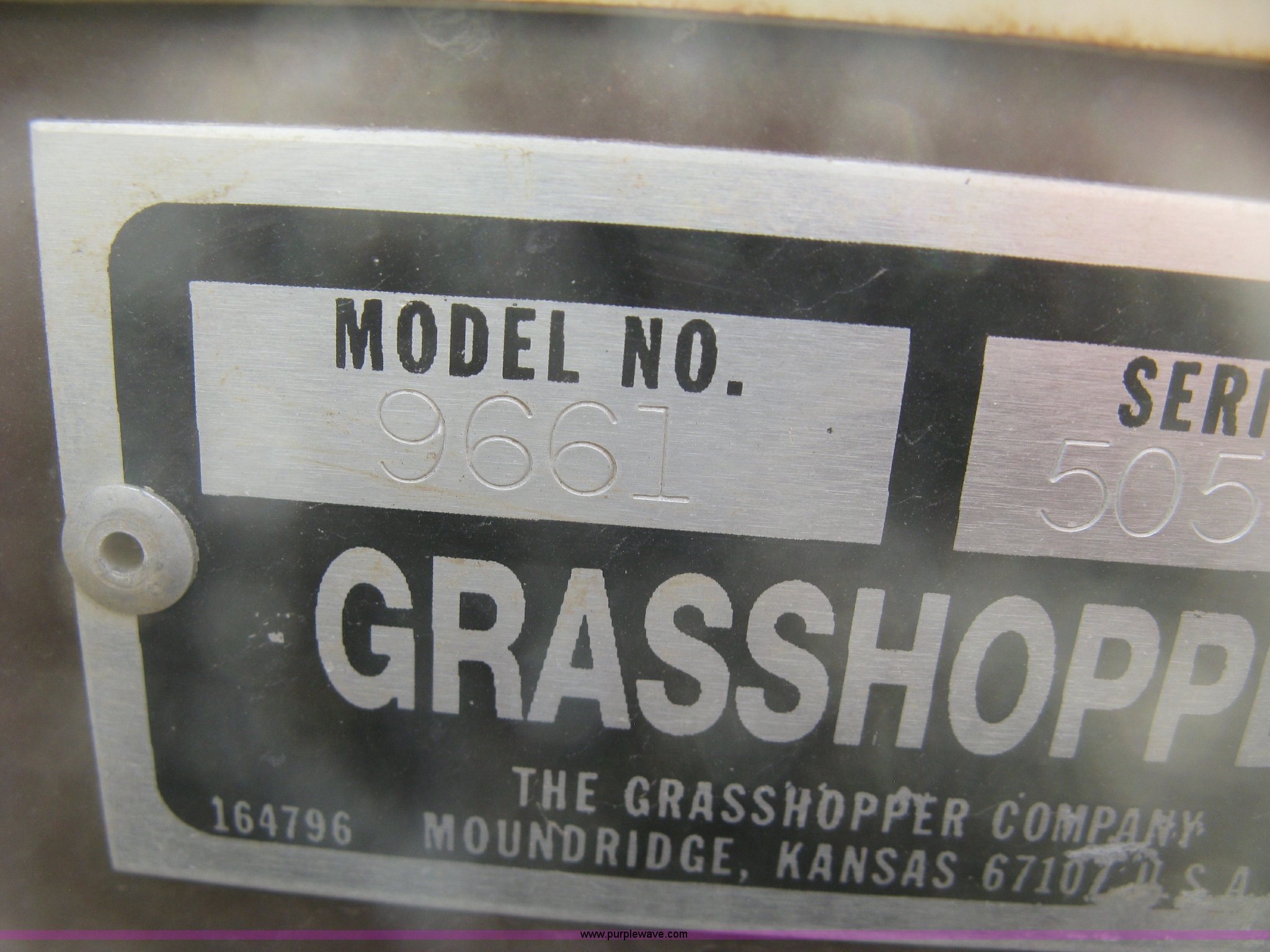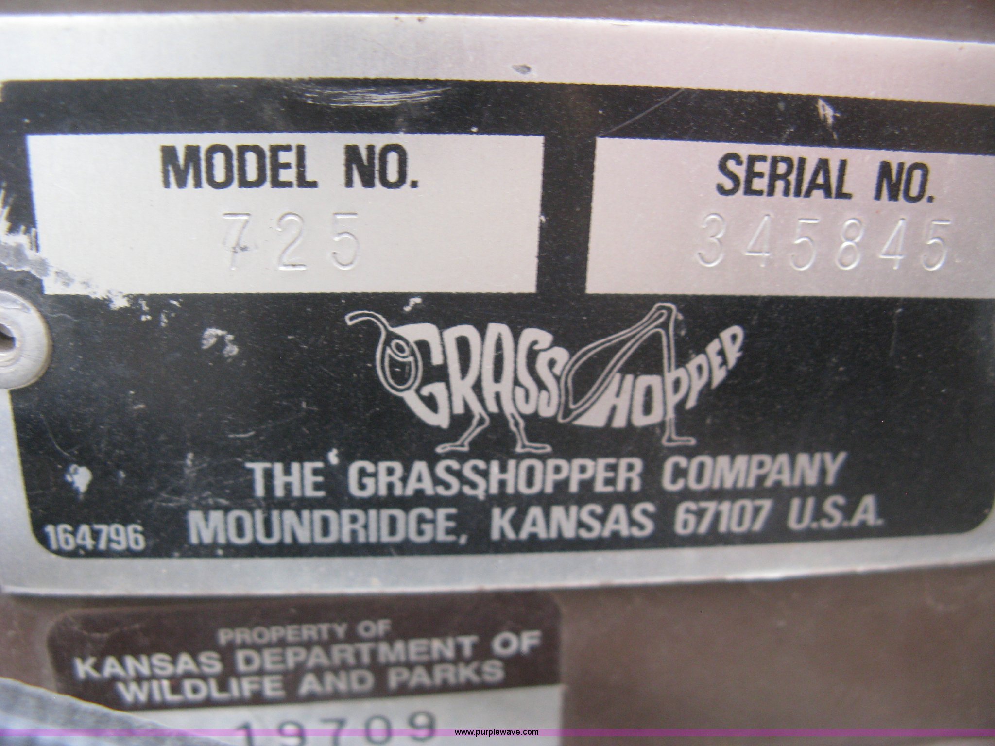 1994 Grasshopper 725 riding lawn mower. 695 hours on meter, 61" cutting capacity Deck model 9661. Kubota WG750 three cylinder gas engine Hydrostatic transmission, 13 x 5.00-6 NHS front tires, 13 x 5.00-2 NHS rear tires, Serial 345845. View equipment video. Hales Sales & Service. 804 S.E. 125th Street North. Sedgwick, KS 67135