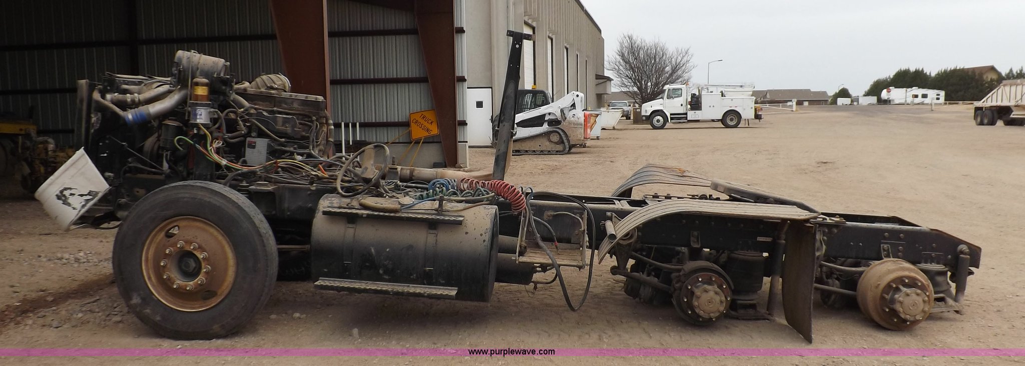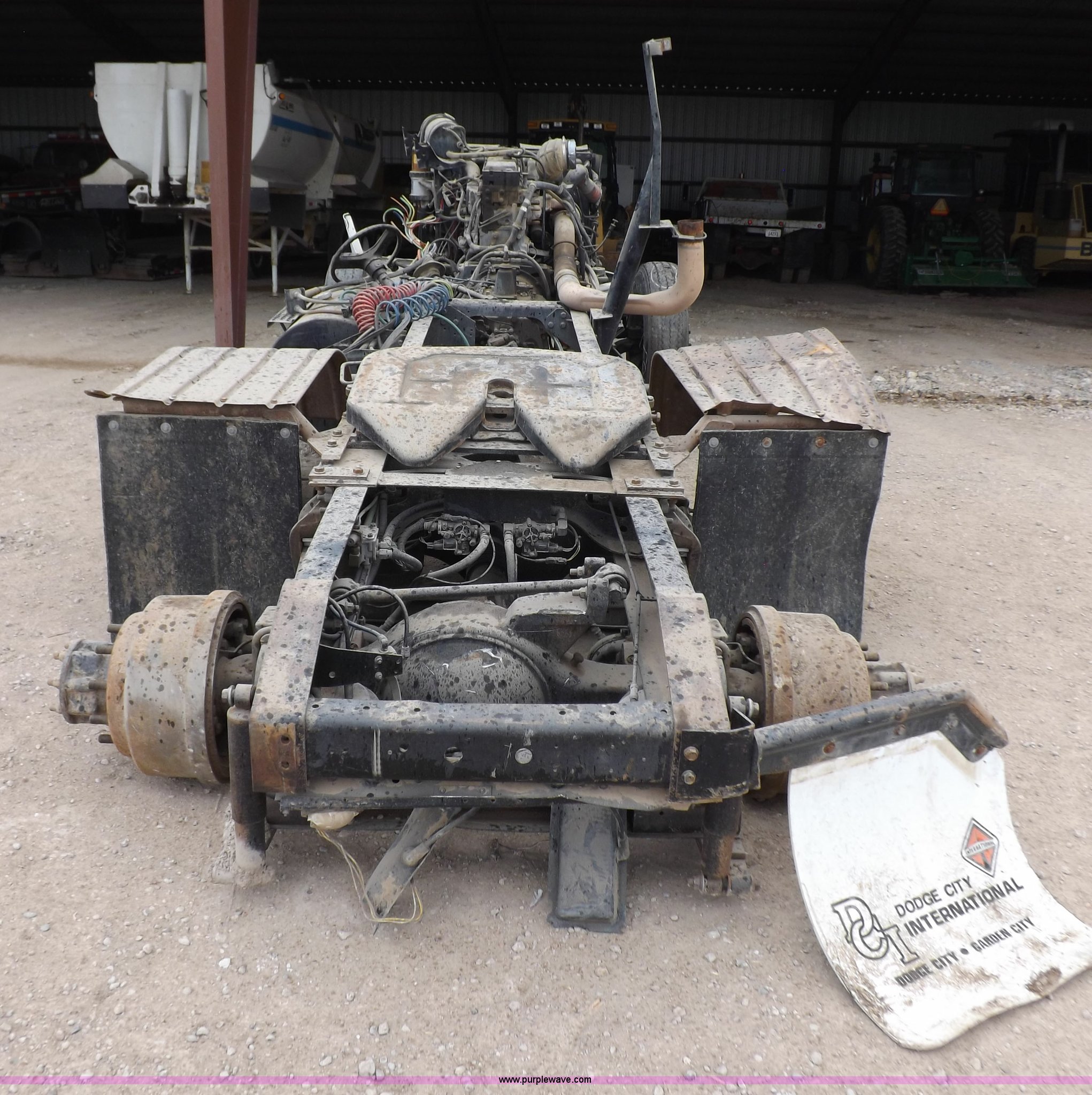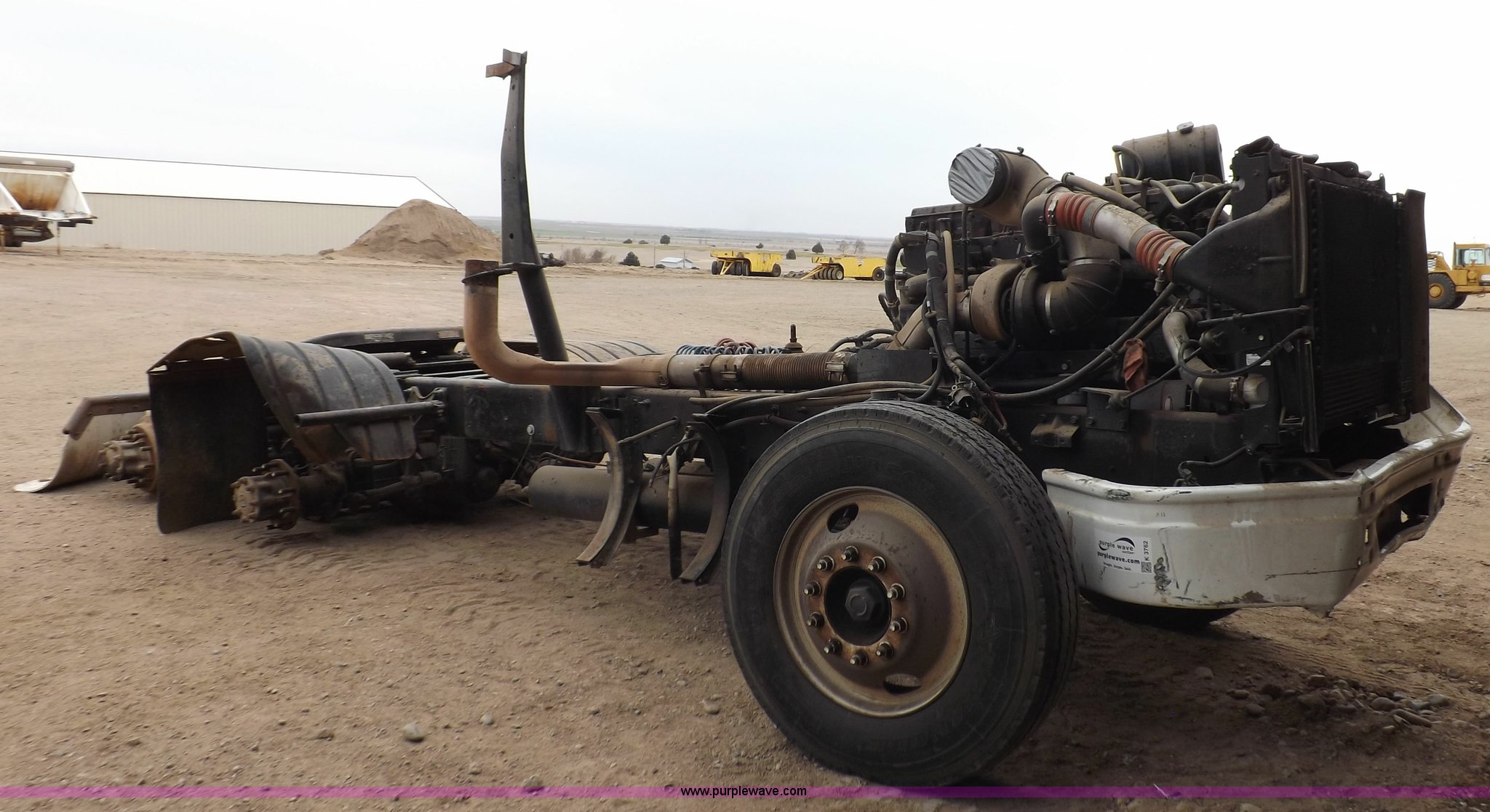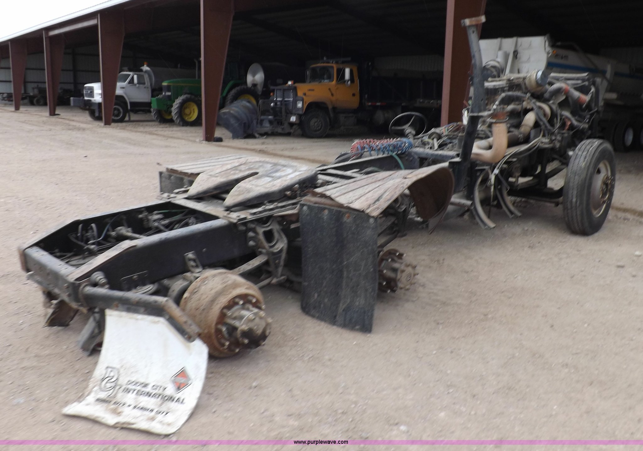Purple Wave is selling a used Truck Chassis in Kansas. This item is a 2002 International 9100i truck chassis with the following: Cummins N14 14.0L L6 diesel engine, 370 HP, Eaton Fuller Road Ranger 10 speed manual transmission, Air slide fifth wheel, 106 gallon fuel tanks, Single rear exhaust stack, Air suspension, Air brakes, 165" wheelbase, 11R24 tires, Wrecked, parts only