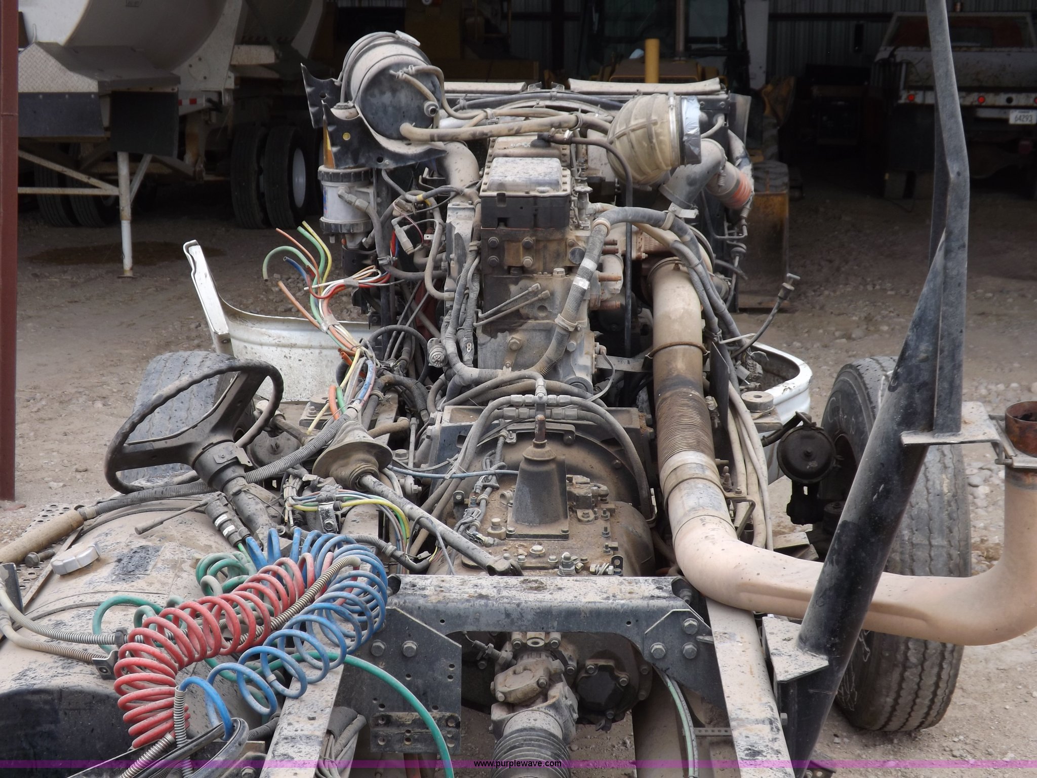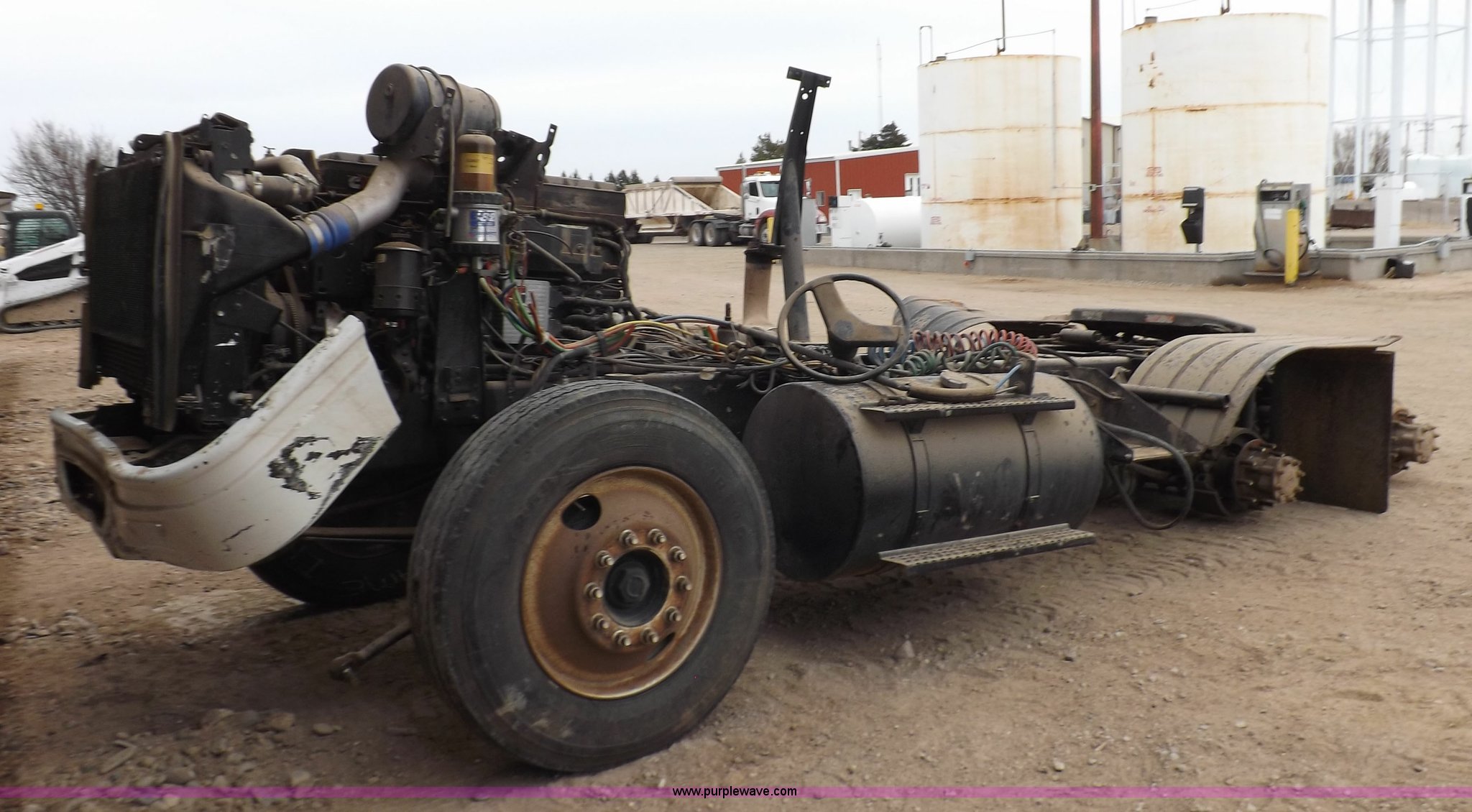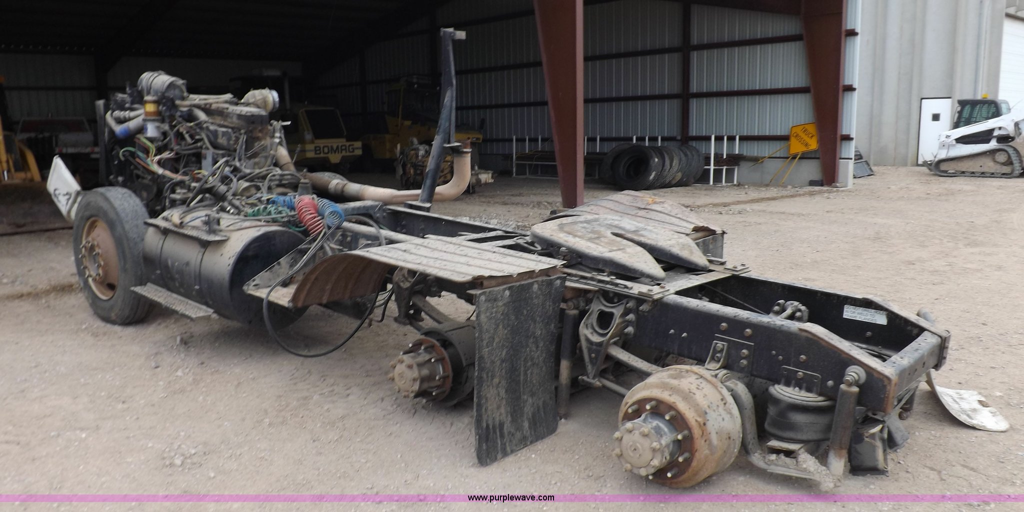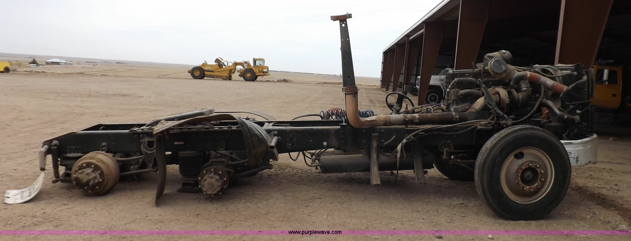 Purple Wave is selling a used Truck Chassis in Kansas. This item is a 2002 International 9100i truck chassis with the following: Cummins N14 14.0L L6 diesel engine, 370 HP, Eaton Fuller Road Ranger 10 speed manual transmission, Air slide fifth wheel, 106 gallon fuel tanks, Single rear exhaust stack, Air suspension, Air brakes, 165" wheelbase, 11R24 tires, Wrecked, parts only