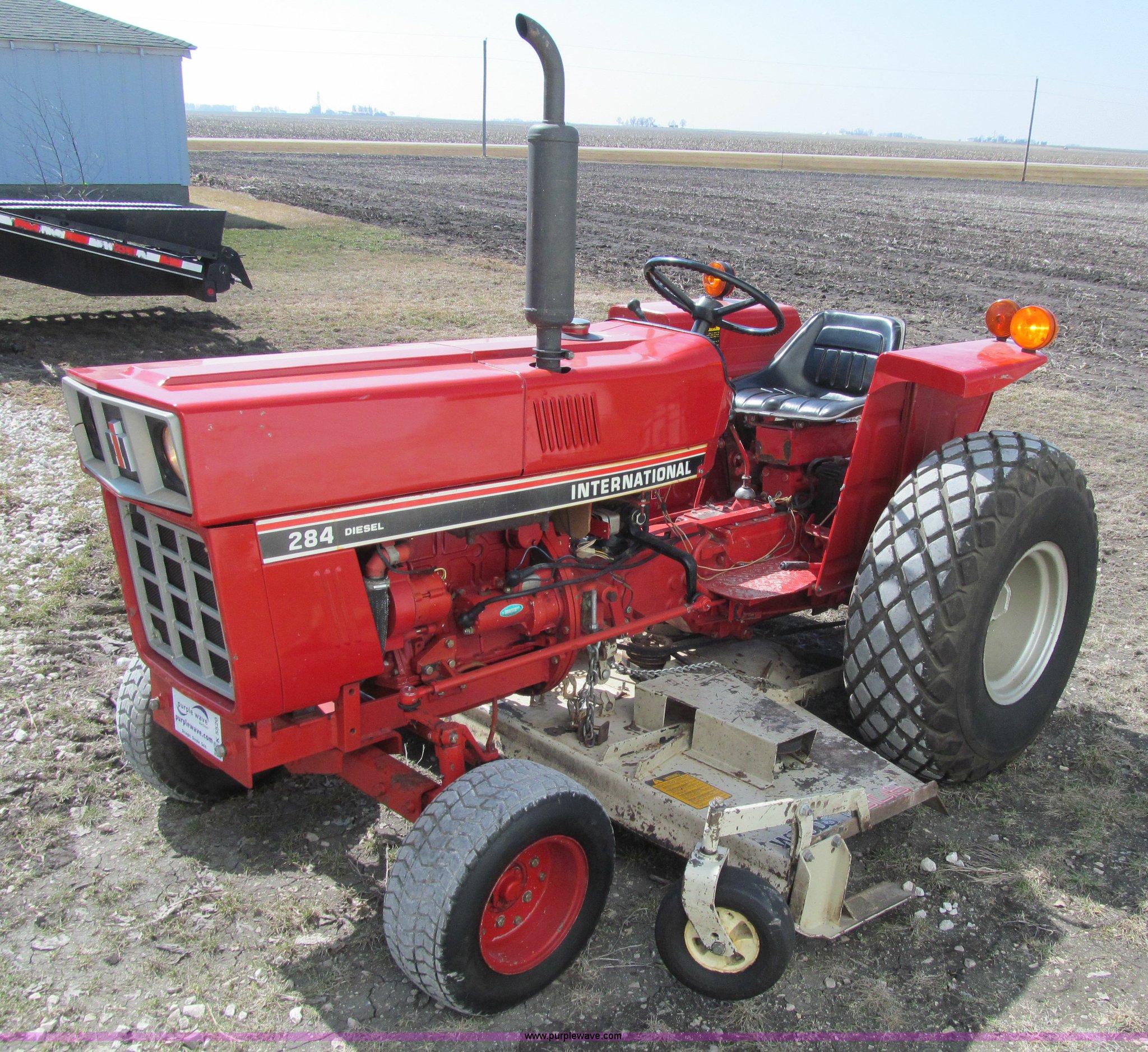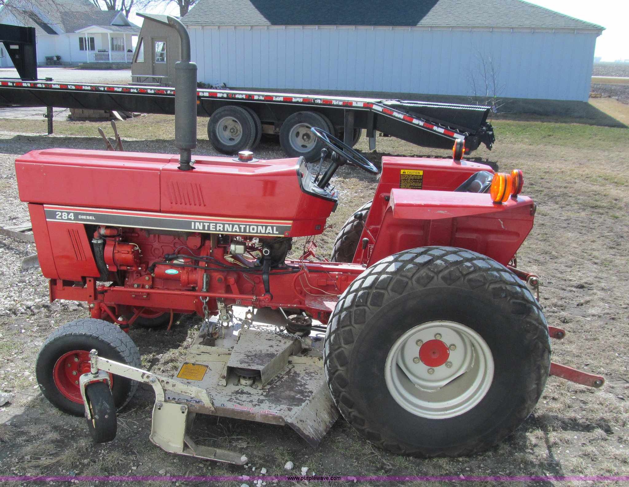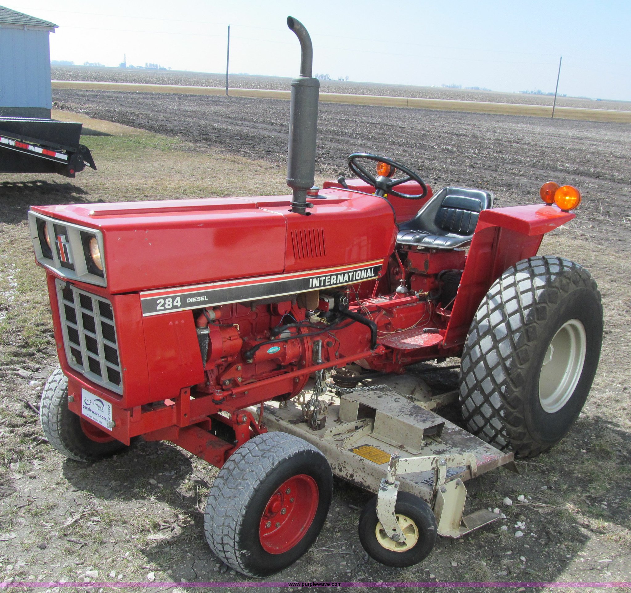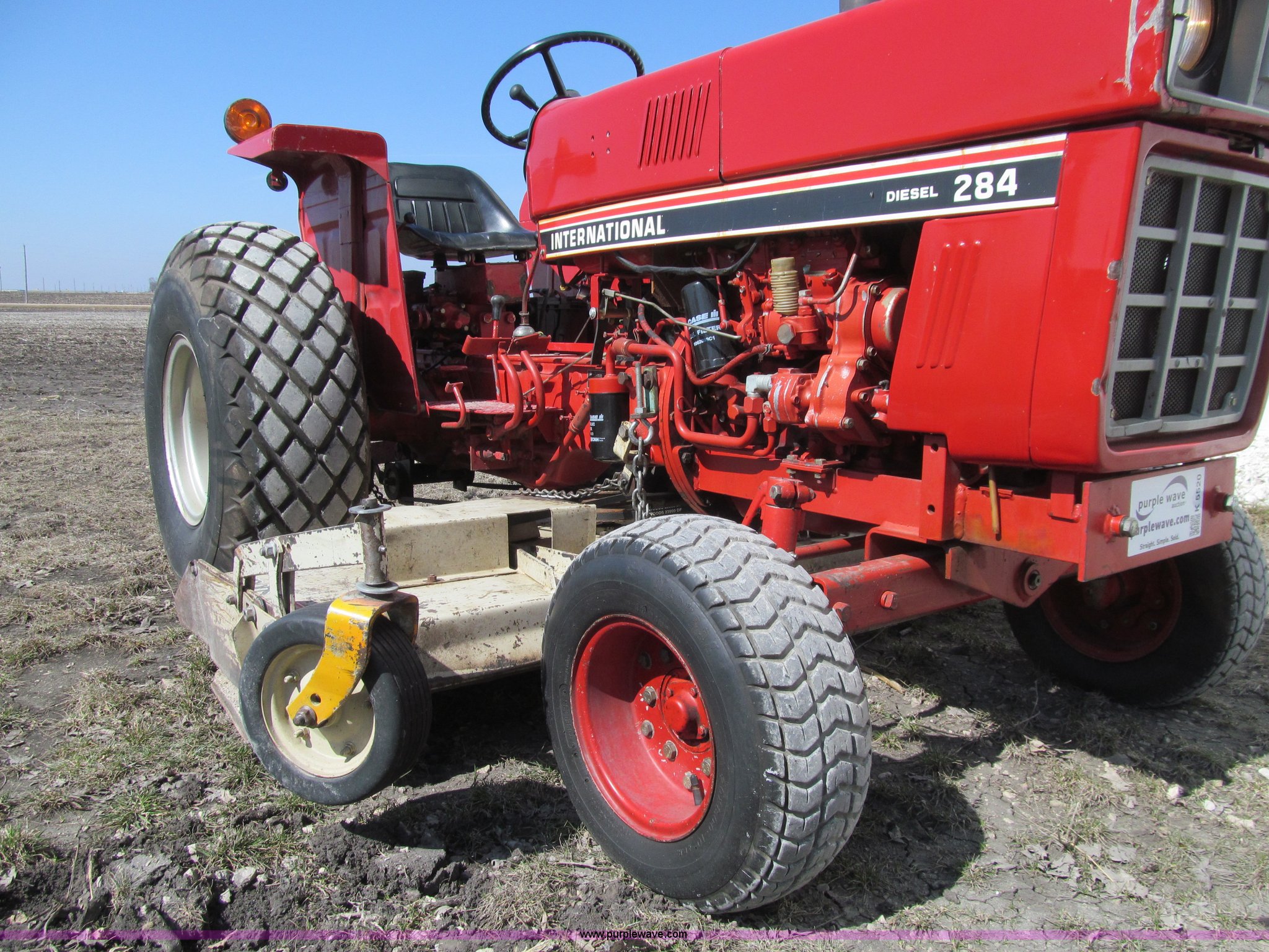 Purple Wave is selling a used Tractor in Iowa. This item is a 1983 International 284 tractor with the following: 2,915 hours on meter, Nissan SD16 1.6L three cylinder diesel engine, 28 HP, Serial 014258, Manual transmission, 8F-2R gears, Differential lock, Wood L305 belly mower, 84"W, Three point, Draw bar, 540 PTO, 8.7 gallon fuel tank, 68"W wheelbase, 20x8.00-10 front tires, 13.6-16 rear tires, Tractor and mower deck manuals, Serial 2020008J003678