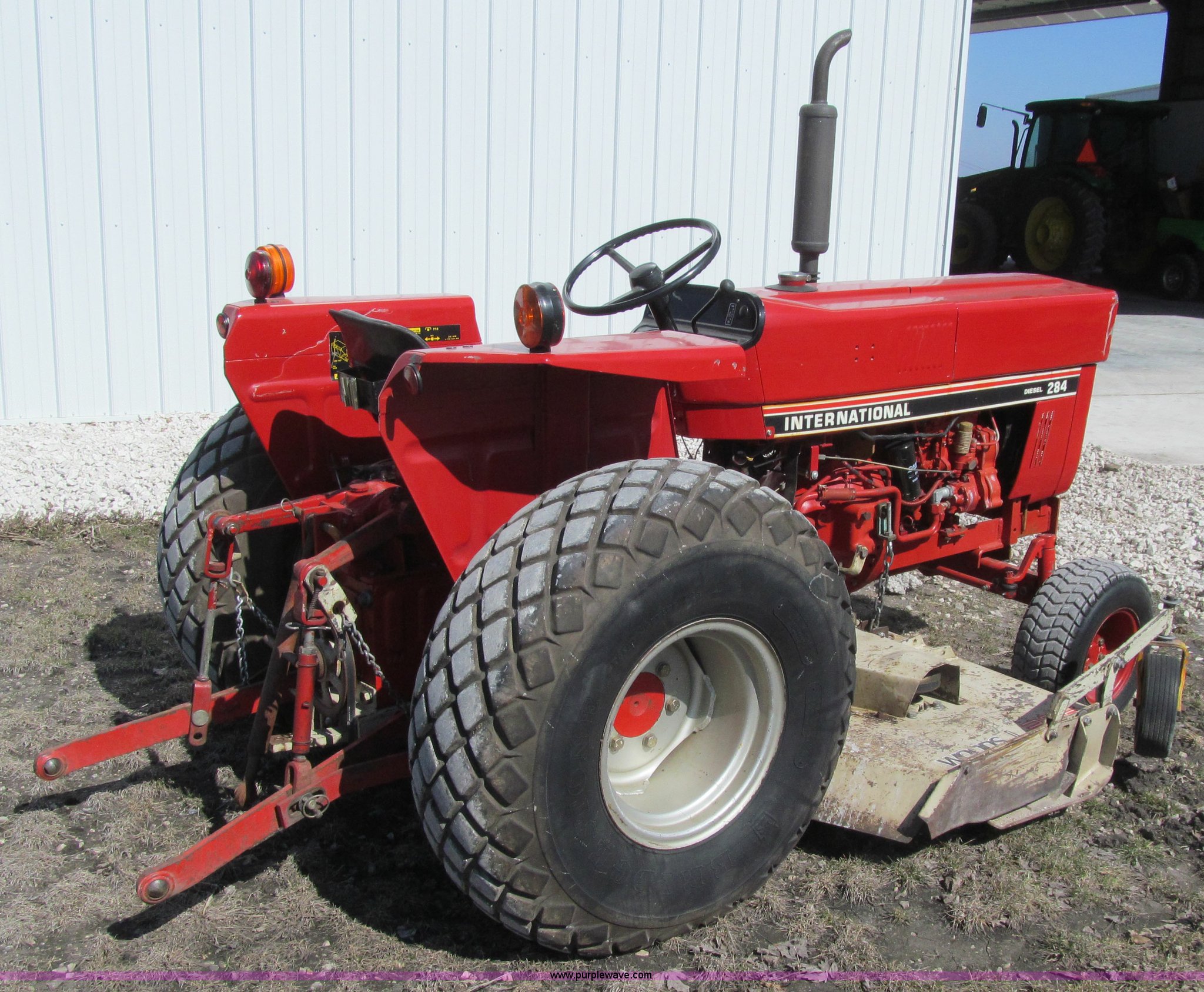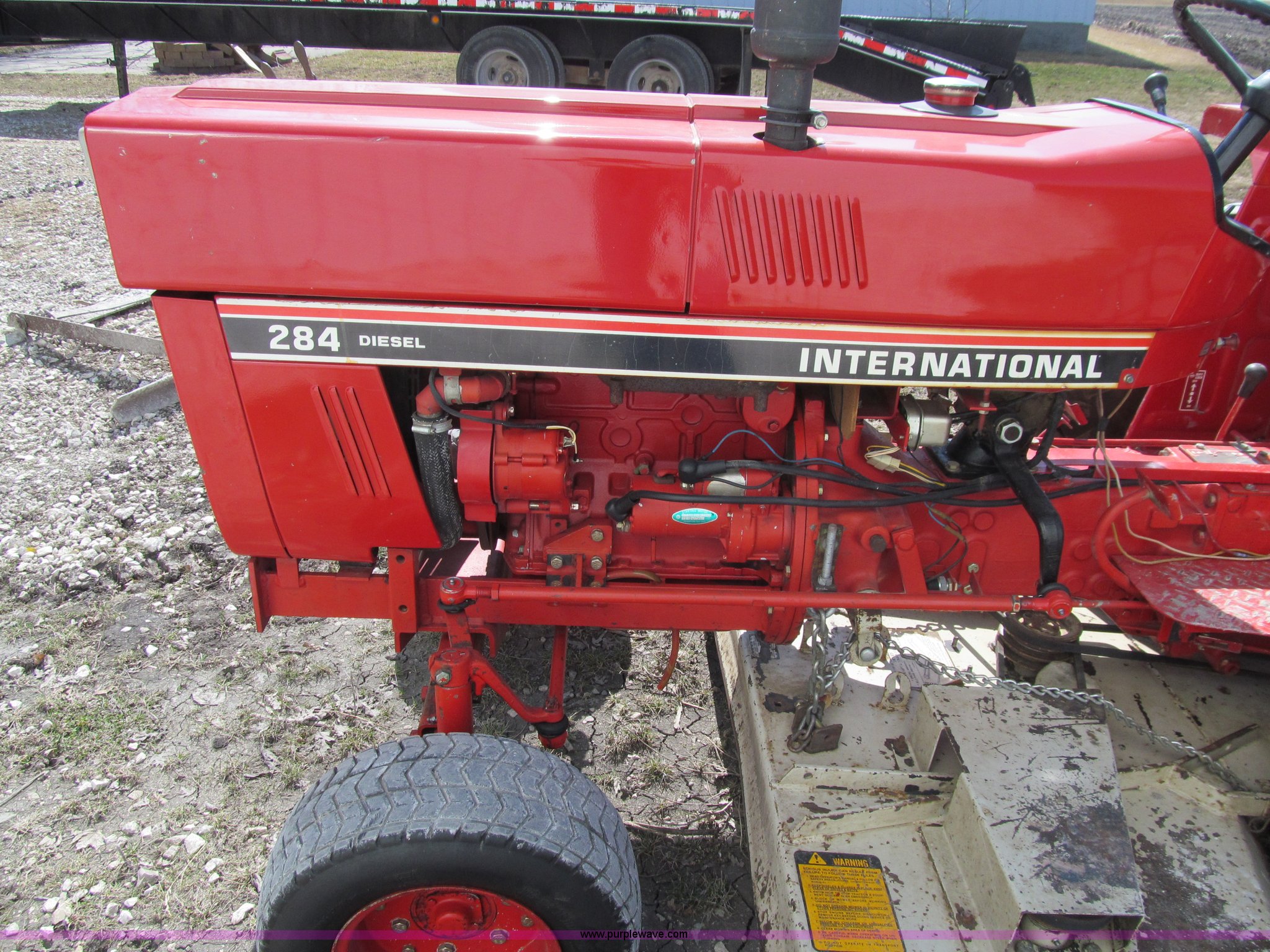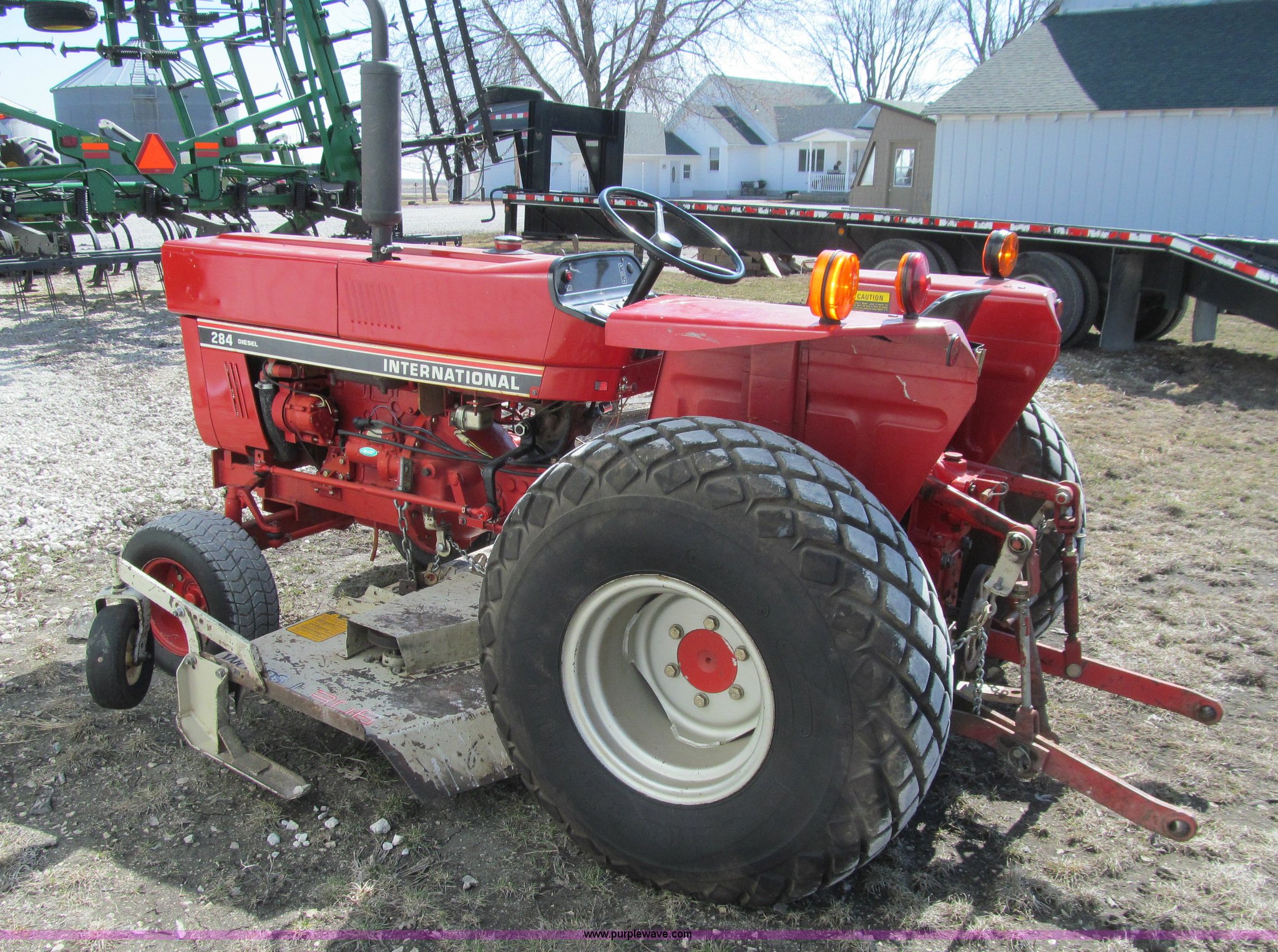 Purple Wave is selling a used Tractor in Iowa. This item is a 1983 International 284 tractor with the following: 2,915 hours on meter, Nissan SD16 1.6L three cylinder diesel engine, 28 HP, Serial 014258, Manual transmission, 8F-2R gears, Differential lock, Wood L305 belly mower, 84"W, Three point, Draw bar, 540 PTO, 8.7 gallon fuel tank, 68"W wheelbase, 20x8.00-10 front tires, 13.6-16 rear tires, Tractor and mower deck manuals, Serial 2020008J003678
