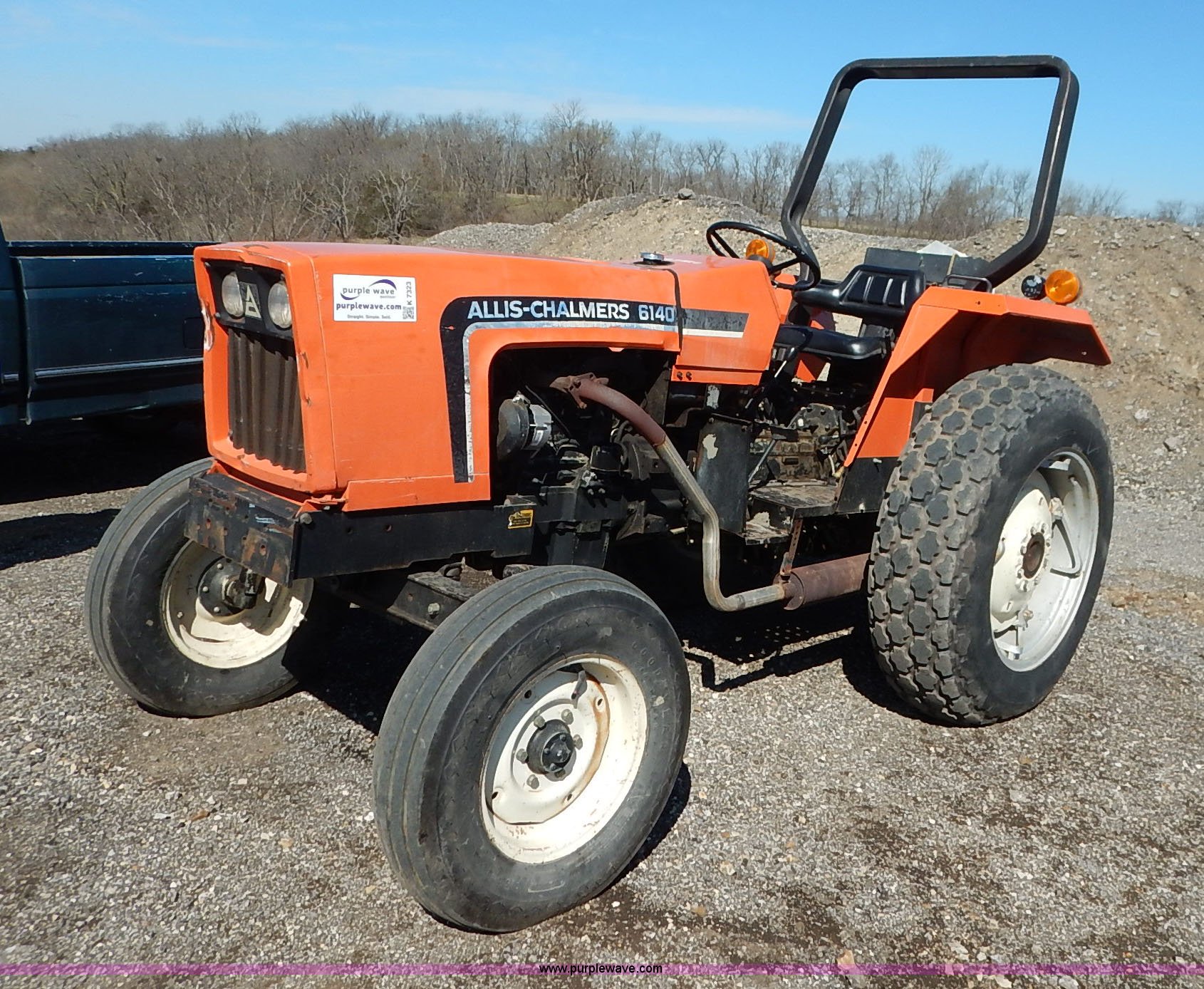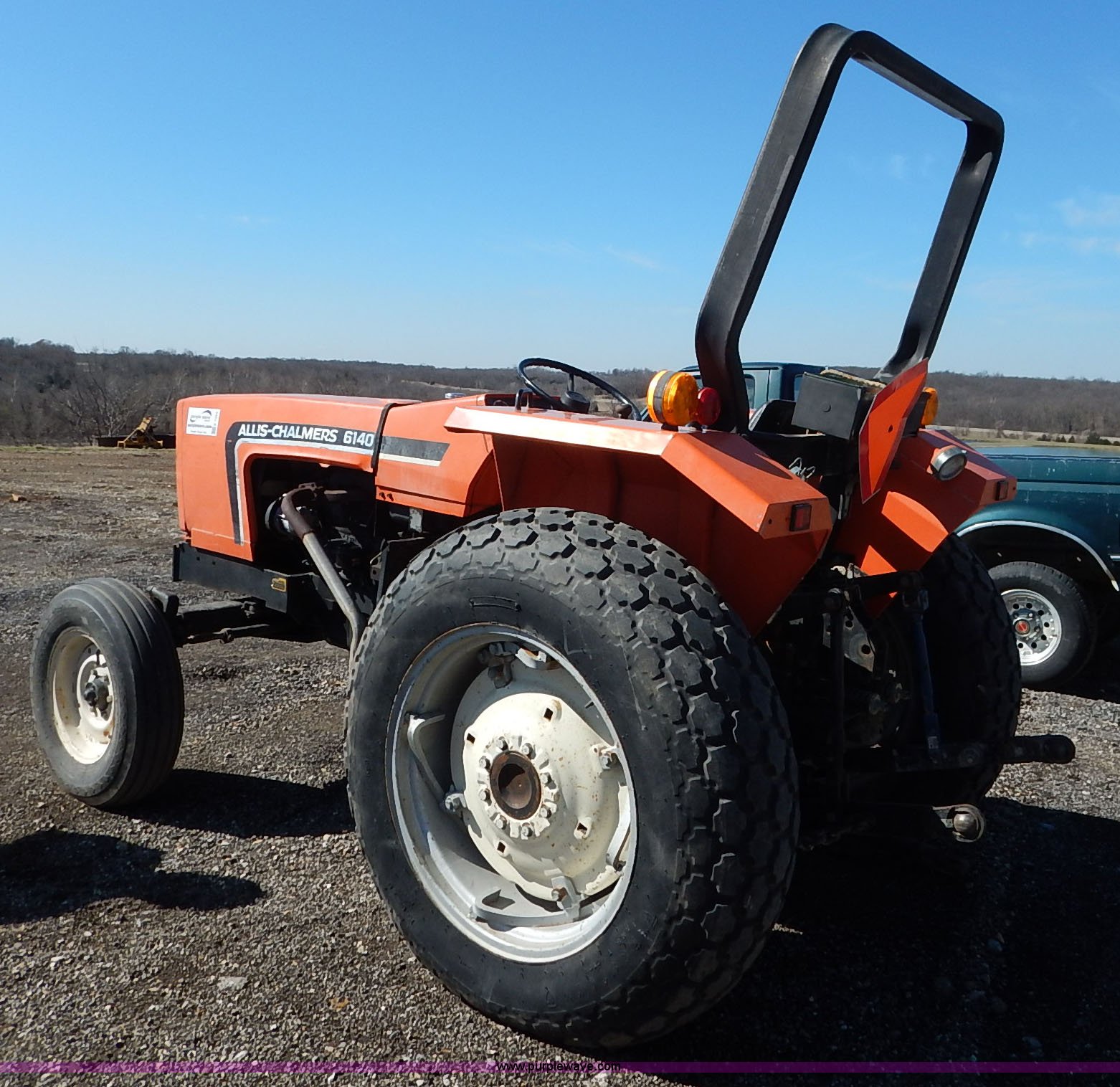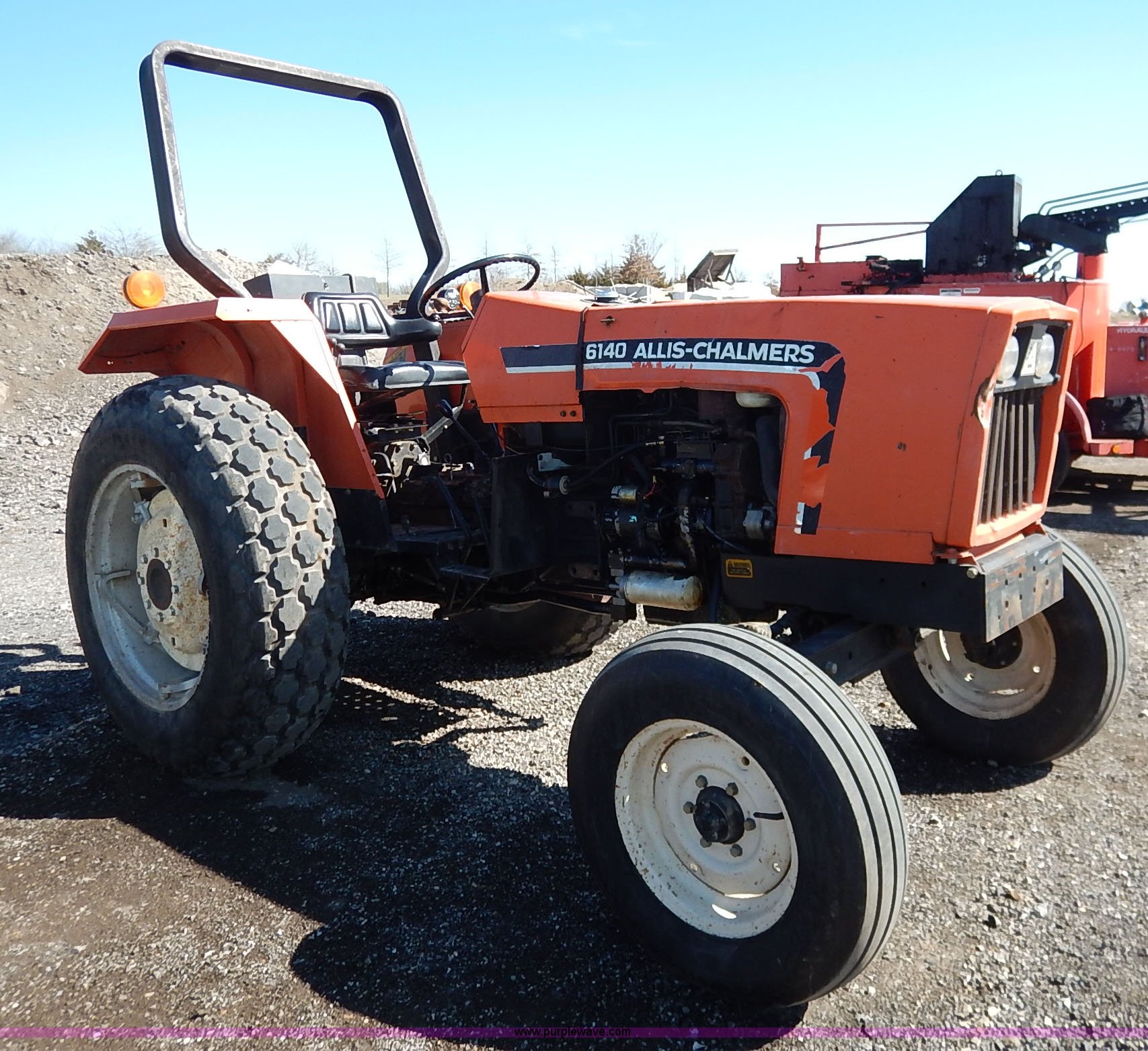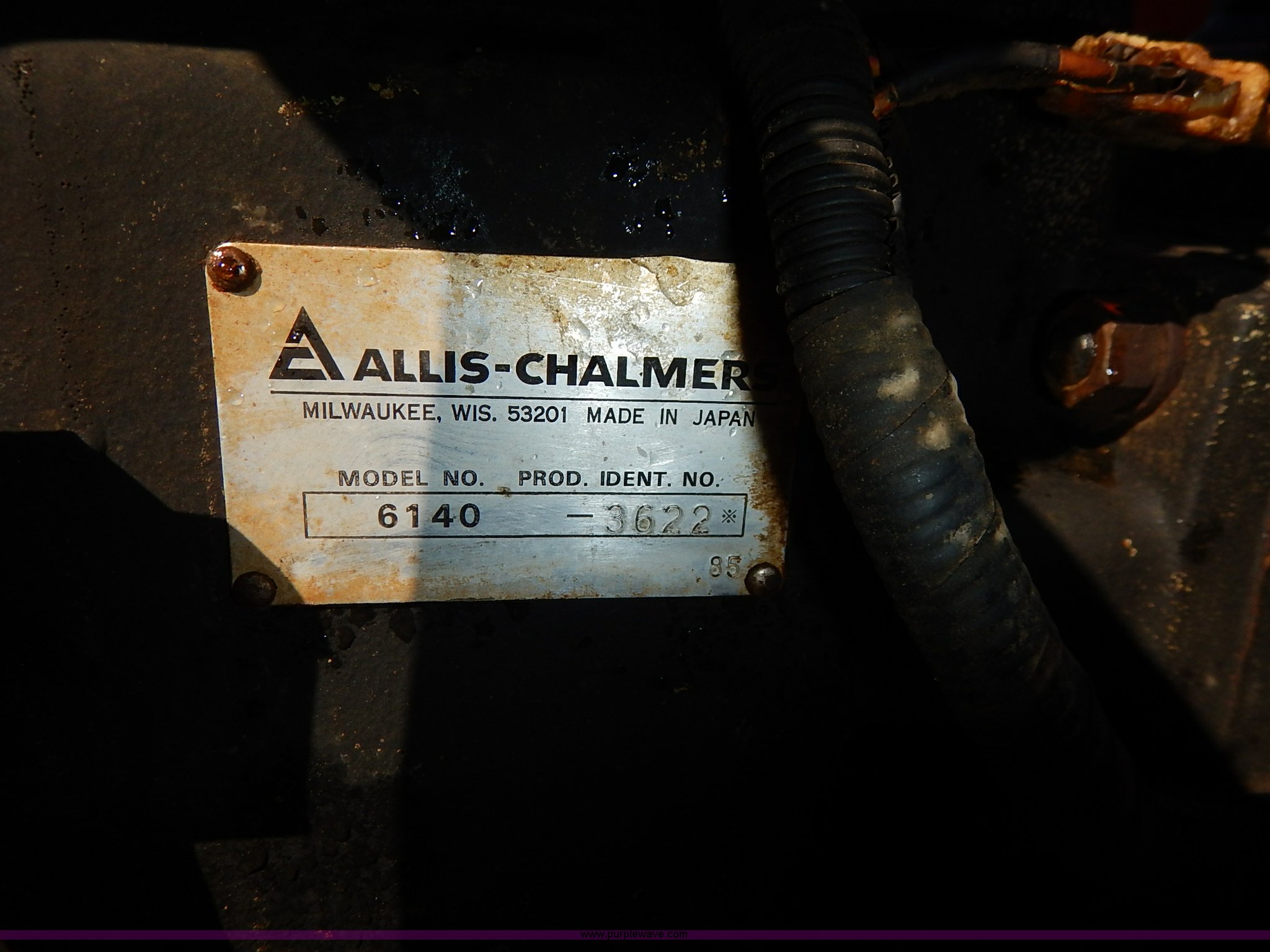Purple Wave is selling a used Tractor in Kansas. This item is a 1985 Allis Chalmers 6140 tractor with the following: 1,815 hours on meter, Toyosha three cylinder diesel engine, Manual transmission, 5F-1R gears, Front and rear work lights, Flashers, Three point, Draw bar, 540 PTO, (2) rear hydraulic remote sets, 13 gallon fuel tank, 7.50-16 front tires, 13.6-28 rear tires, Recently replaced alternator, Serial 3622