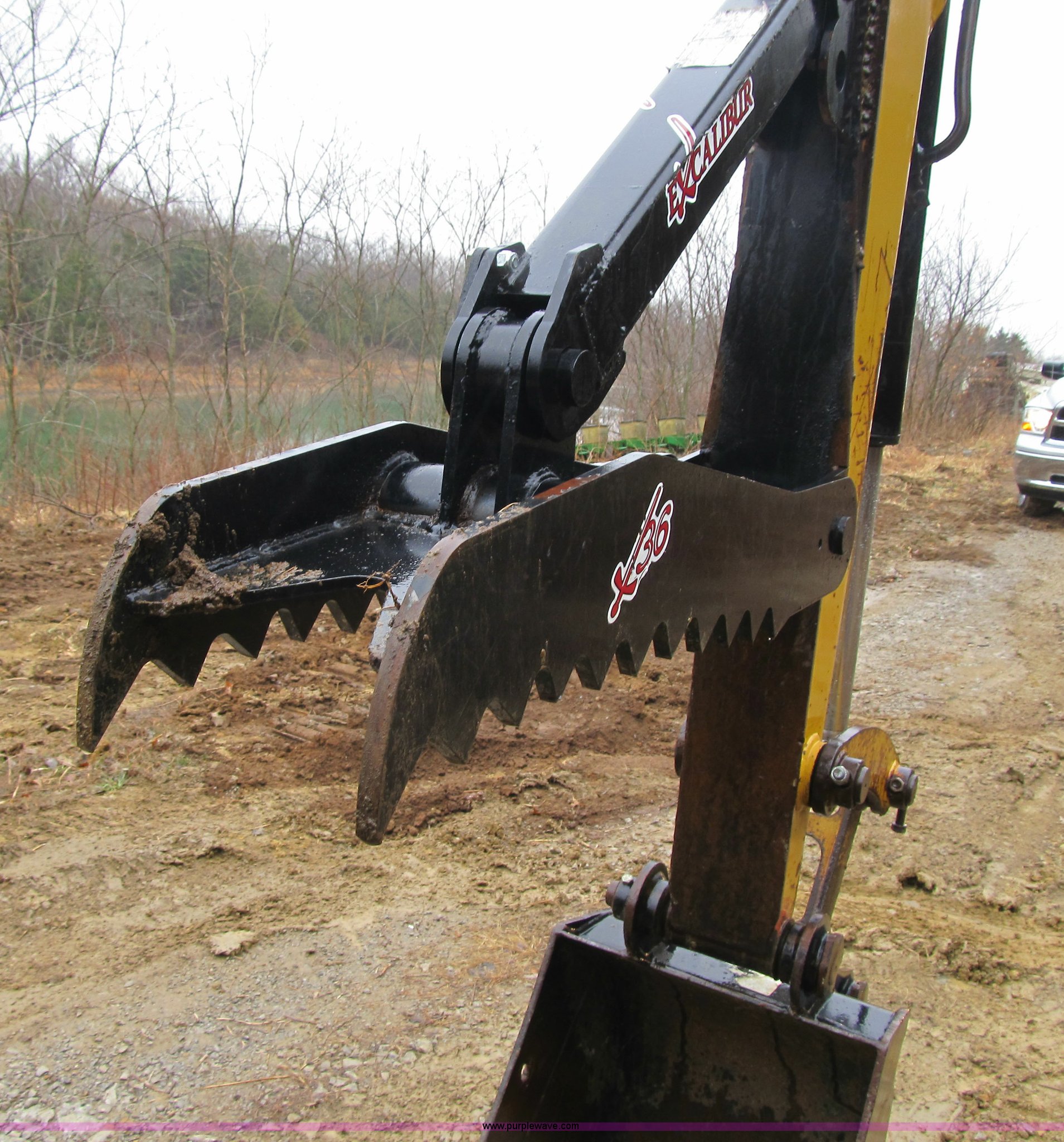 2003 Caterpillar 304CR compact excavator. 3,128 hours on meter, Mitsubishi S4Q2 153 C.I.D. four cylinder diesel engine 42.2 HP, Hydrostatic transmission Two speed travel, Canopy, Joystick and foot controls, 70"L stick, Auxiliary hydraulics, Caterpillar 20"W bucket (2) bolt-on teeth, Excaliber 36" manual thumb, 78"W back fill blade, Counter weights, Four bottom rollers, 15"W rubber tracks, 10,844 lbs. base operating weight, Serial NAD00893. View equipment video. SW 5508 County Rd. Hume, MO 64752