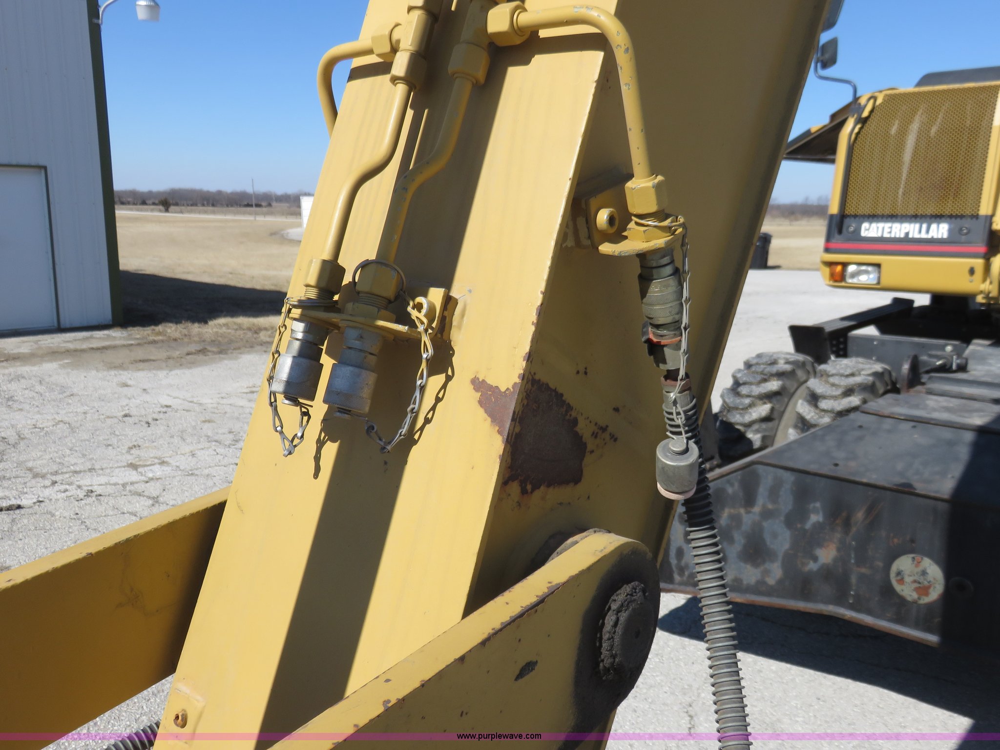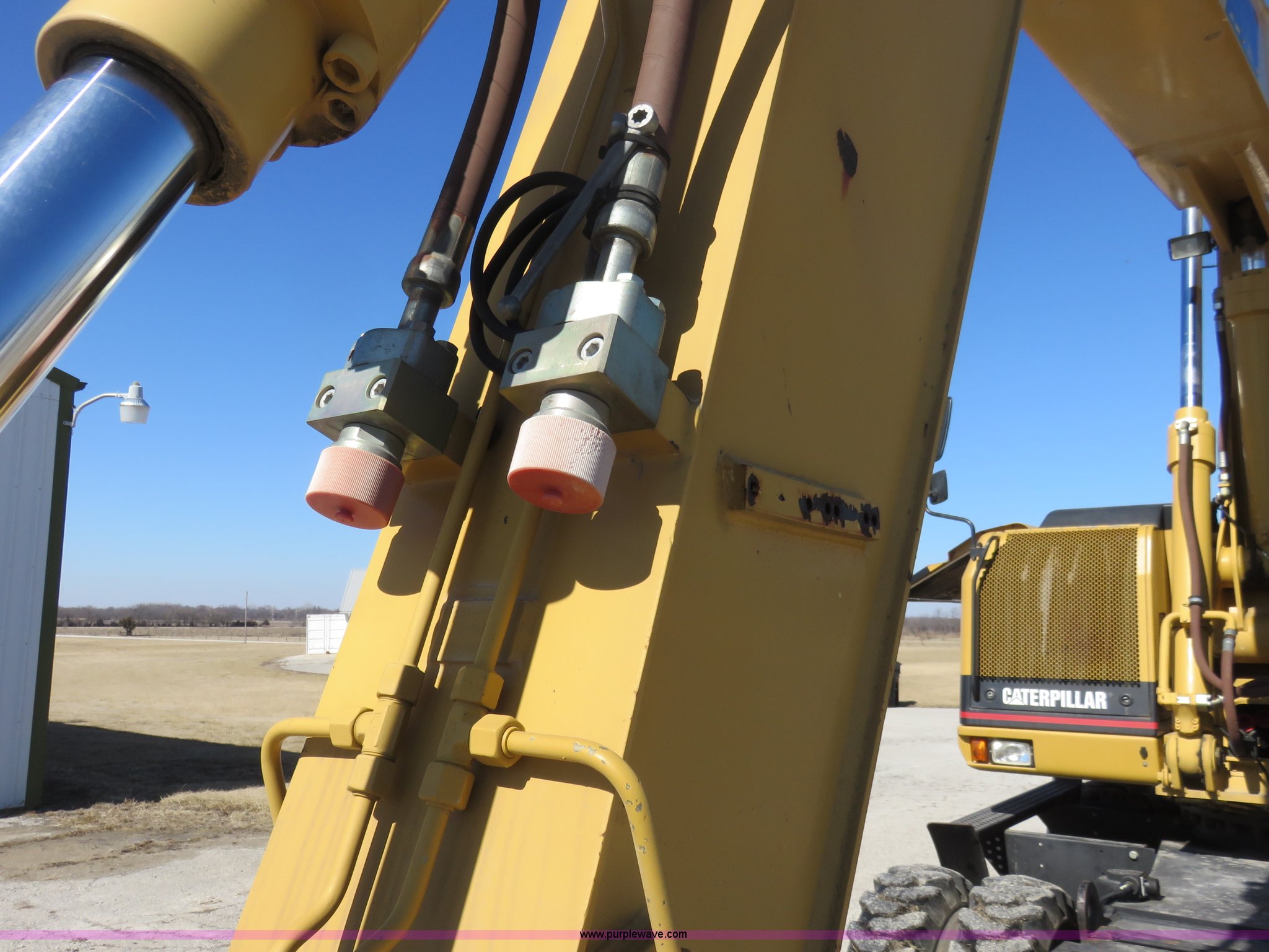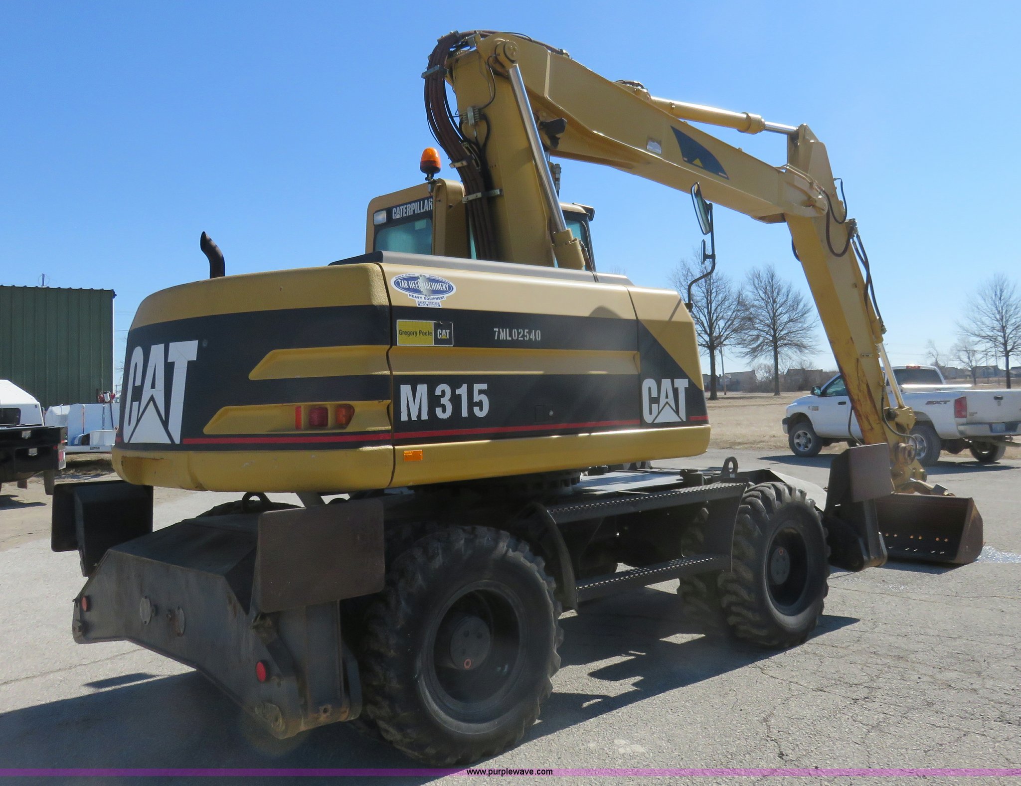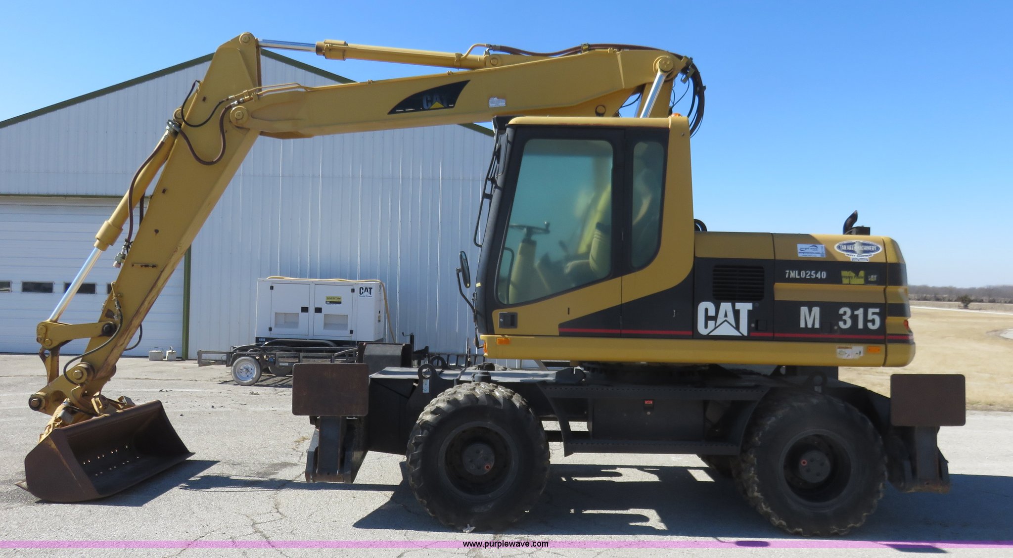 Purple Wave is selling a used Rubber Tired Excavator in Kansas. This item is a 2001 Caterpillar M315 rubber tire excavator with the following: 1,505 hours on meter, Perkins 3.9L four cylinder turbo diesel engine, 91 kW, Hydrostatic transmission, EROPS, AC and heat, Spring suspension seat, Windshield wipers, Joystick controls, Front work lights, Standard boom, 8.5' stick length, 71"W bucket, Weld-on cutting edge, Auxiliary hydraulics, Bridgestone 10.00-20 tires, 35,170 lbs. base operating weight, Serial CAT0M315J7ML02540