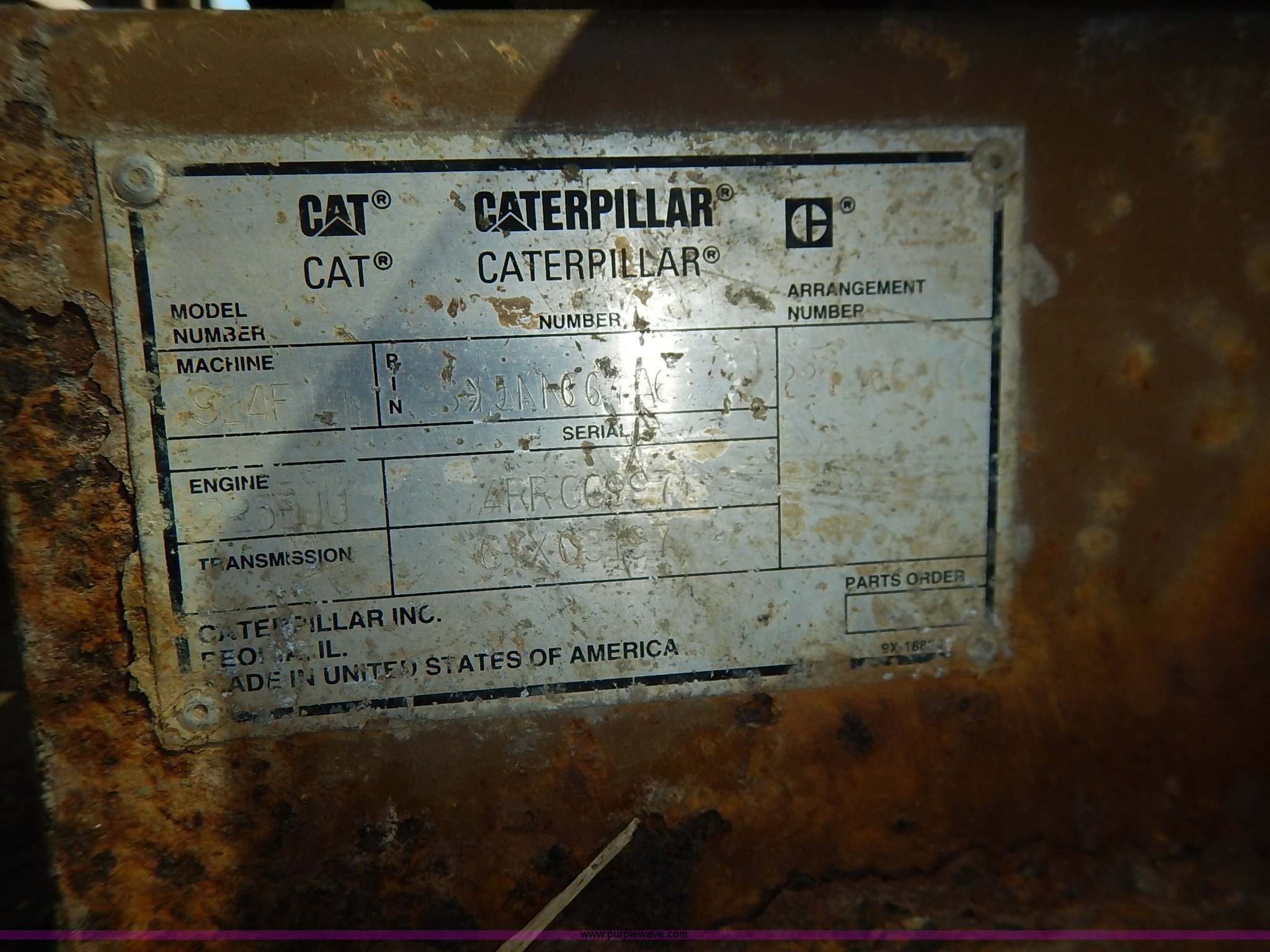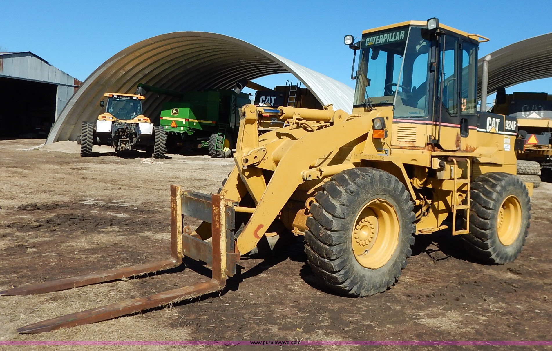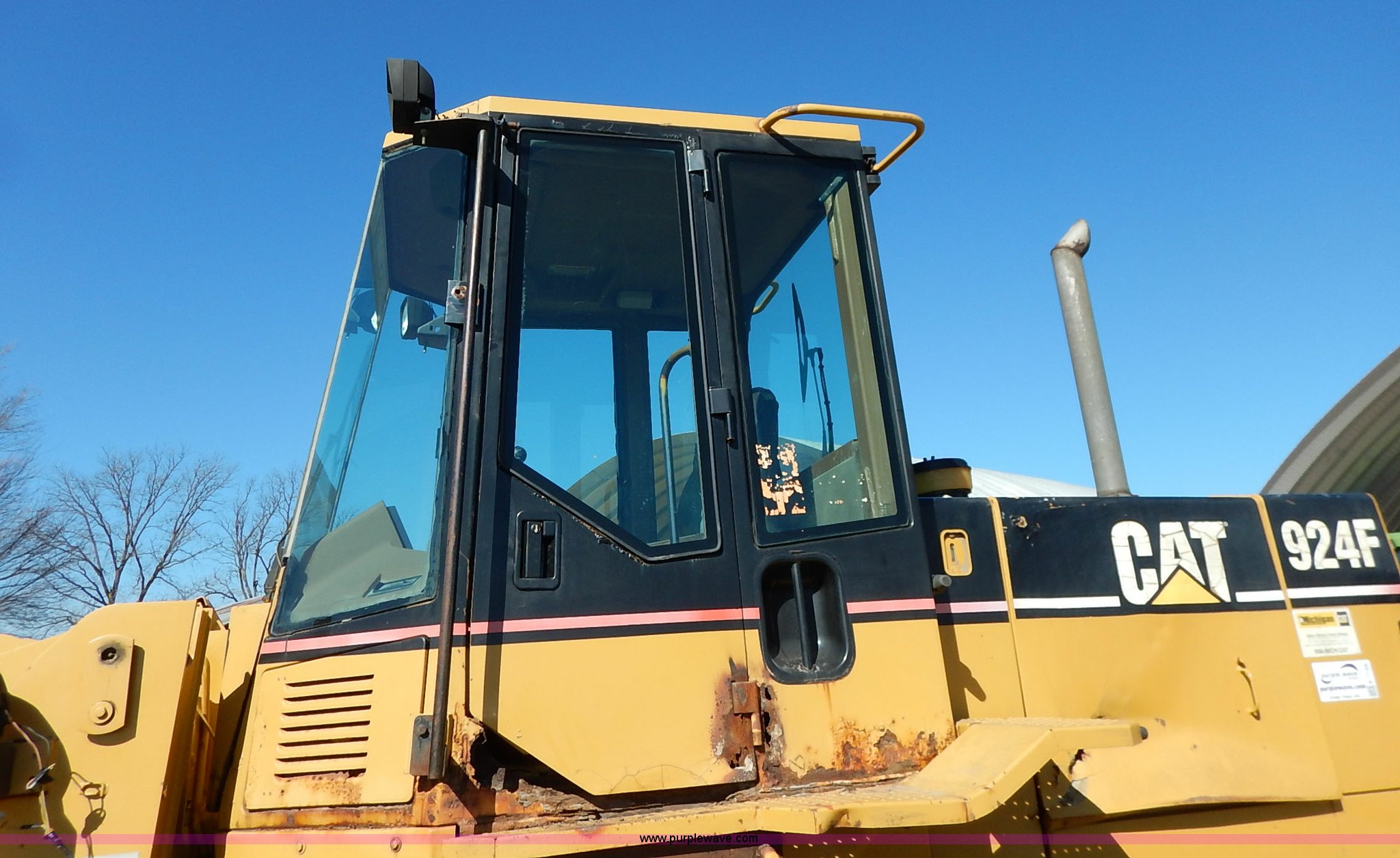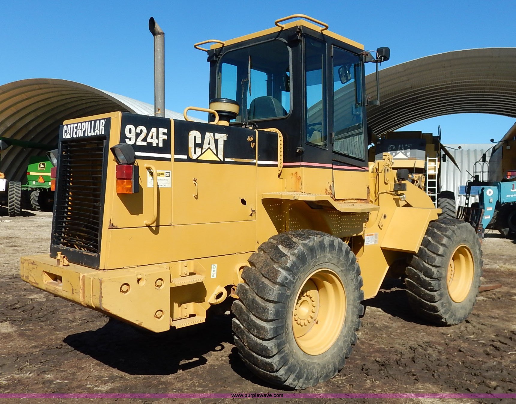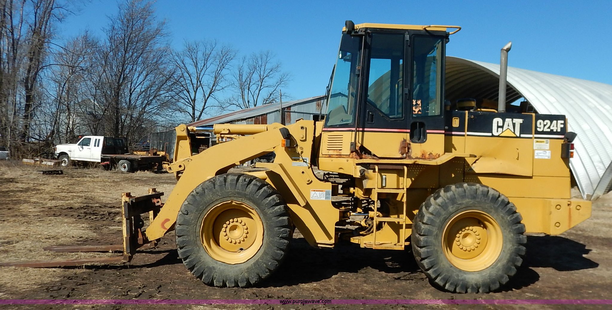 Purple Wave is selling a used Wheel Loader in Kansas. This item is a 1996 Caterpillar 924F wheel loader with the following: 4,485 hours on meter, Caterpillar 3114 four cylinder diesel engine, 105 HP, Powershift transmission, 4F-3R gears, Enclosed cab, Joystick loader control, Suspension seat, 94"W bucket, 5'L x 6"W pallet forks, 17.5-25 tires, 19,900 lbs. base operating weight, Rust, Serial 5NN00756