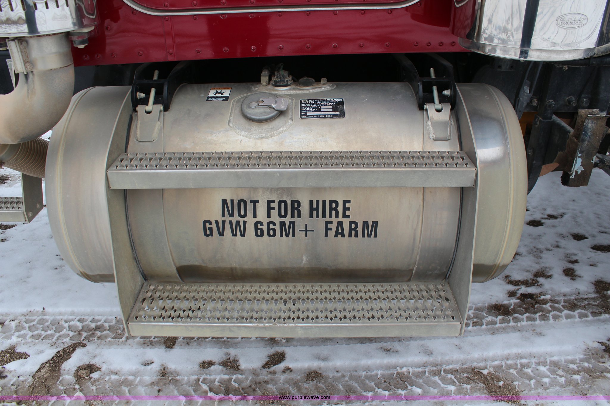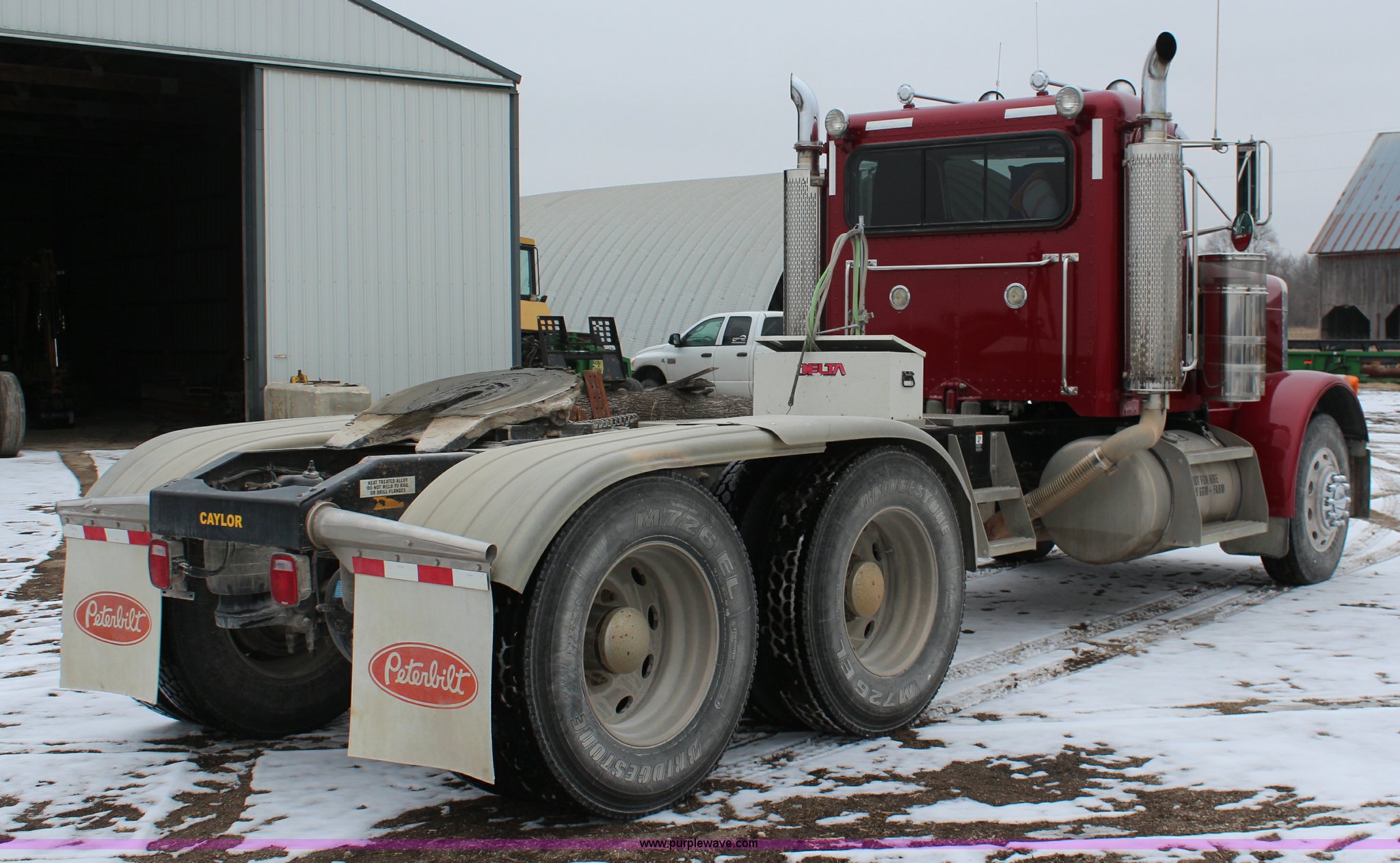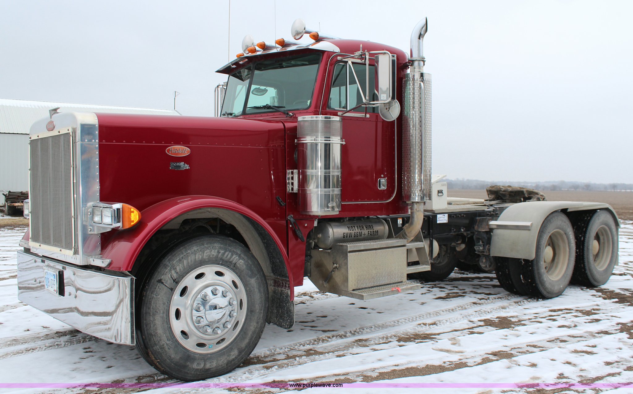 Purple Wave is selling a used Truck Tractor in Kansas. This item is a 1999 Peterbilt 379 semi truck with the following: 95,654 actual miles, Caterpillar C12 12.0L L6 diesel engine, 430 HP, Eaton Fuller 10 speed manual transmission, AC and heat, Cruise, Heated mirrors, Air suspension seat, Air ride cab, Dump valves, Exterior visor, Chrome bumper, Block heater, Air slide fifth wheel plate, 110 gallon fuel tank, Aluminum deck plate, Aluminum full fenders, Dual rear exhaust stacks, Rear lights, Air suspension, Air brakes, Jake brake, Aluminum wheels, 233" wheelbase, 11R24.5 tires, GVWR 50,000 lbs, FAWR 12,000 lbs, IAWR 19,000 lbs, RAWR 19,000 lbs, One owner