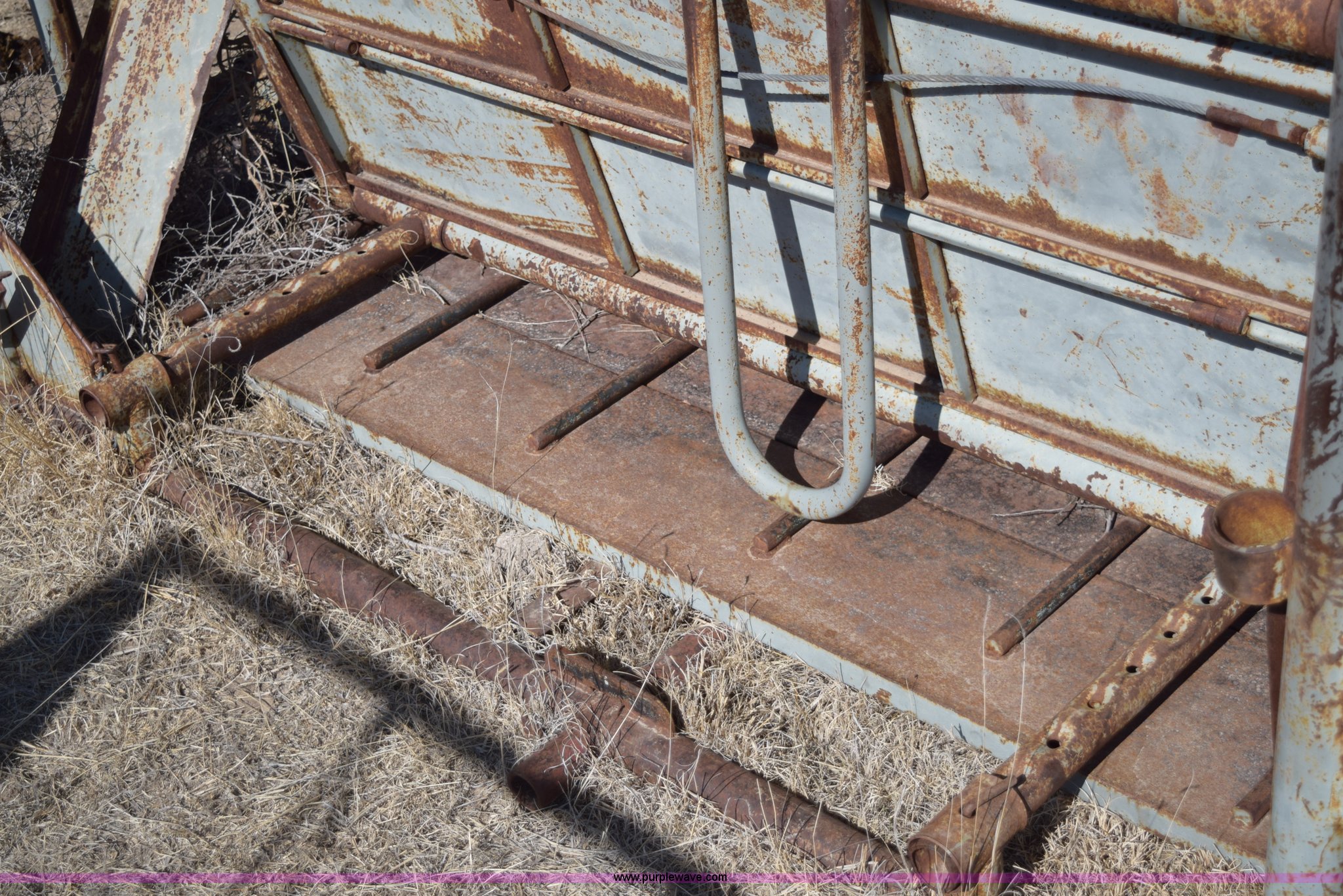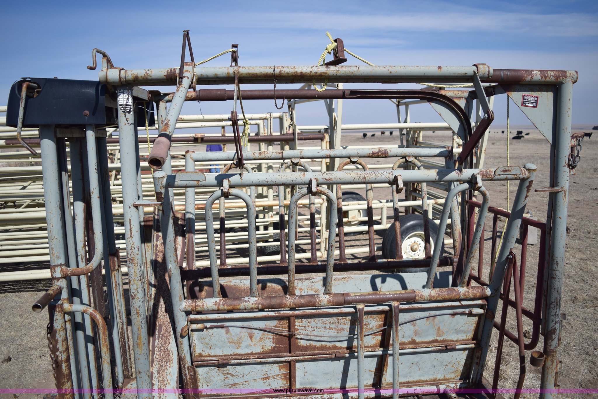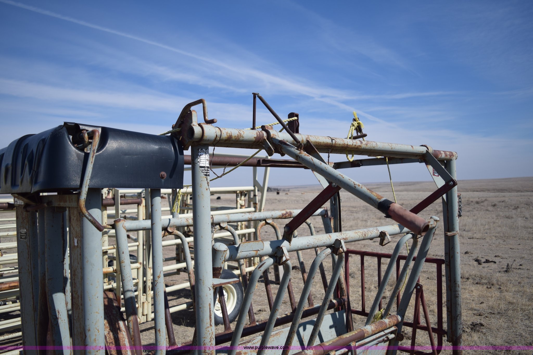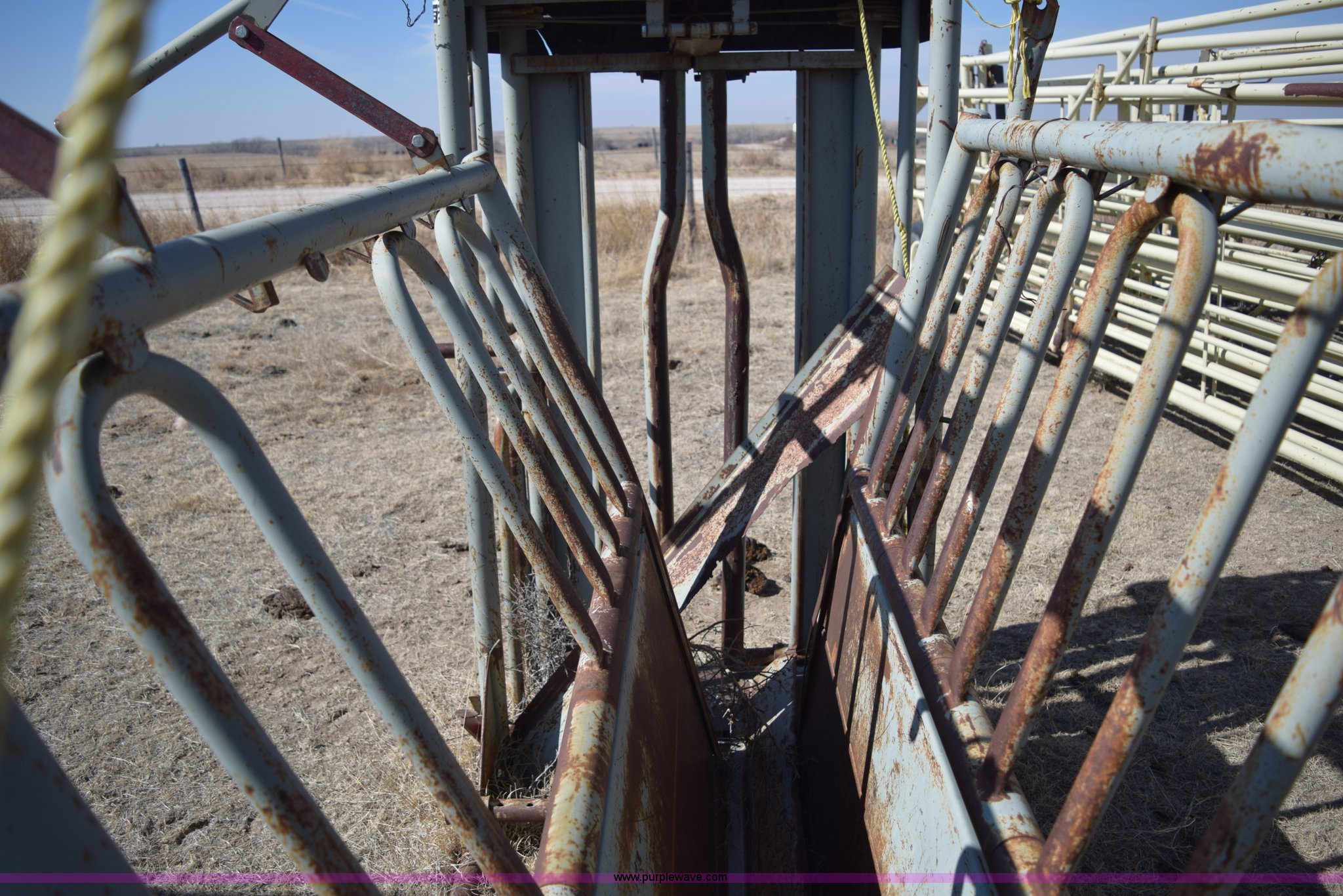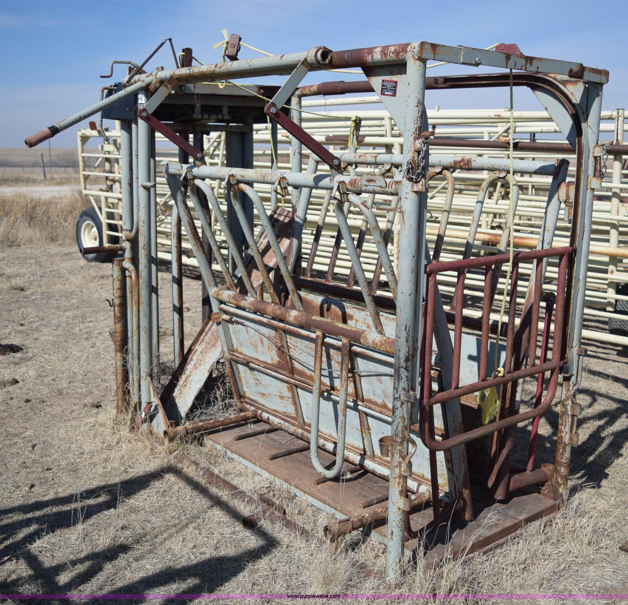 Purple Wave is selling a used Livestock Equip. in Kansas. This item is a WW squeeze chute with the following: 7'2"L x 44"W x 76"H, Steel floor, Manual operation, Serial 27416
