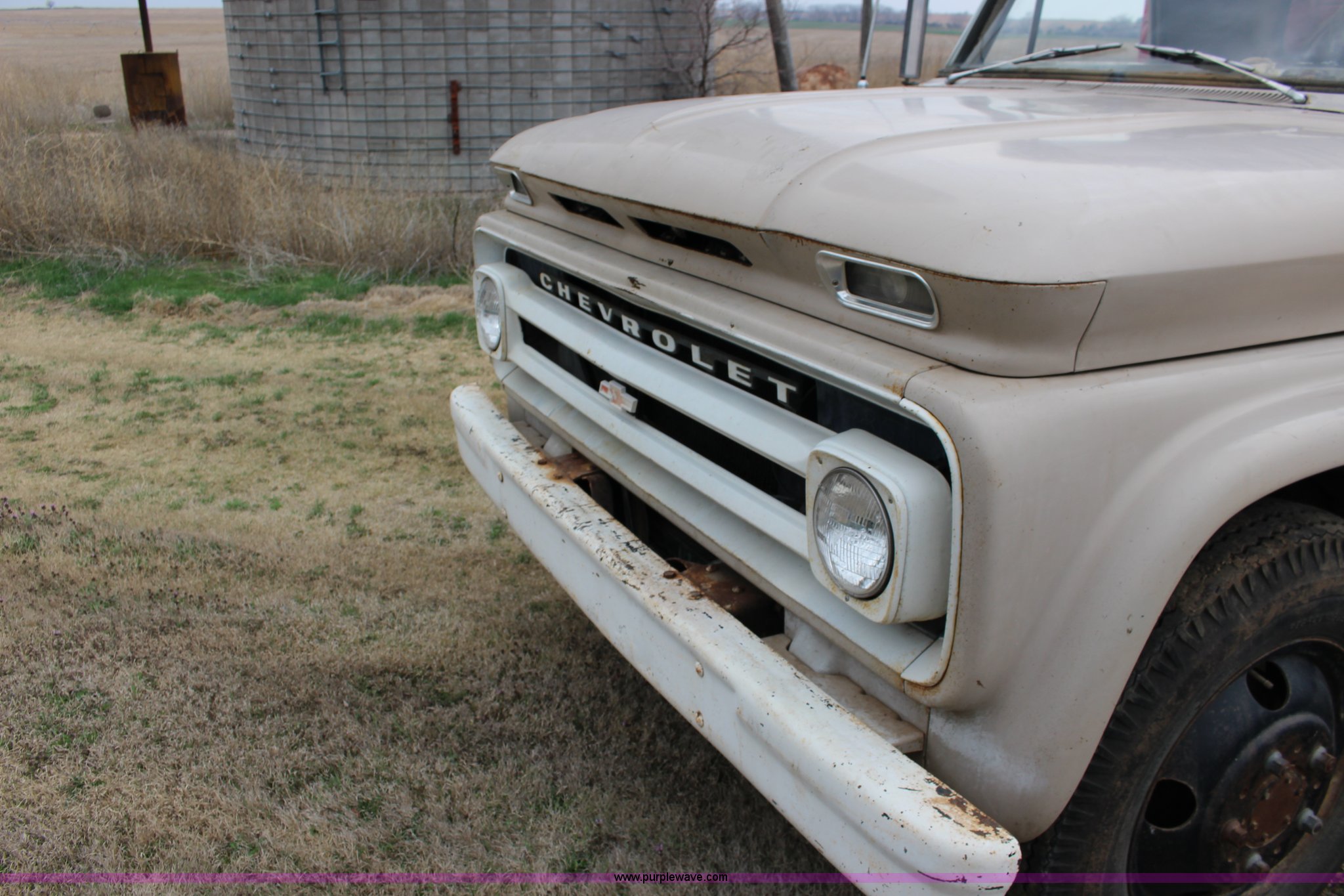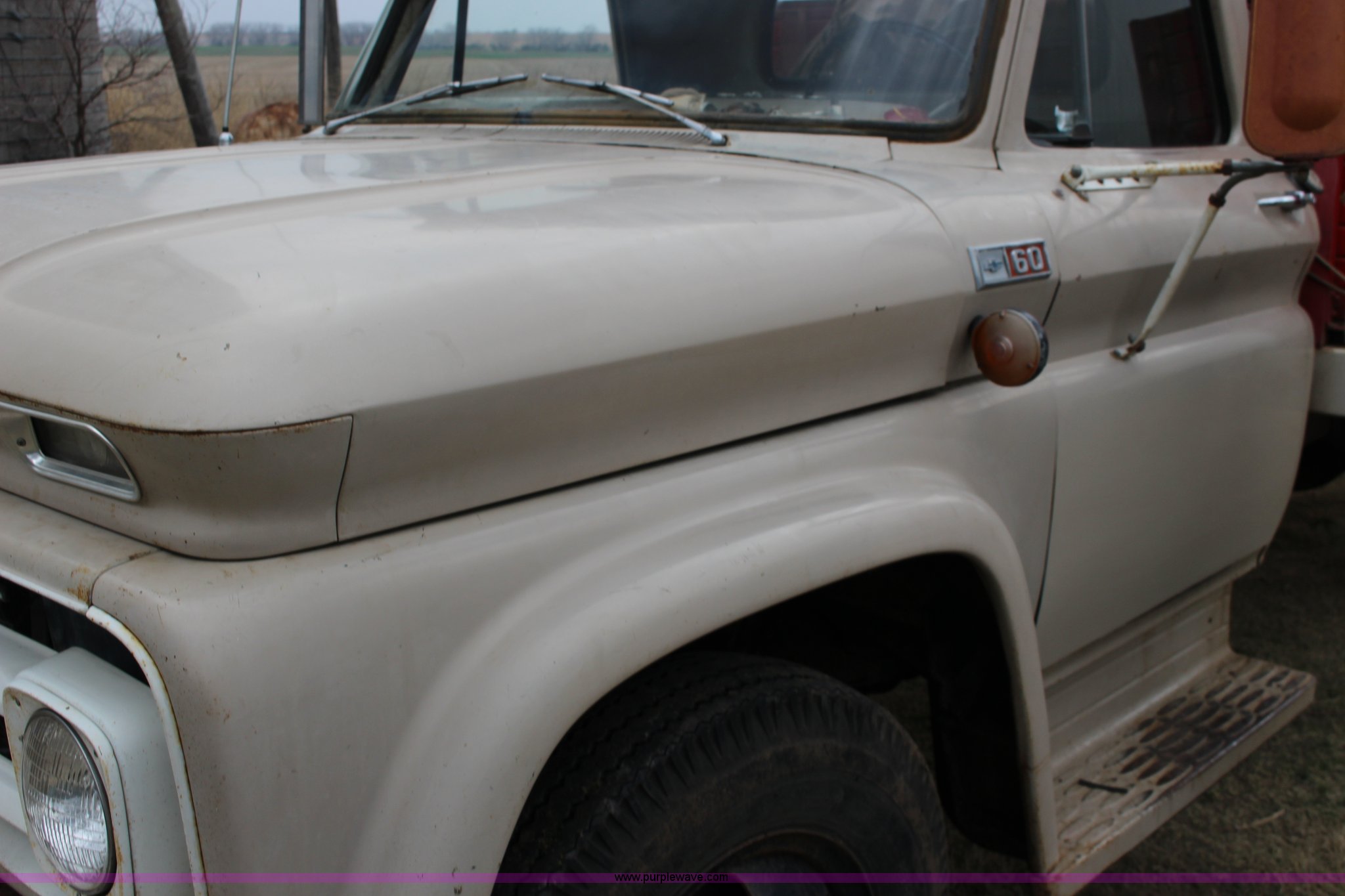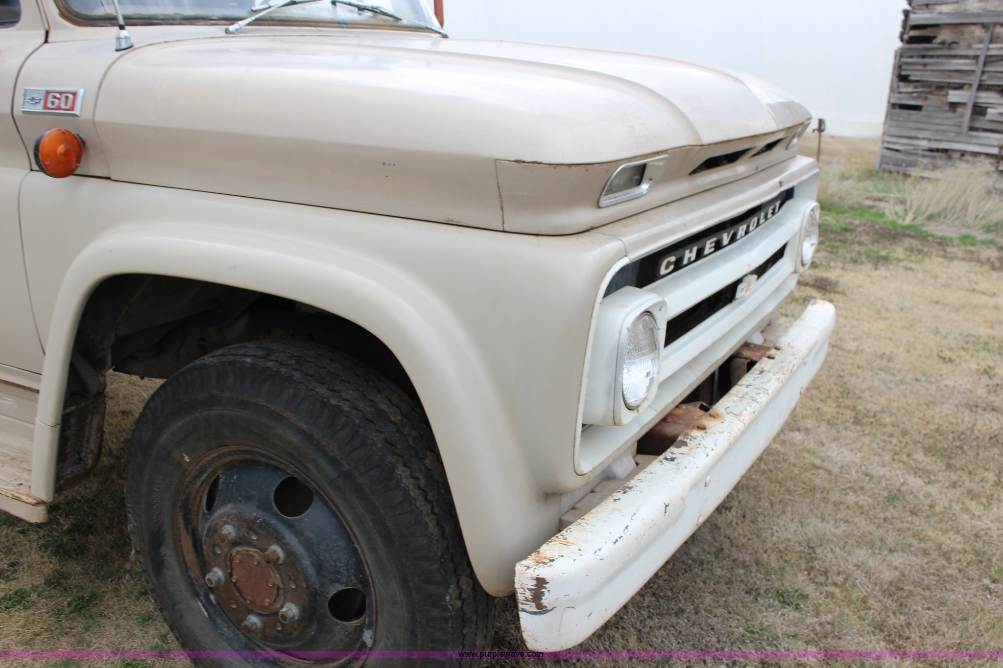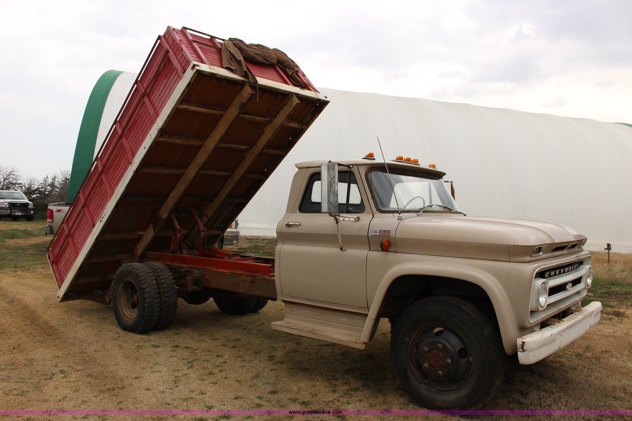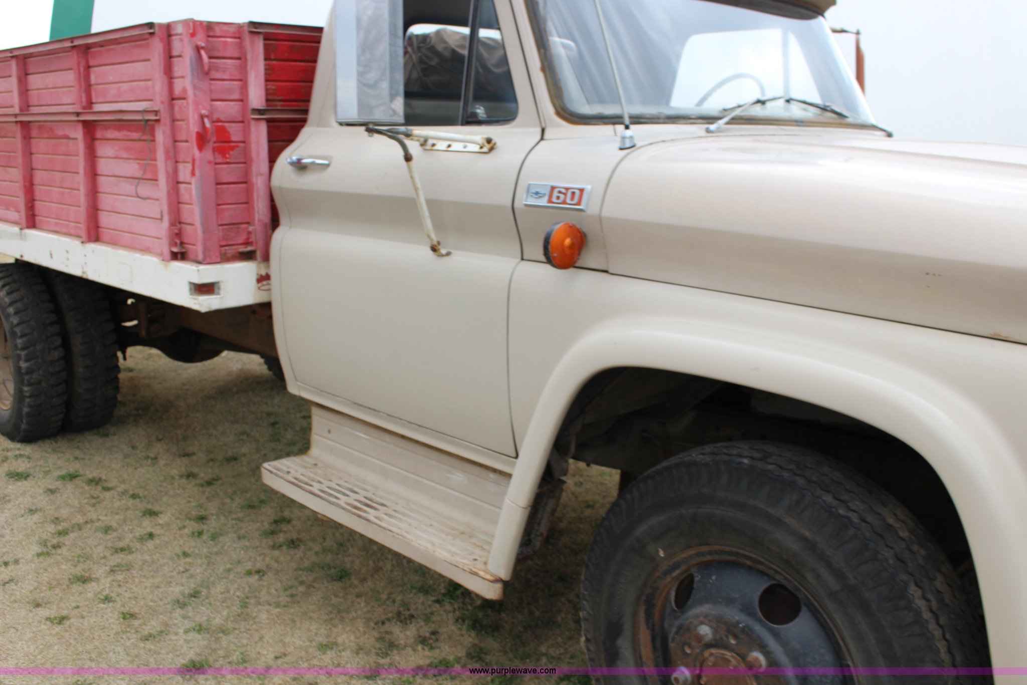 Purple Wave is selling a used Grain Truck in Kansas. This item is a 1965 Chevrolet C60 grain truck with the following: 53,779 miles on odometer, Six cylinder gas engine, Four speed manual transmission, Two speed rear end, Manual windows and locks, 186"L x 94"W bed, 30"H sides, Wood floor, Garwood hoist, PTO, Spring suspension, 8.25-20 tires, Recently replaced battery, Interior/exterior cosmetic damage