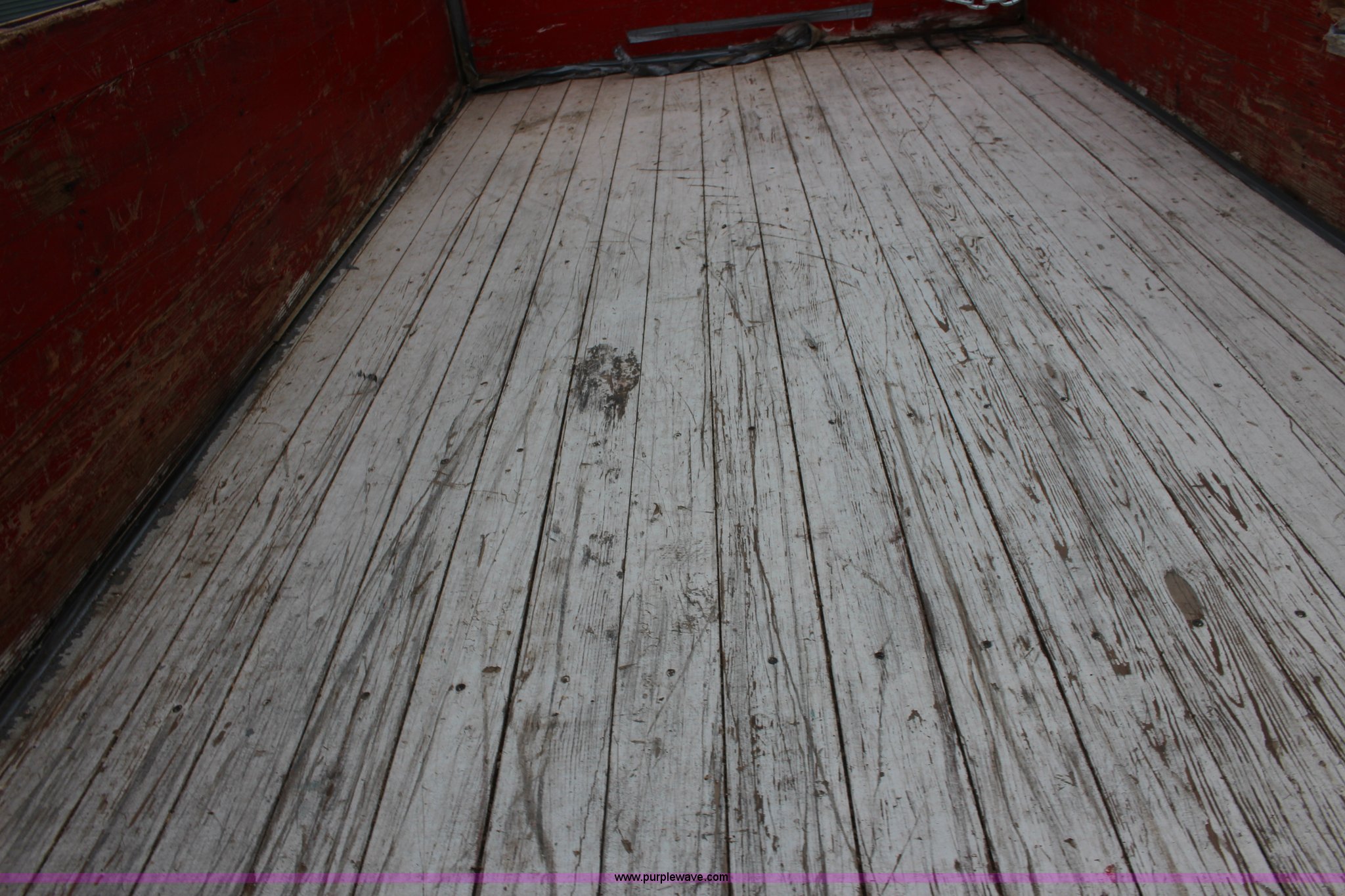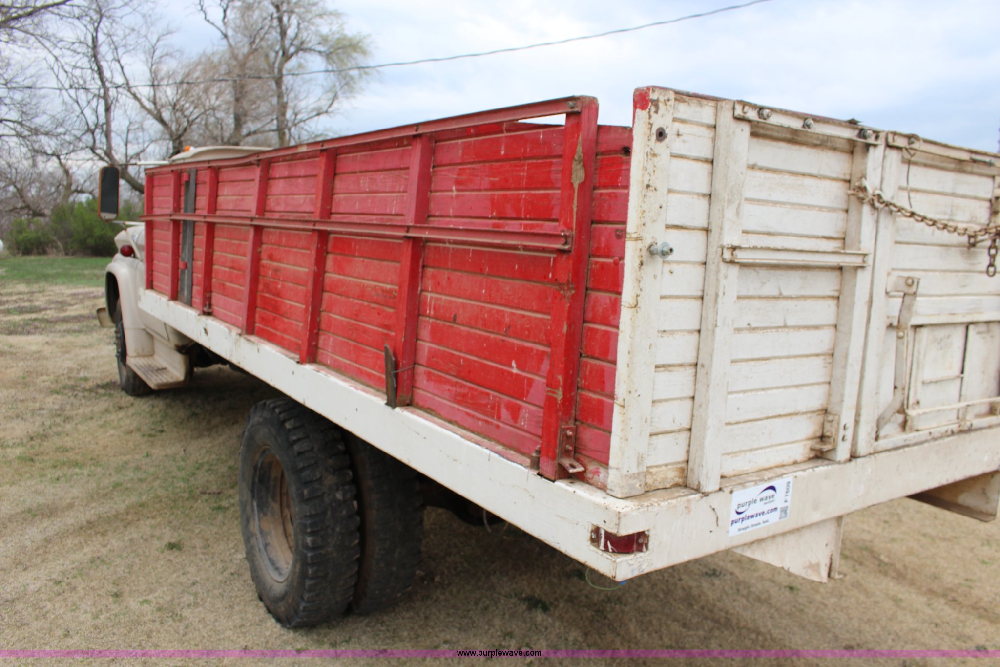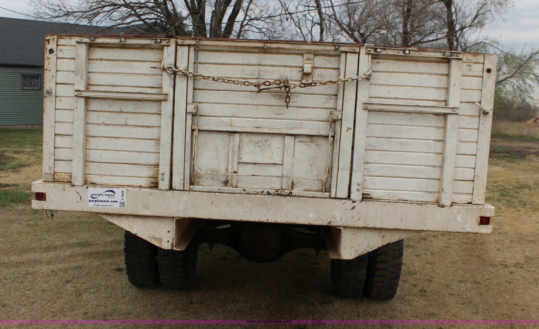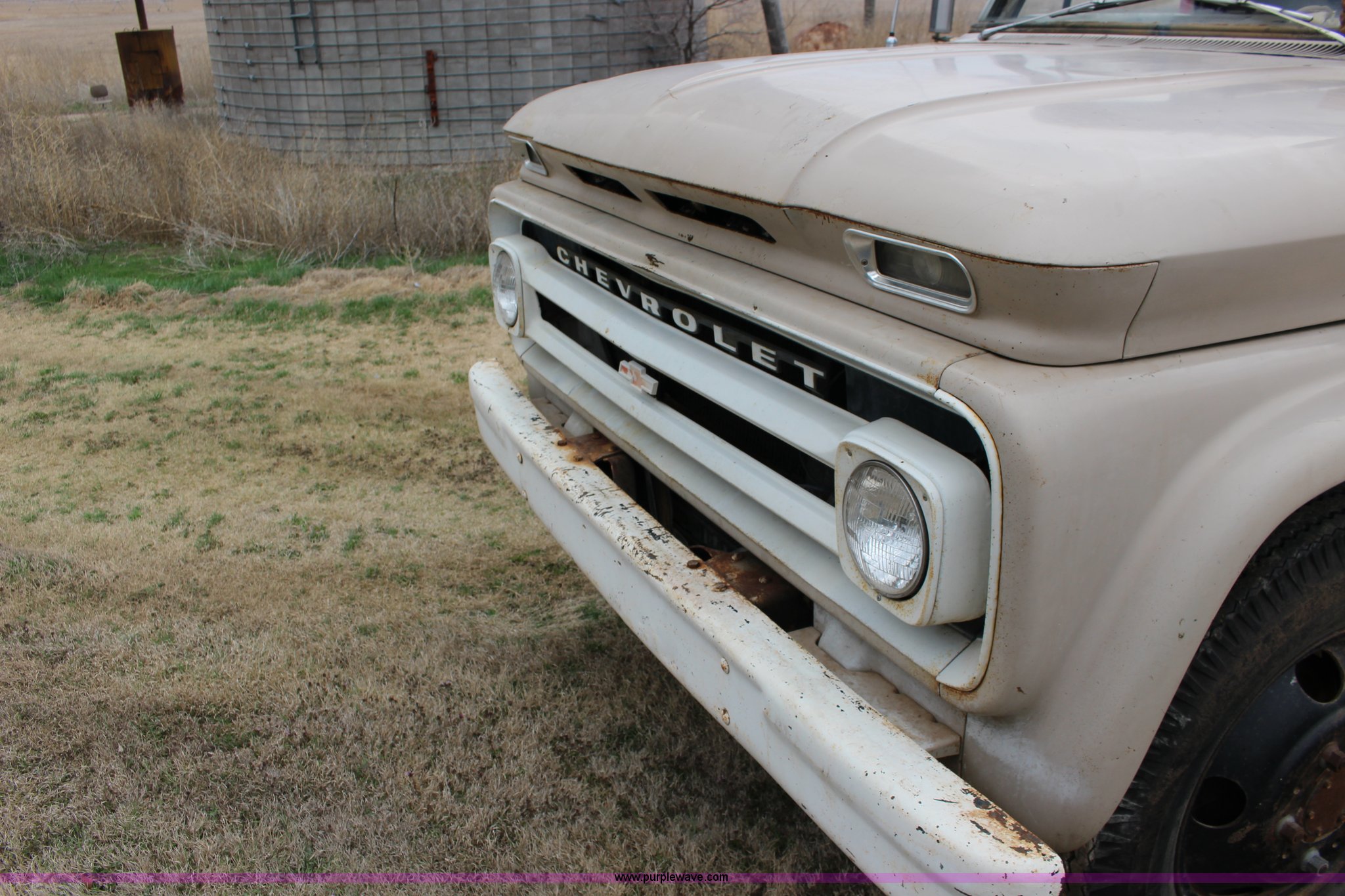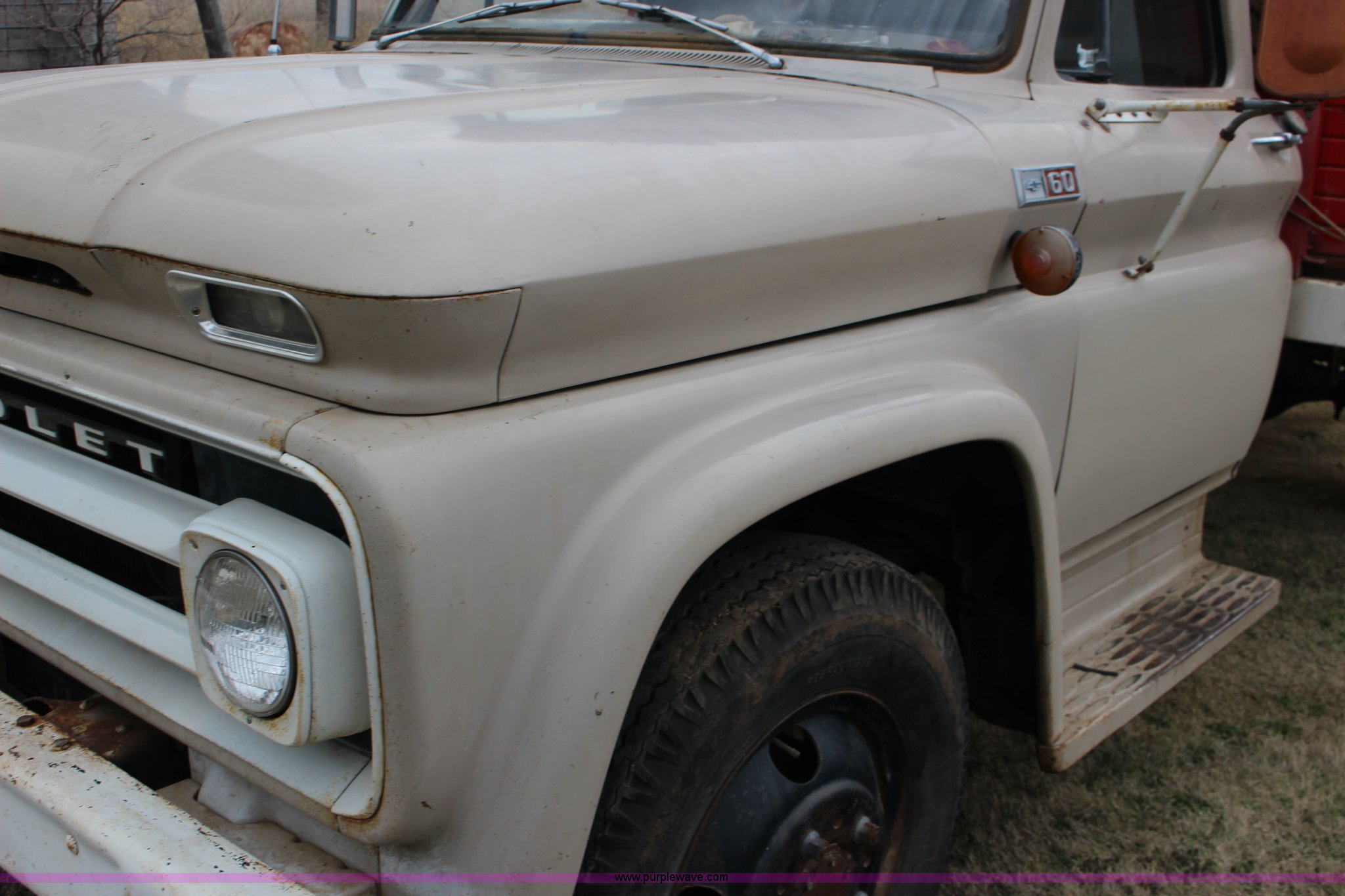 Purple Wave is selling a used Grain Truck in Kansas. This item is a 1965 Chevrolet C60 grain truck with the following: 53,779 miles on odometer, Six cylinder gas engine, Four speed manual transmission, Two speed rear end, Manual windows and locks, 186"L x 94"W bed, 30"H sides, Wood floor, Garwood hoist, PTO, Spring suspension, 8.25-20 tires, Recently replaced battery, Interior/exterior cosmetic damage