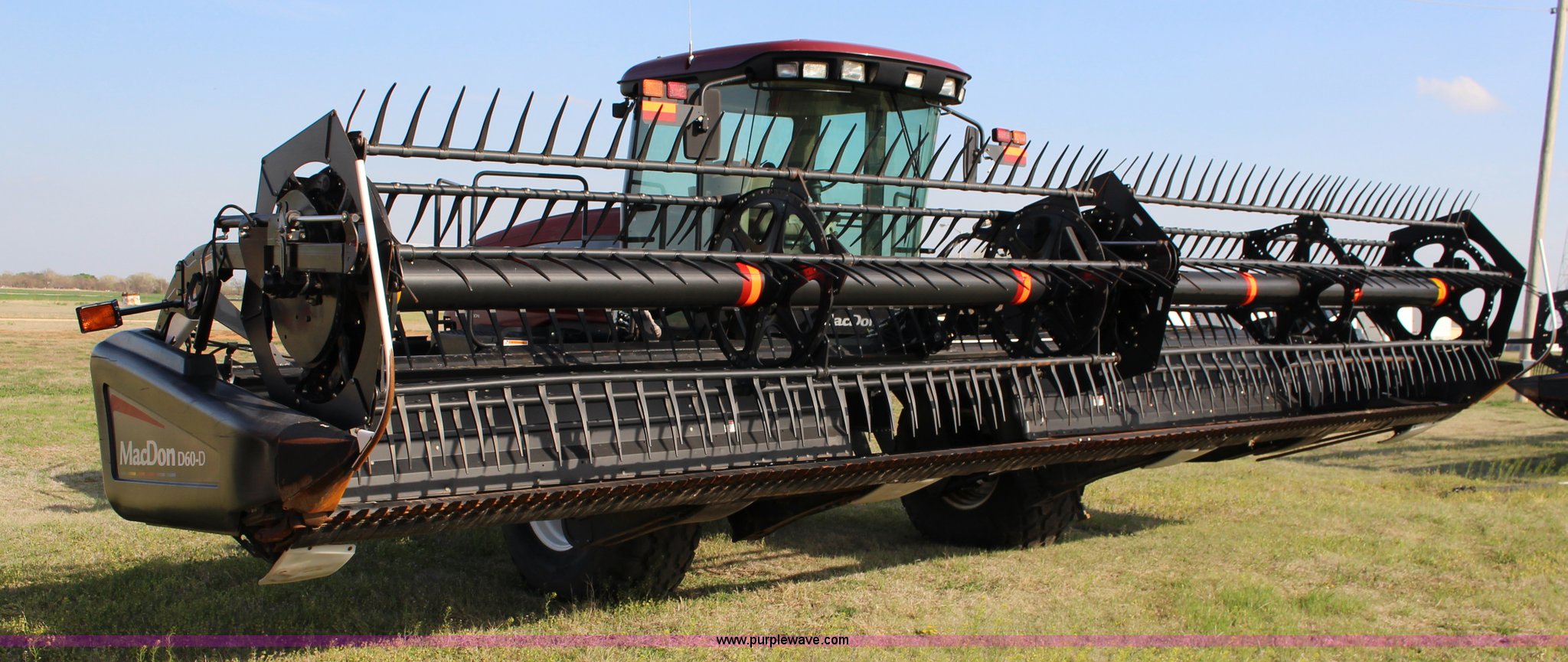 Purple Wave is selling a used Windrower Self Propelled in Oklahoma. This item is a 2008 MacDon M150 self-propelled windrower with the following: 1,775 hours on meter, Six cylinder diesel engine, Hydrostatic transmission, Enclosed cab, AC and heat, AM/FM/CD, Auxiliary input,, Tilt, Suspension seat, Front and rear wipers, Instructor's seat, Dual direction 23.1-26 front tires, 16.5-16.1 rear tires, Head selling as item D1435, Serial 181132