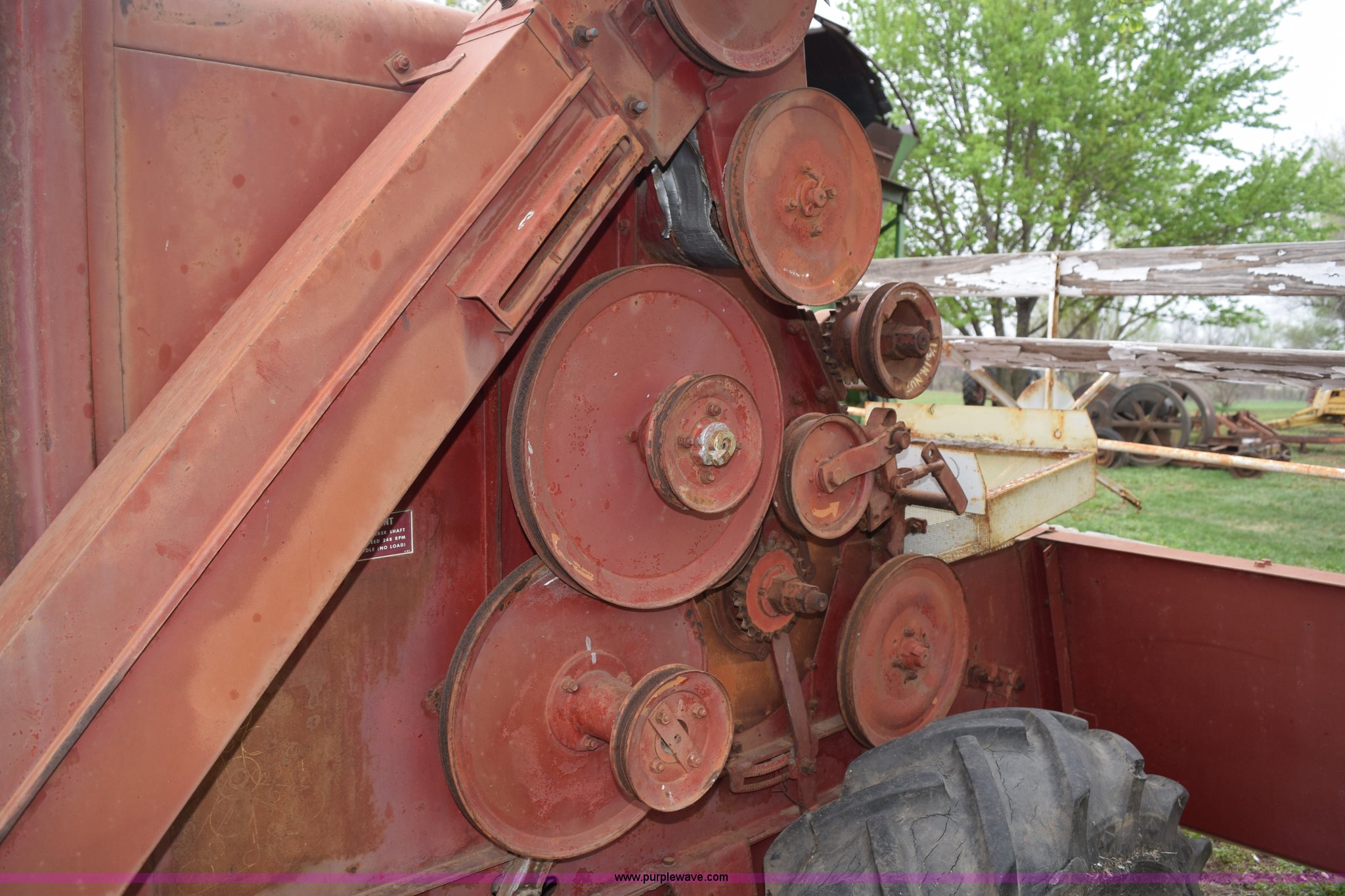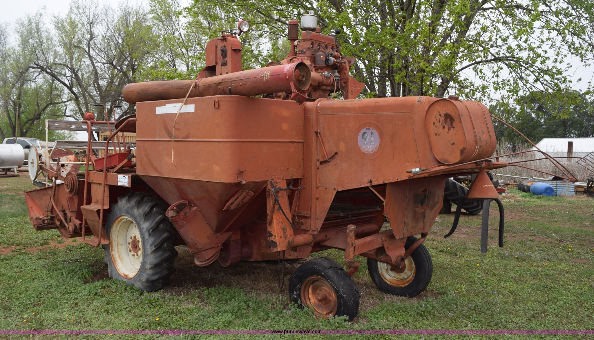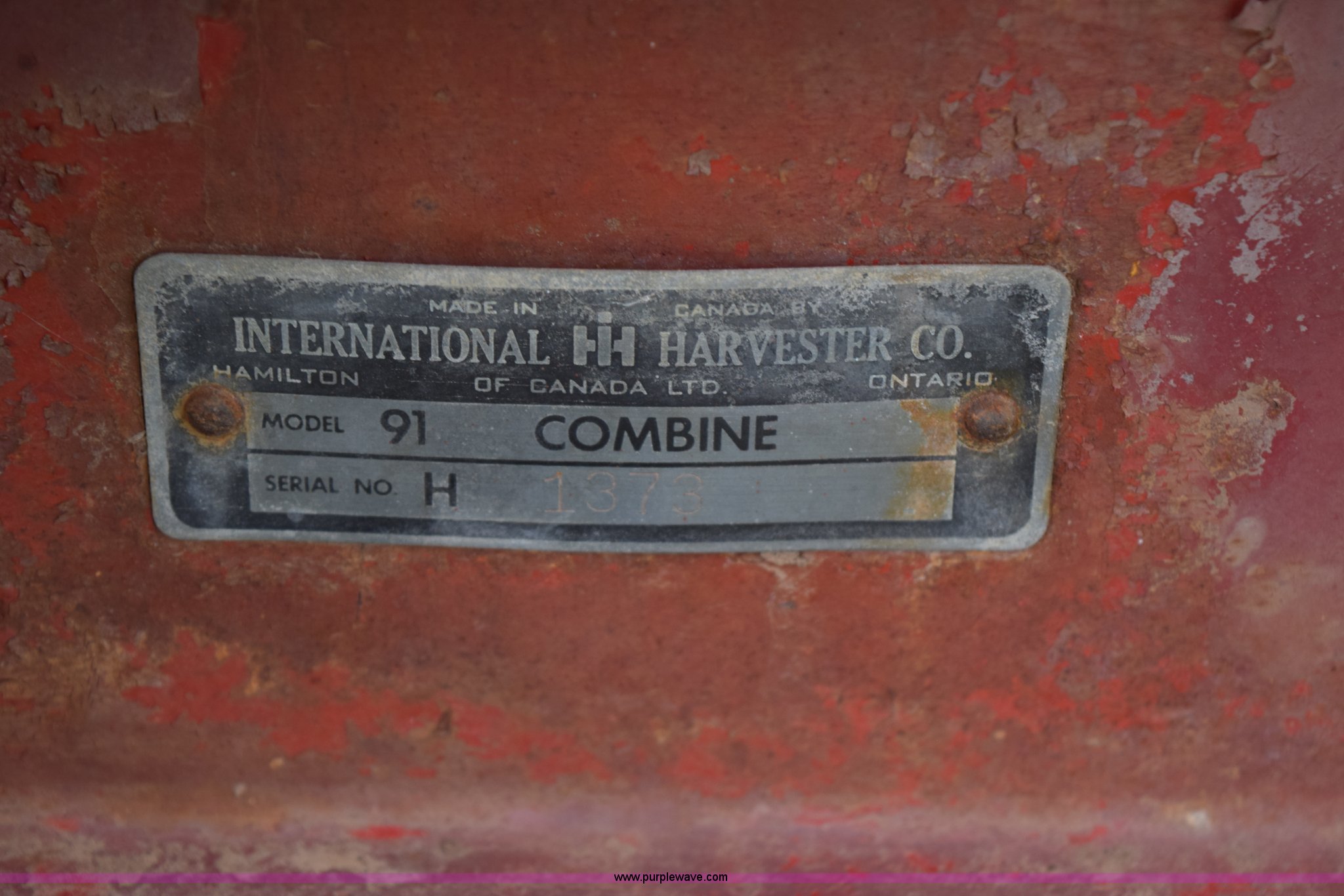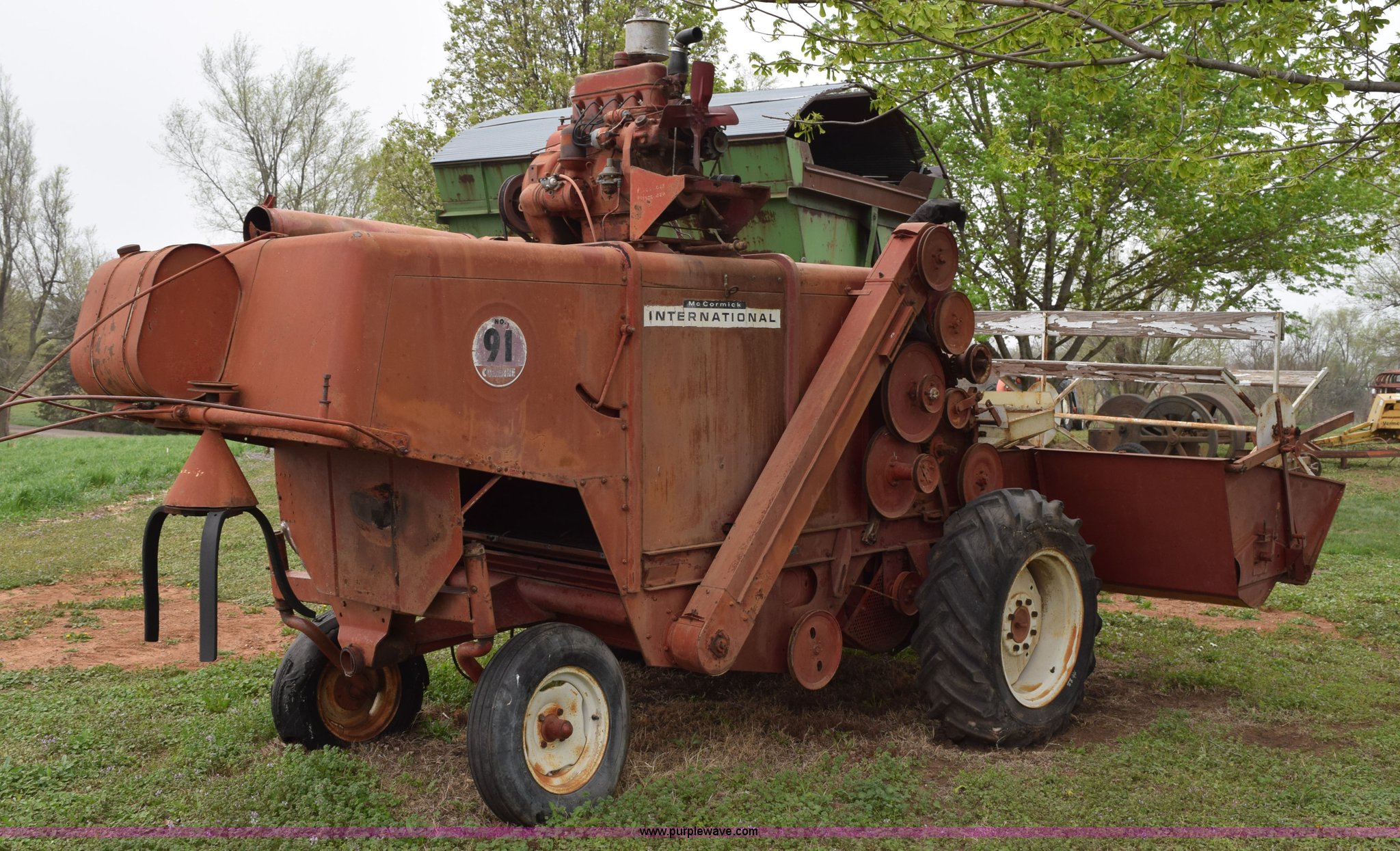 Purple Wave is selling a used Combine in Kansas. This item is a 1968 Mccormick International 91 combine with the following: International four cylinder gas engine, Serial H1399, Variable speed transmission, Spring suspension seat, 10' header, Adjustable reel, Damaged, Straw spreader, Toolbox, 12.4-24 front tires, 6.70-15 rear tires, Belts and parts included, No radiator, Missing auger, Bin damage, Non-operational unit, Serial H1373