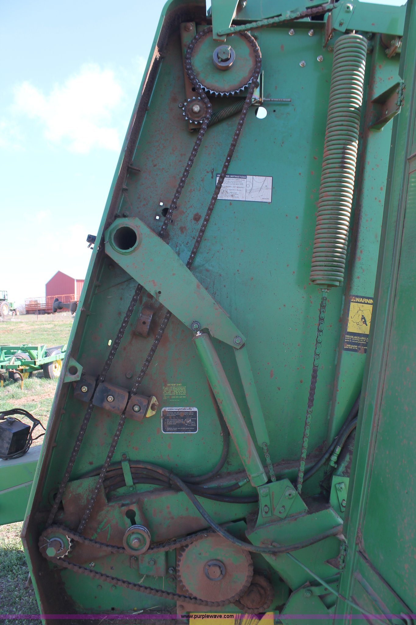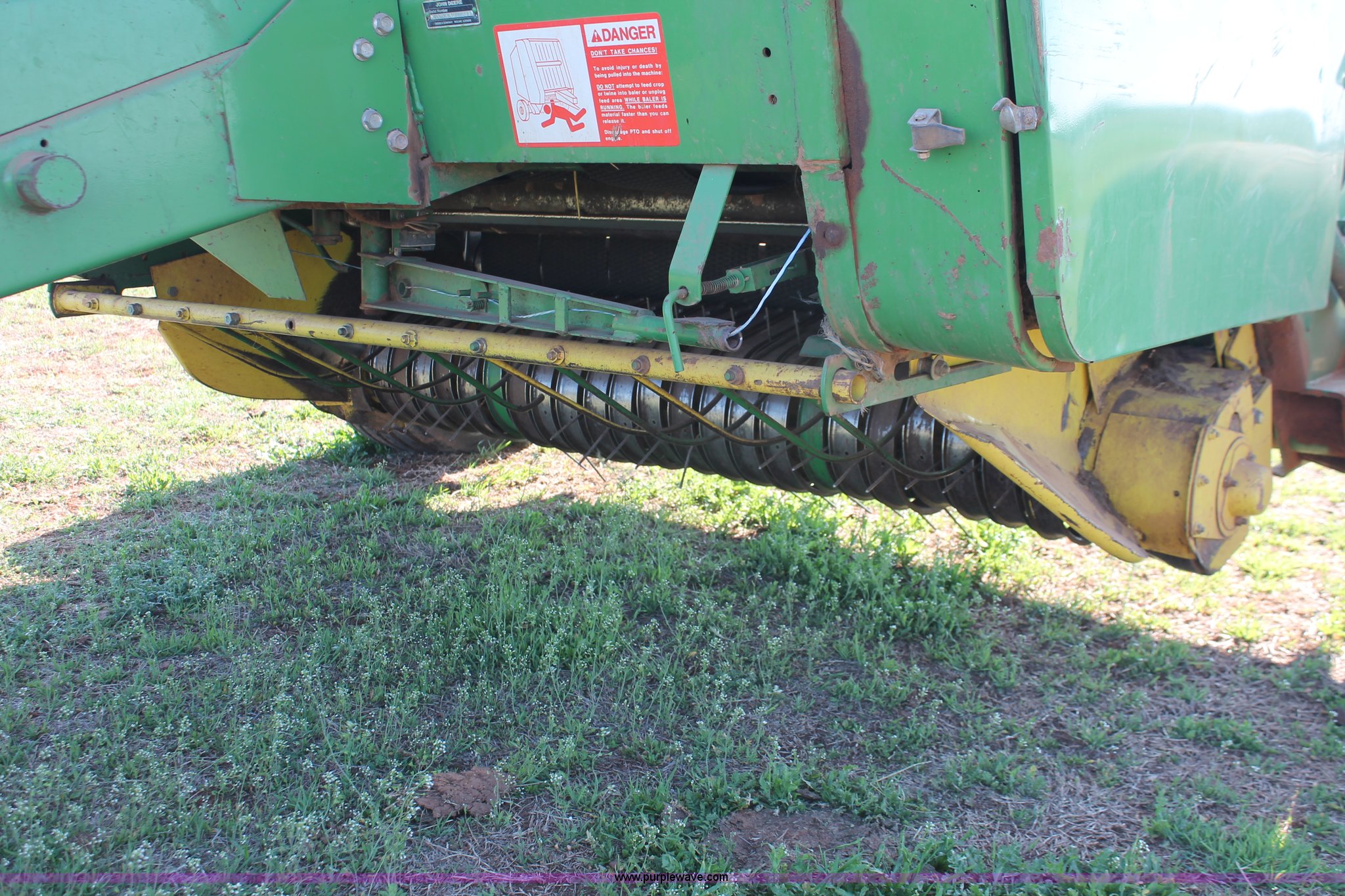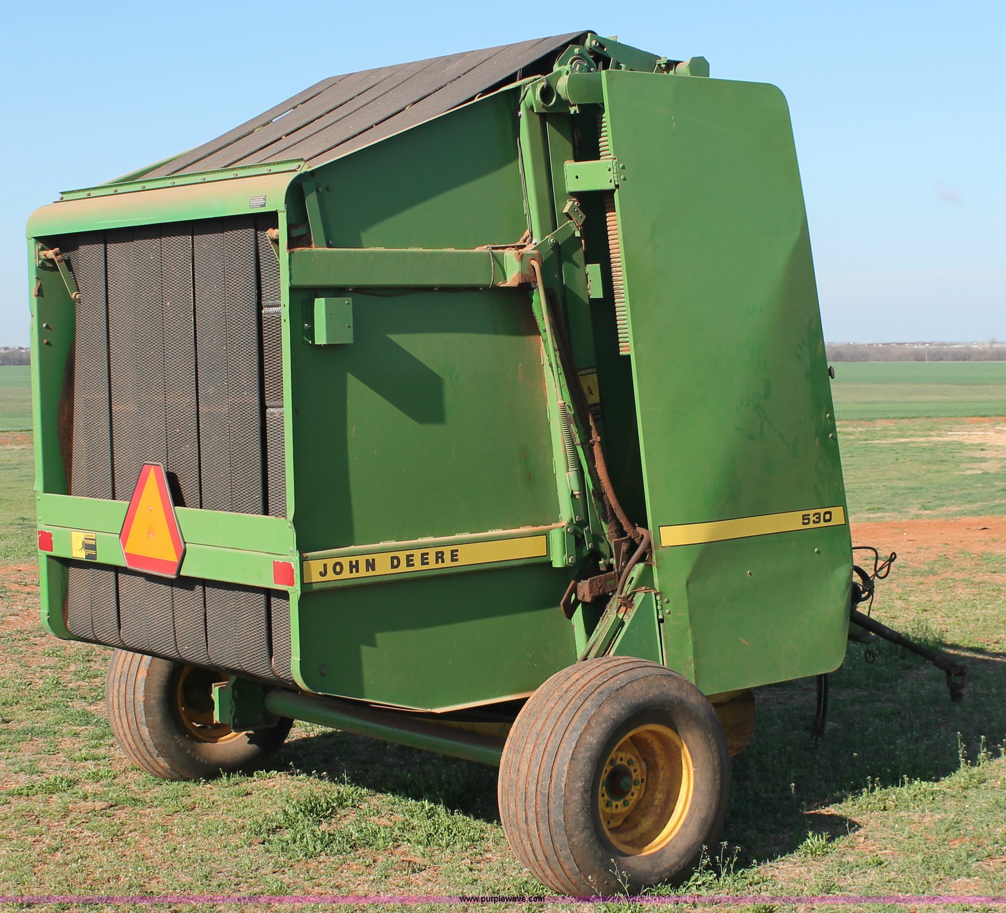 Purple Wave is selling a used Round Baler in Oklahoma. This item is a John Deere 530 round baler with the following: 5' x 6' bale capacity, Twine tie, John Deere Bale-Trak monitor, 540 PTO, Pin hitch, 31x13.50-15 NHS tires, Serial E00530X644344