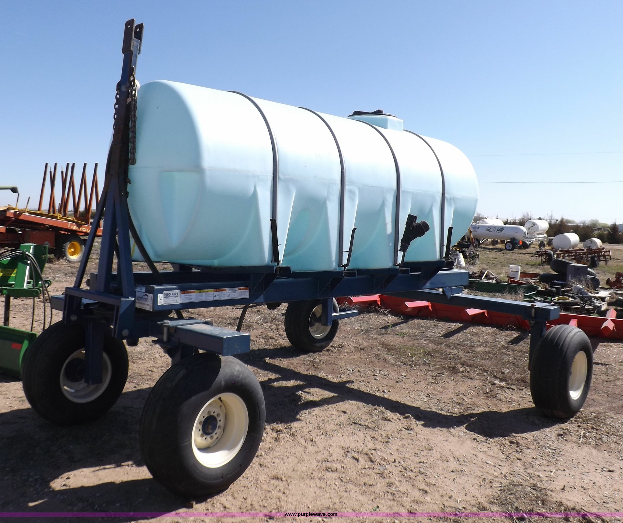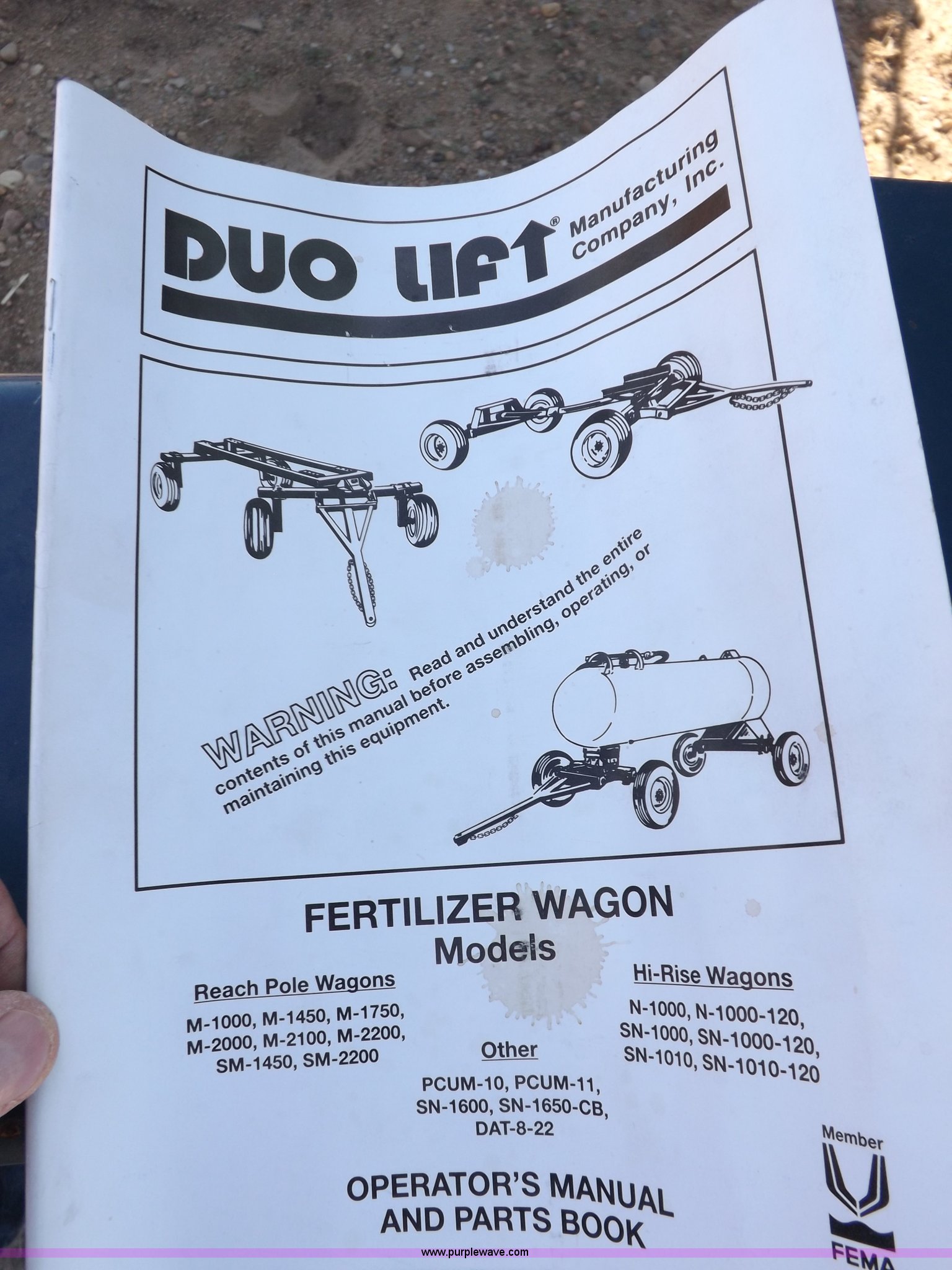 Purple Wave is selling a used Applicator Attach. in Kansas. This item is a Duo Lift fertilizer tank/dolly with the following: 1,000 gallon poly tank, 18" top fill, 2" outlet with valve, Rear 2" outlet with Tee and Wye bottom strainer, Approx. 12' 1" hose, Rear access steps, 6' folding tongue, Pin hitch, 12.5-15 tires, Serial 8203
