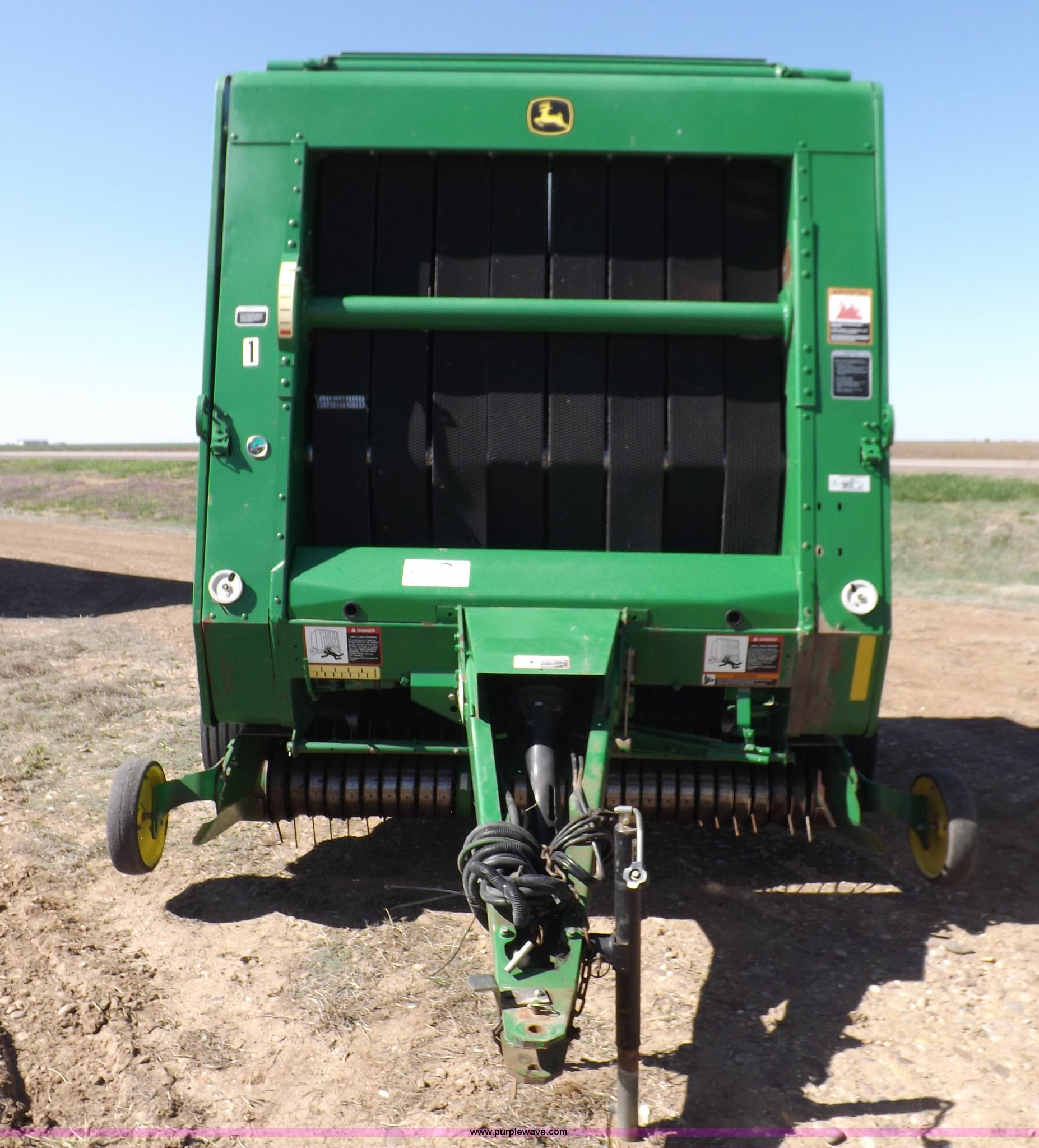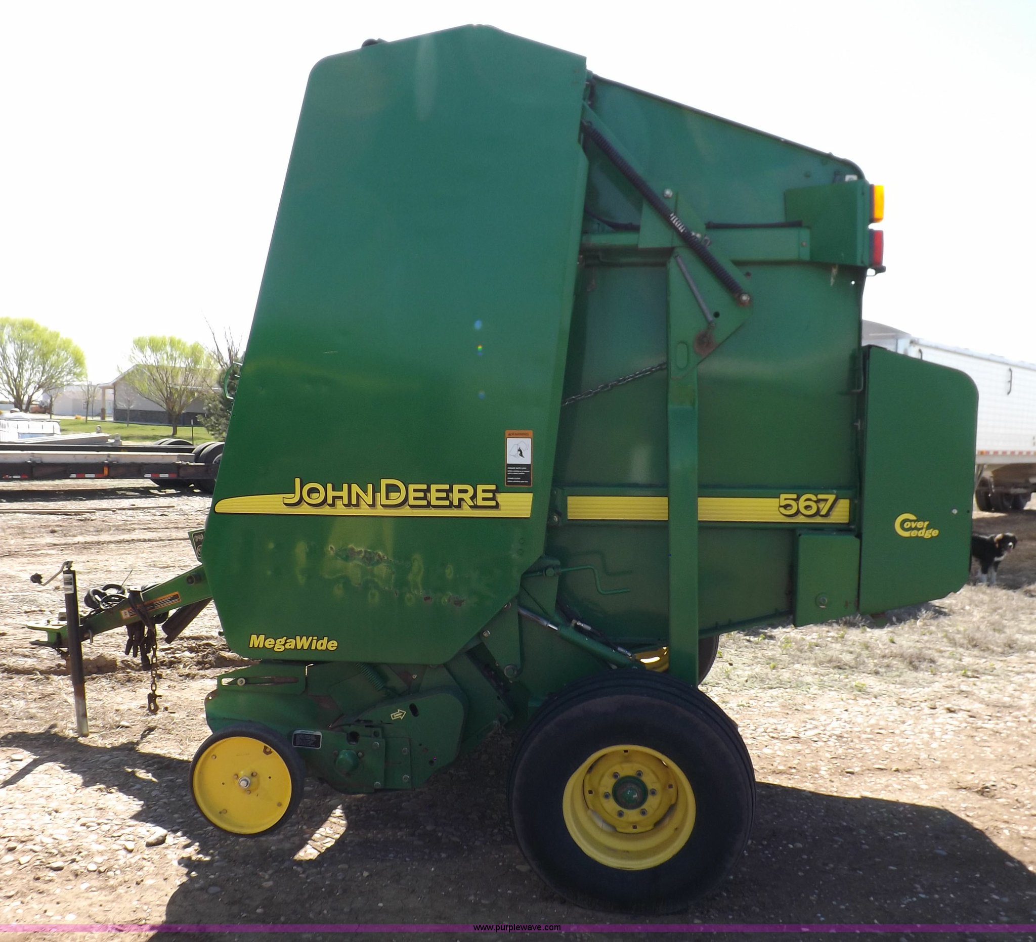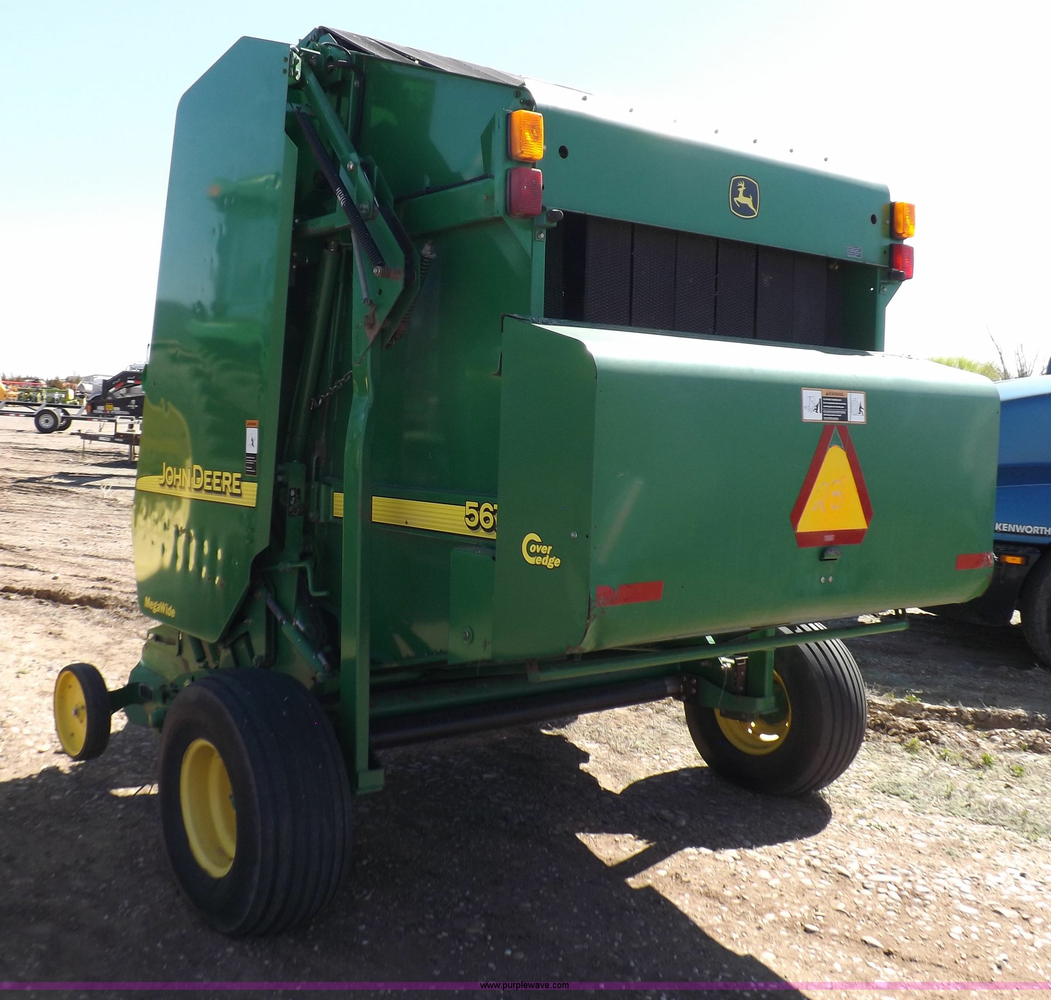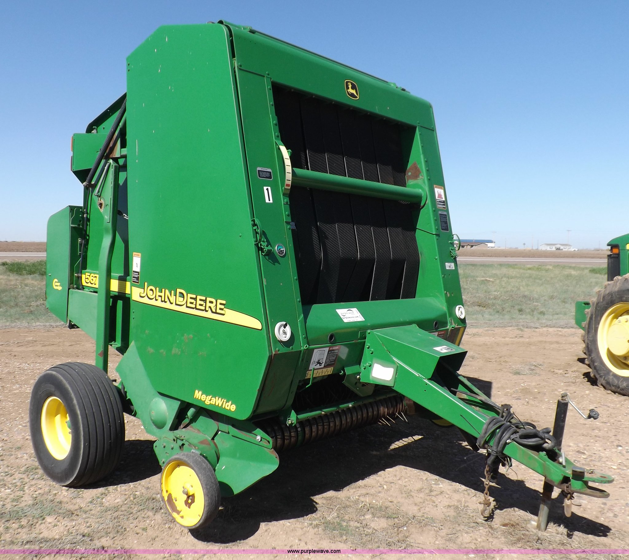 Purple Wave is selling a used Round Baler in Kansas. This item is a 2004 John Deere 567 round baler with the following: Approx. 25,000 bales, 5' x 6' bale capacity, Twine tie, Net wrap, Auto-tie, 6.6'W mega wide pickup, Hydraulic pickup lift, John Deere Computer Trac 250 monitor, Bale kicker, Bale ramp, Cover edge, 1000 PTO, Clevis hitch, Gathering wheels, 4"W x 15" diameter gauge wheels, 31x13.5-15 tires, One owner, Serial E00567X300891