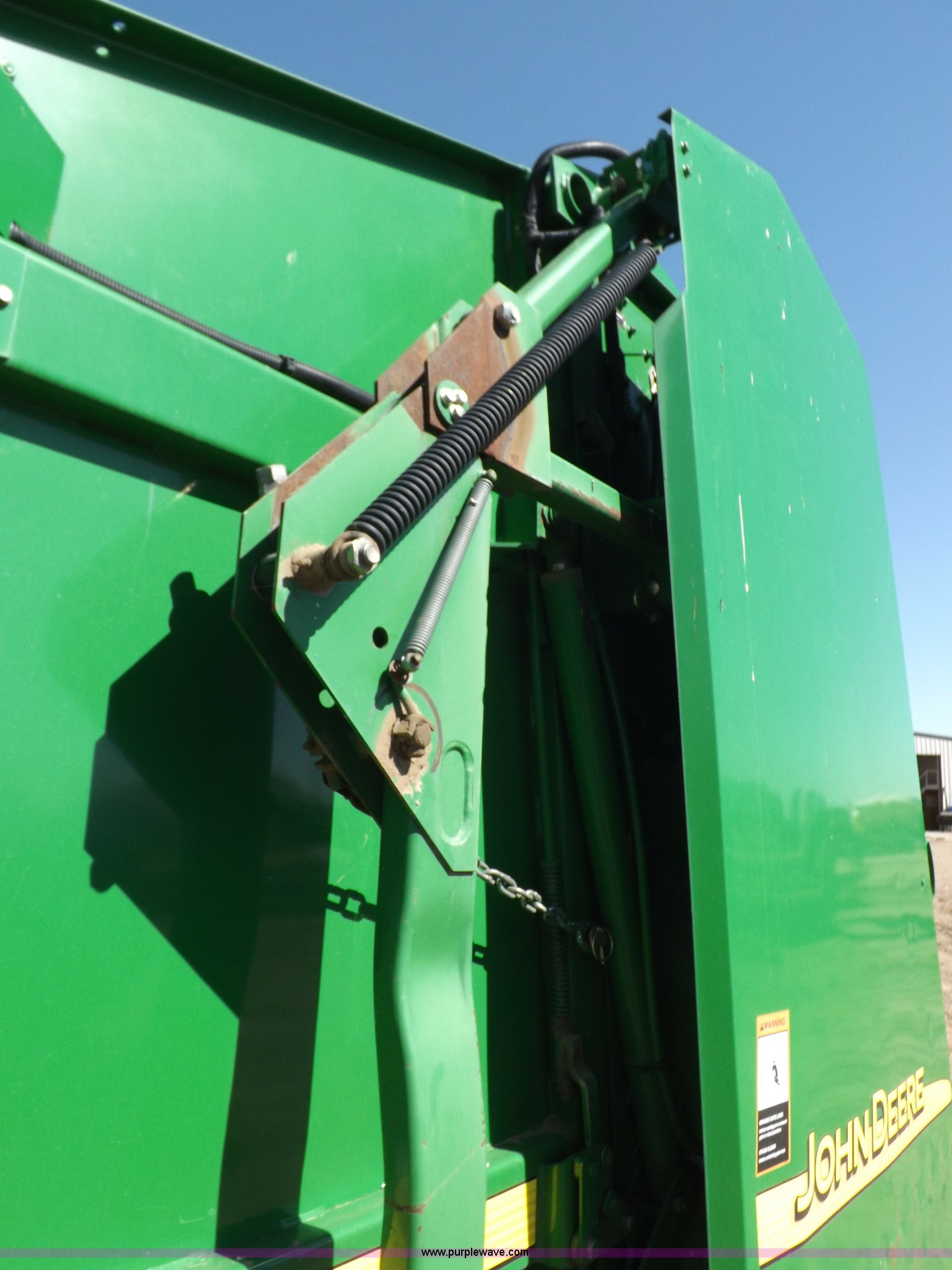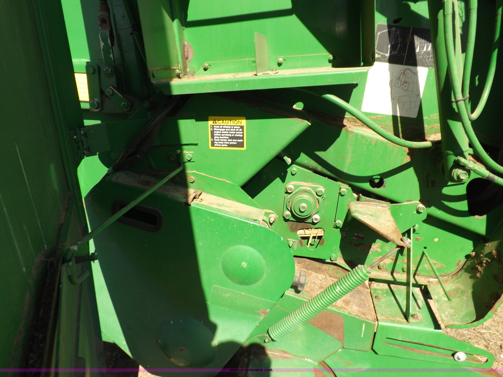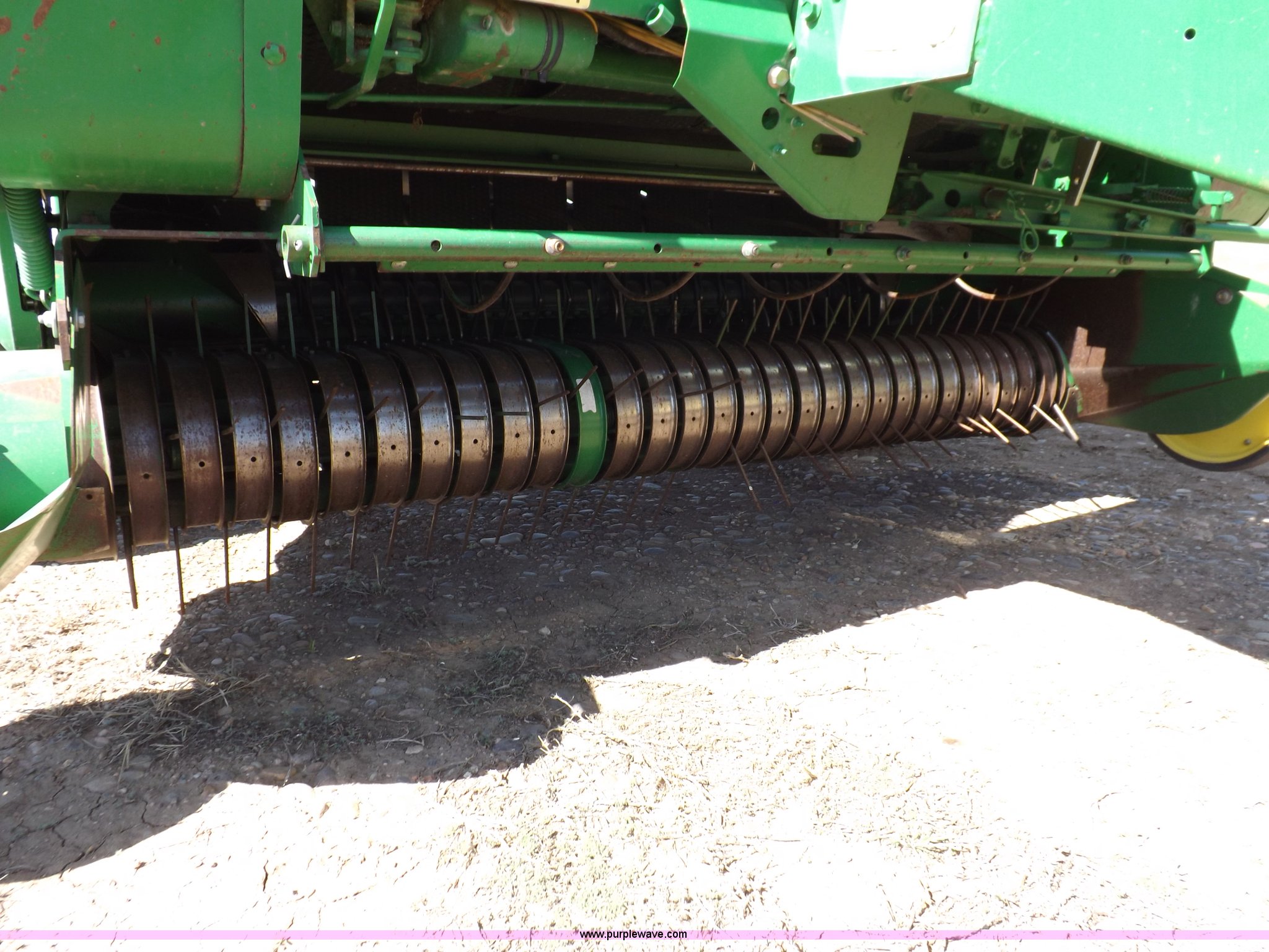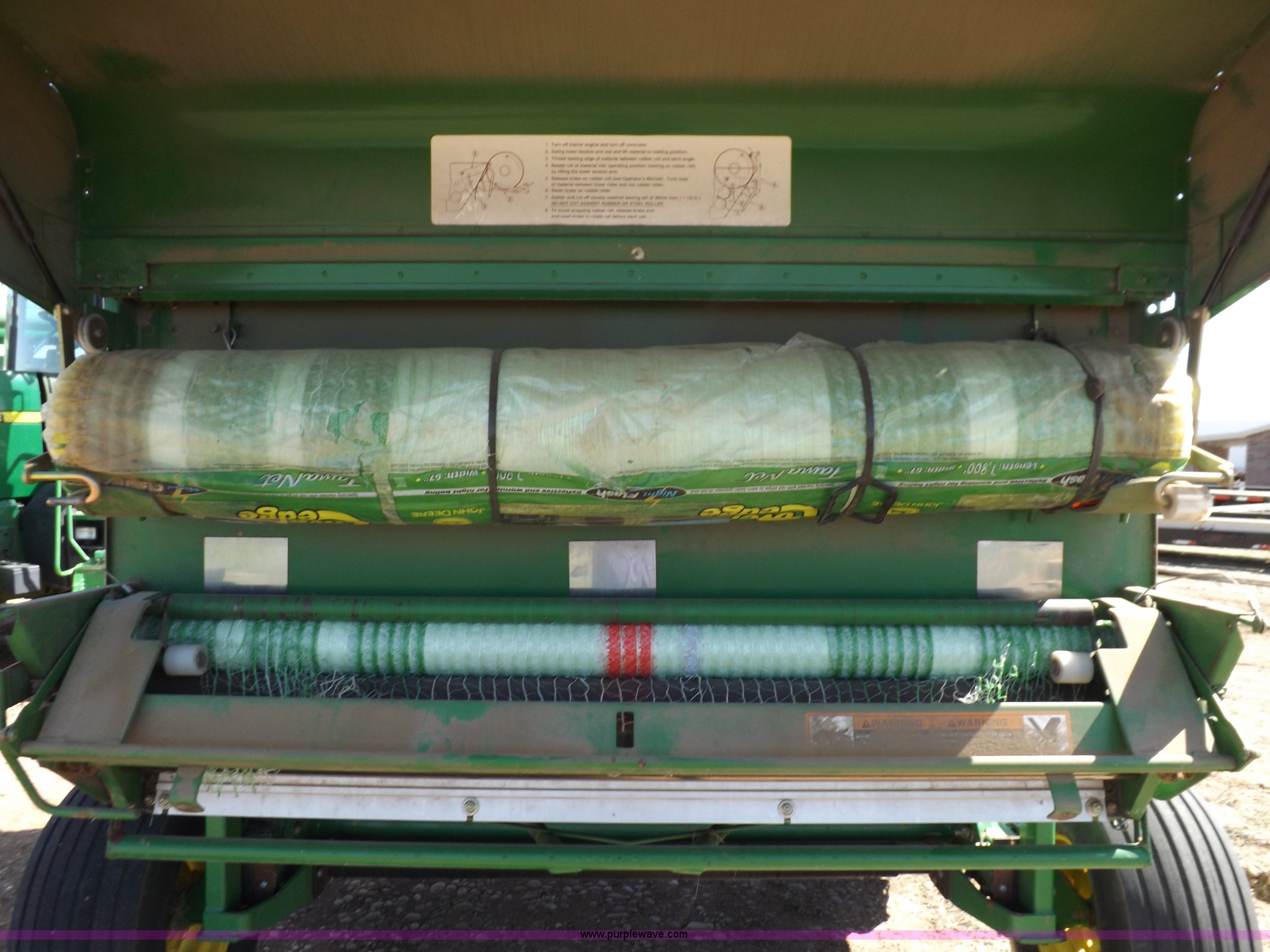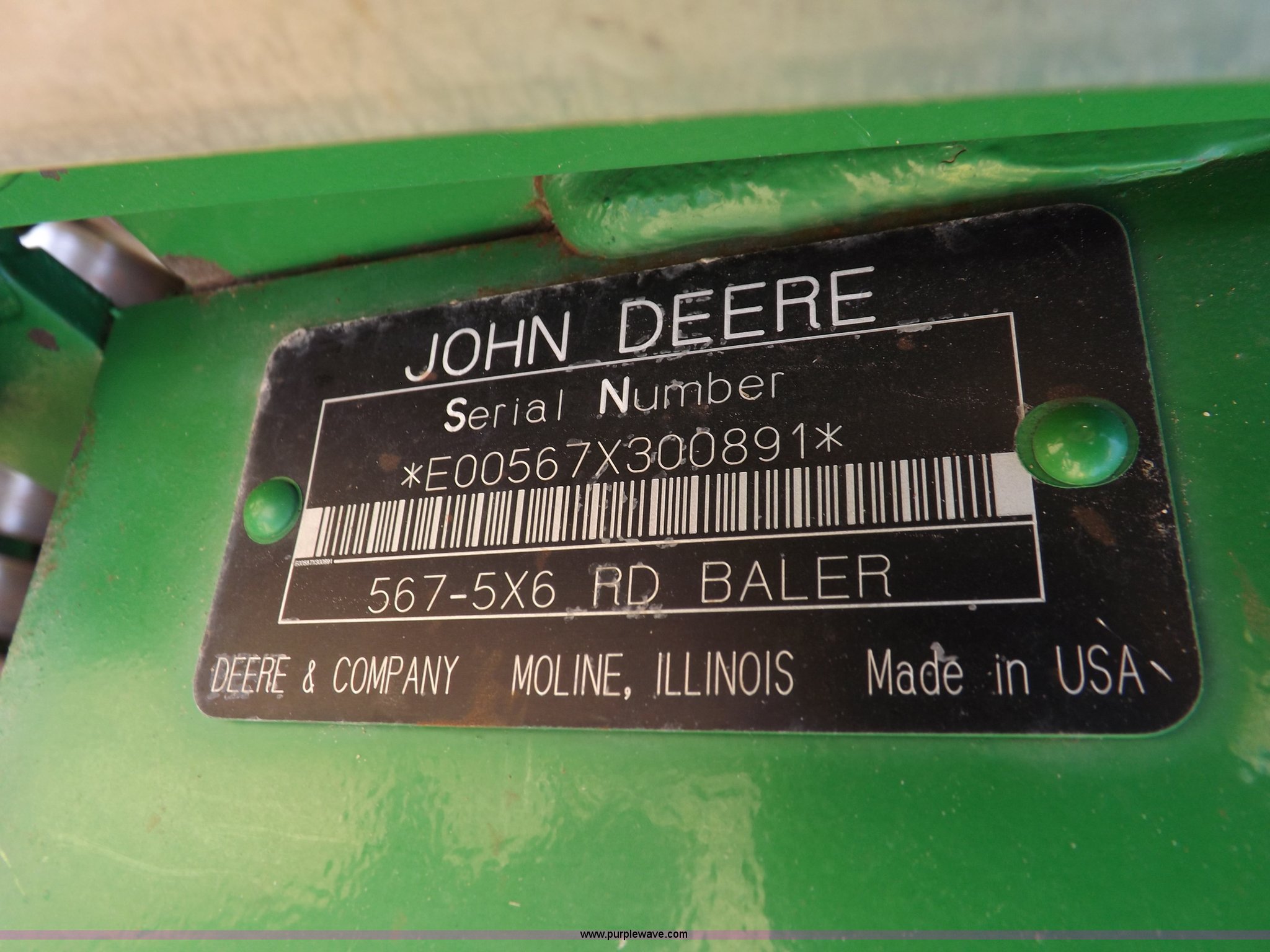 Purple Wave is selling a used Round Baler in Kansas. This item is a 2004 John Deere 567 round baler with the following: Approx. 25,000 bales, 5' x 6' bale capacity, Twine tie, Net wrap, Auto-tie, 6.6'W mega wide pickup, Hydraulic pickup lift, John Deere Computer Trac 250 monitor, Bale kicker, Bale ramp, Cover edge, 1000 PTO, Clevis hitch, Gathering wheels, 4"W x 15" diameter gauge wheels, 31x13.5-15 tires, One owner, Serial E00567X300891