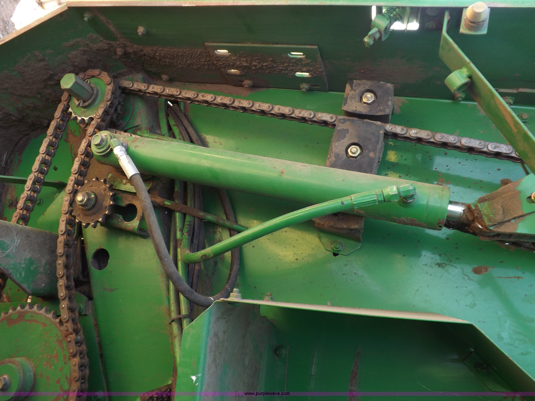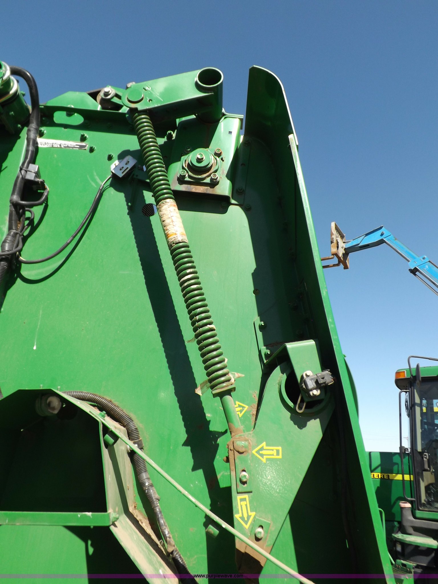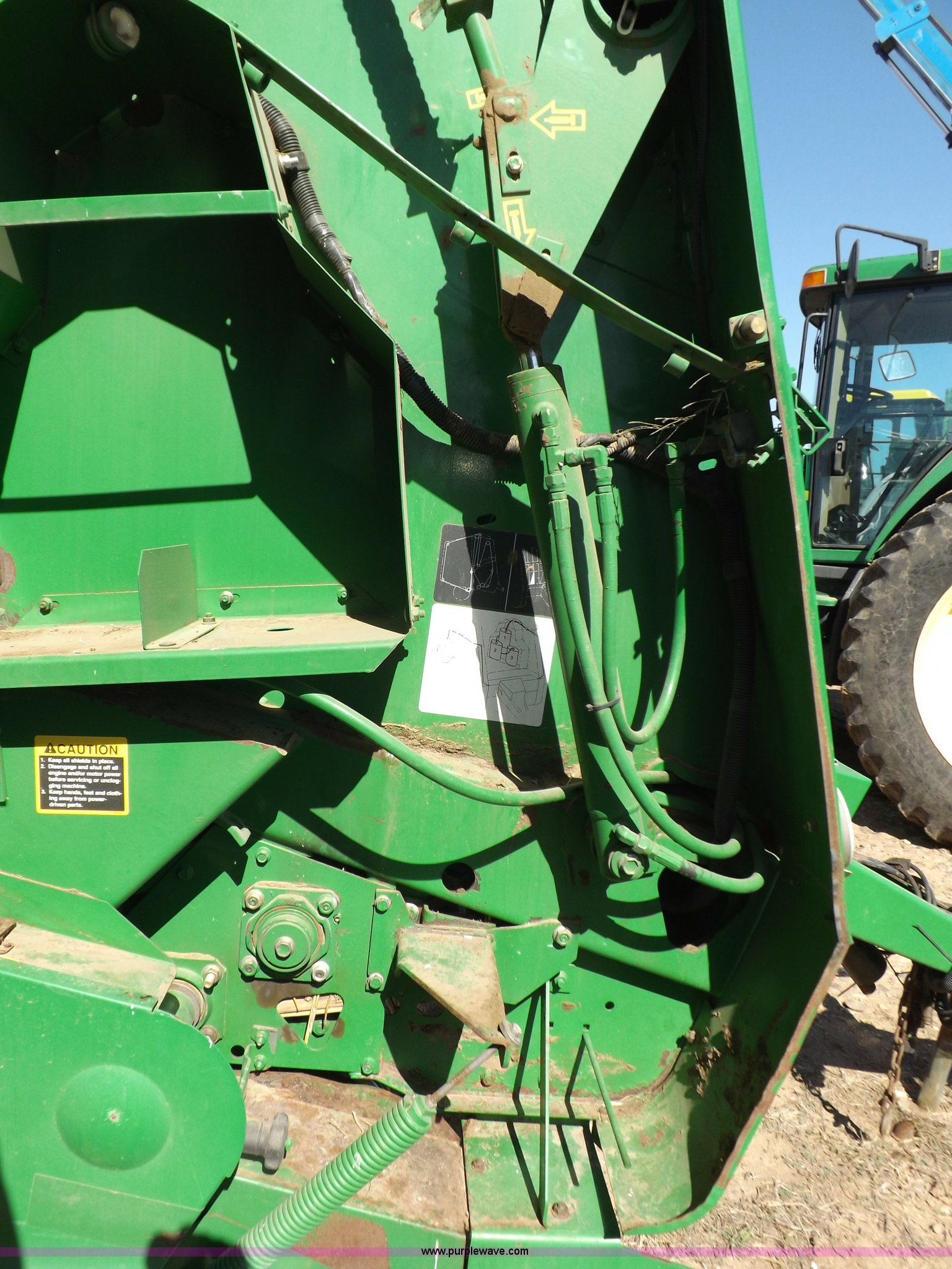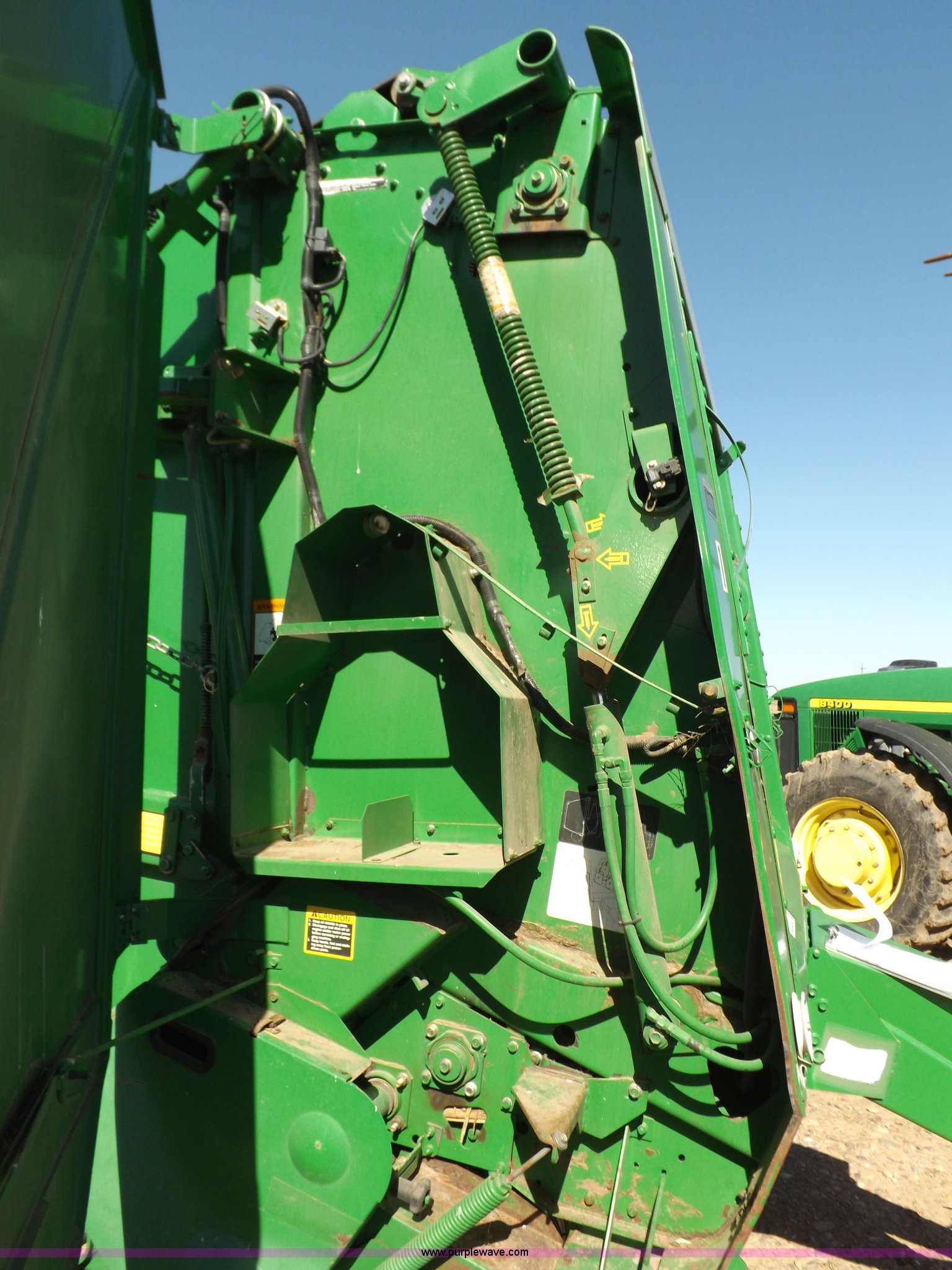 Purple Wave is selling a used Round Baler in Kansas. This item is a 2004 John Deere 567 round baler with the following: Approx. 25,000 bales, 5' x 6' bale capacity, Twine tie, Net wrap, Auto-tie, 6.6'W mega wide pickup, Hydraulic pickup lift, John Deere Computer Trac 250 monitor, Bale kicker, Bale ramp, Cover edge, 1000 PTO, Clevis hitch, Gathering wheels, 4"W x 15" diameter gauge wheels, 31x13.5-15 tires, One owner, Serial E00567X300891