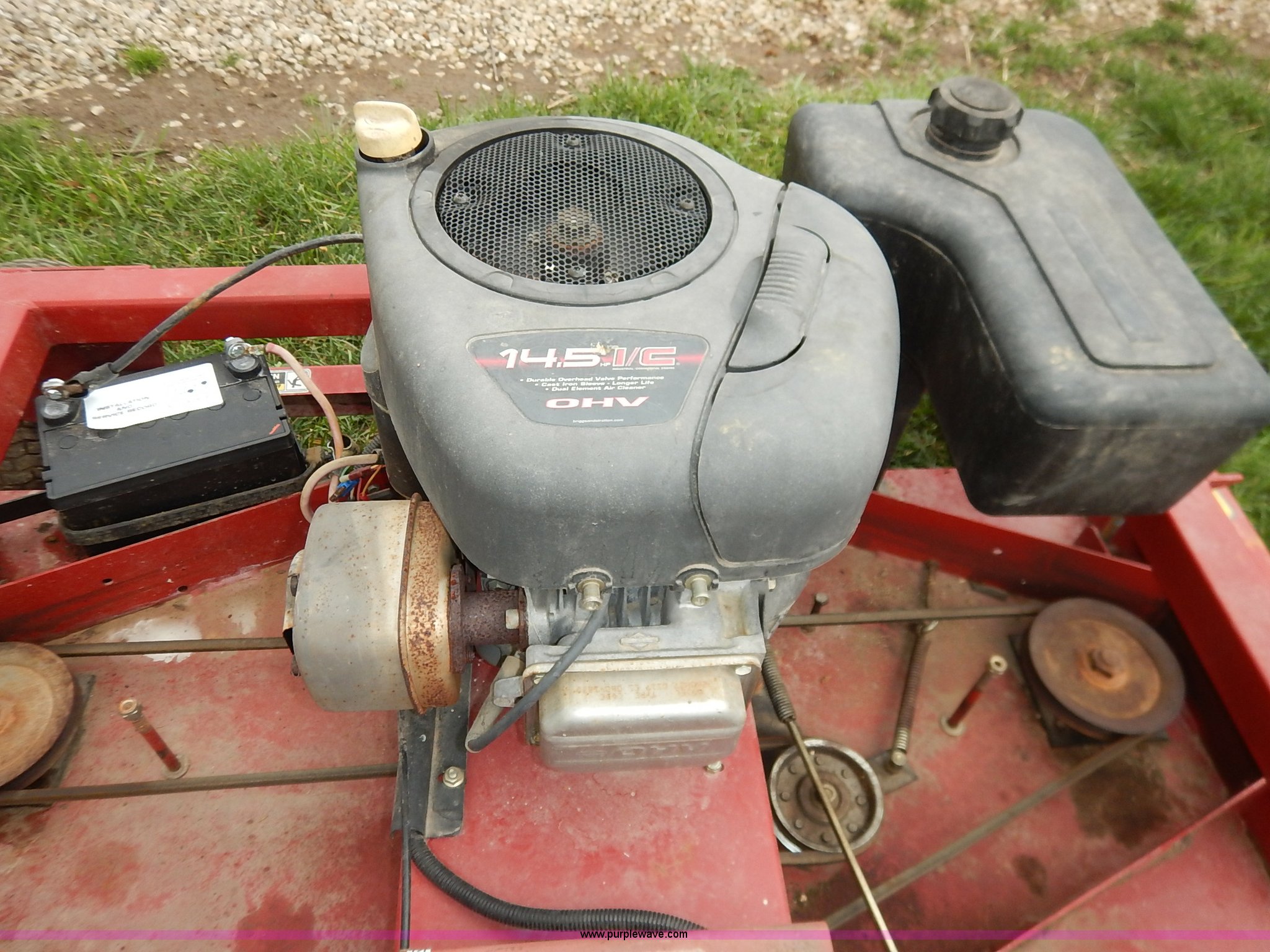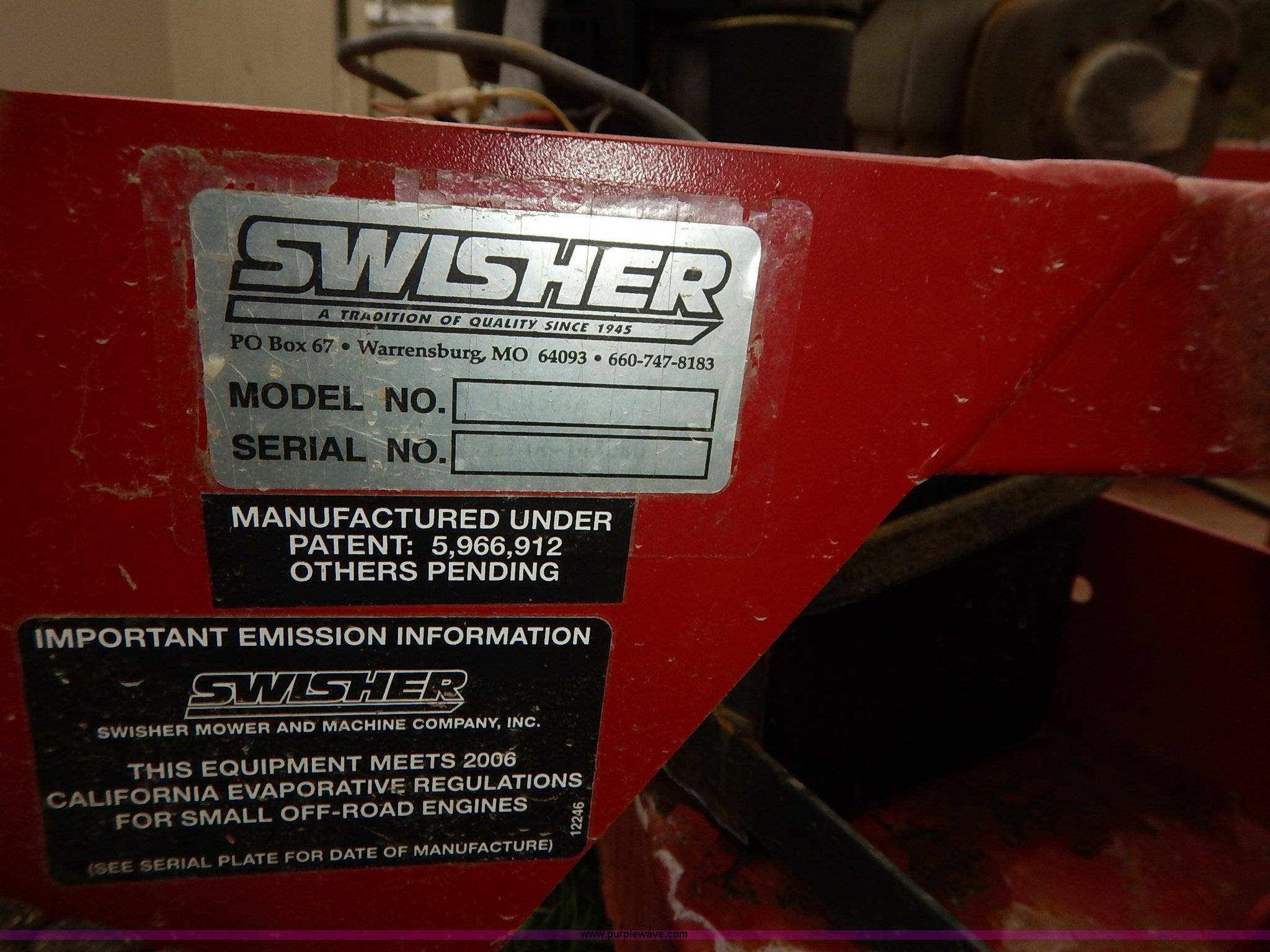 Purple Wave is selling a used Lawn Mower in Kansas. This item is a Swisher pull behind lawn mower with the following: Model T54560, 60" cut, OHV gas engine, 14.5 HP, 13x5.00-6 tires, Recently replaced battery, Serial LT-06-143080