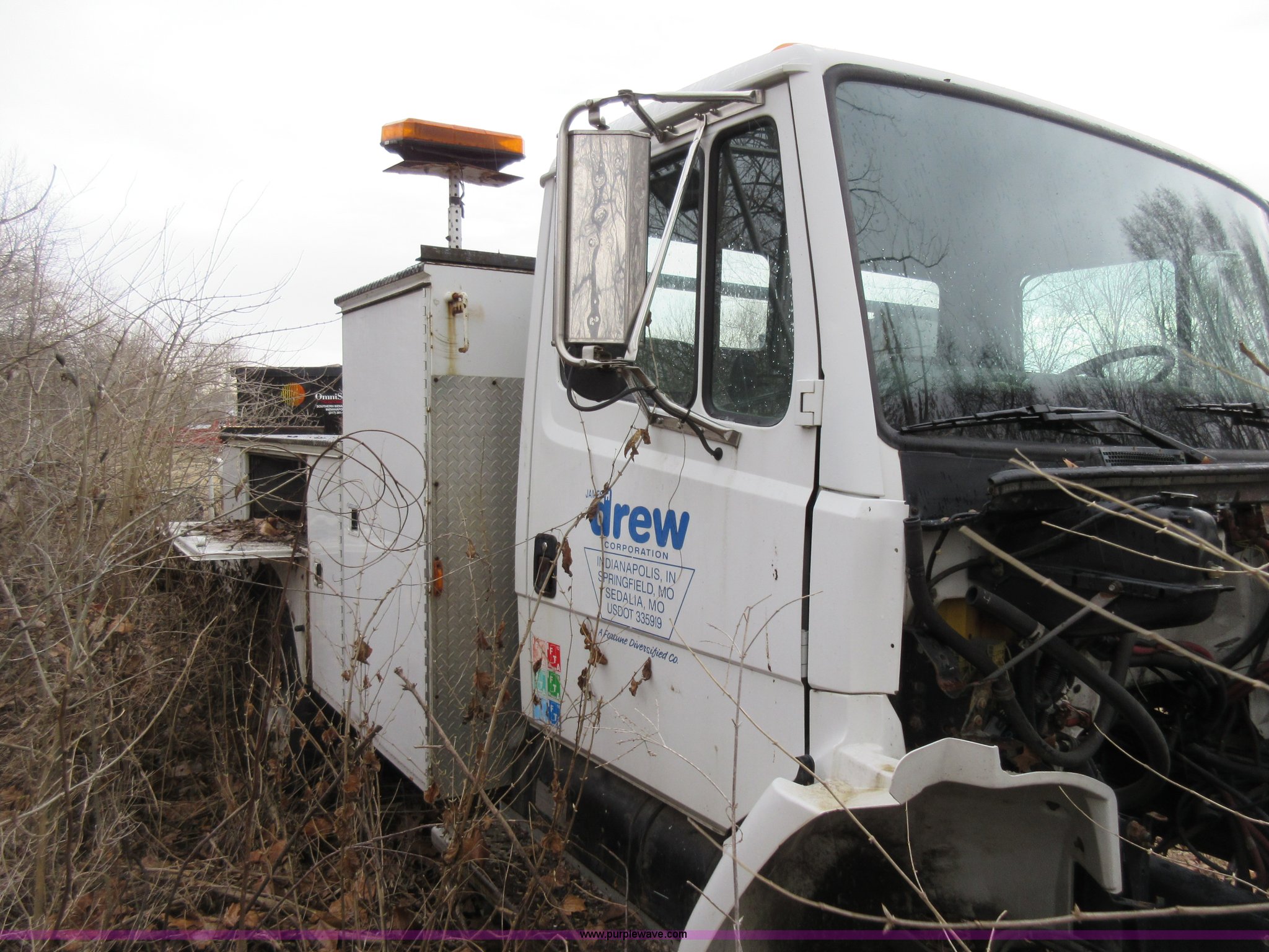 2002 Freightliner FL60 service truck. Unknown miles on odometer, No engine, No transmission, Cruise, Spring suspension seat, Altec service body Serial 4723303, 245/75R22.5 tires, GVWR 25,500 lbs, FAWR 8,000 lbs, RAWR 17,500 lbs. 1FVABPBV02HJ69279. James H. Drew Corp. 8701 Zionville Road. Indianapolis, IN 46268
