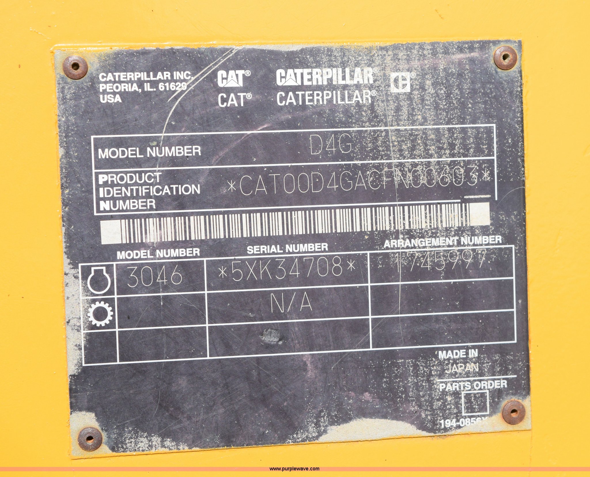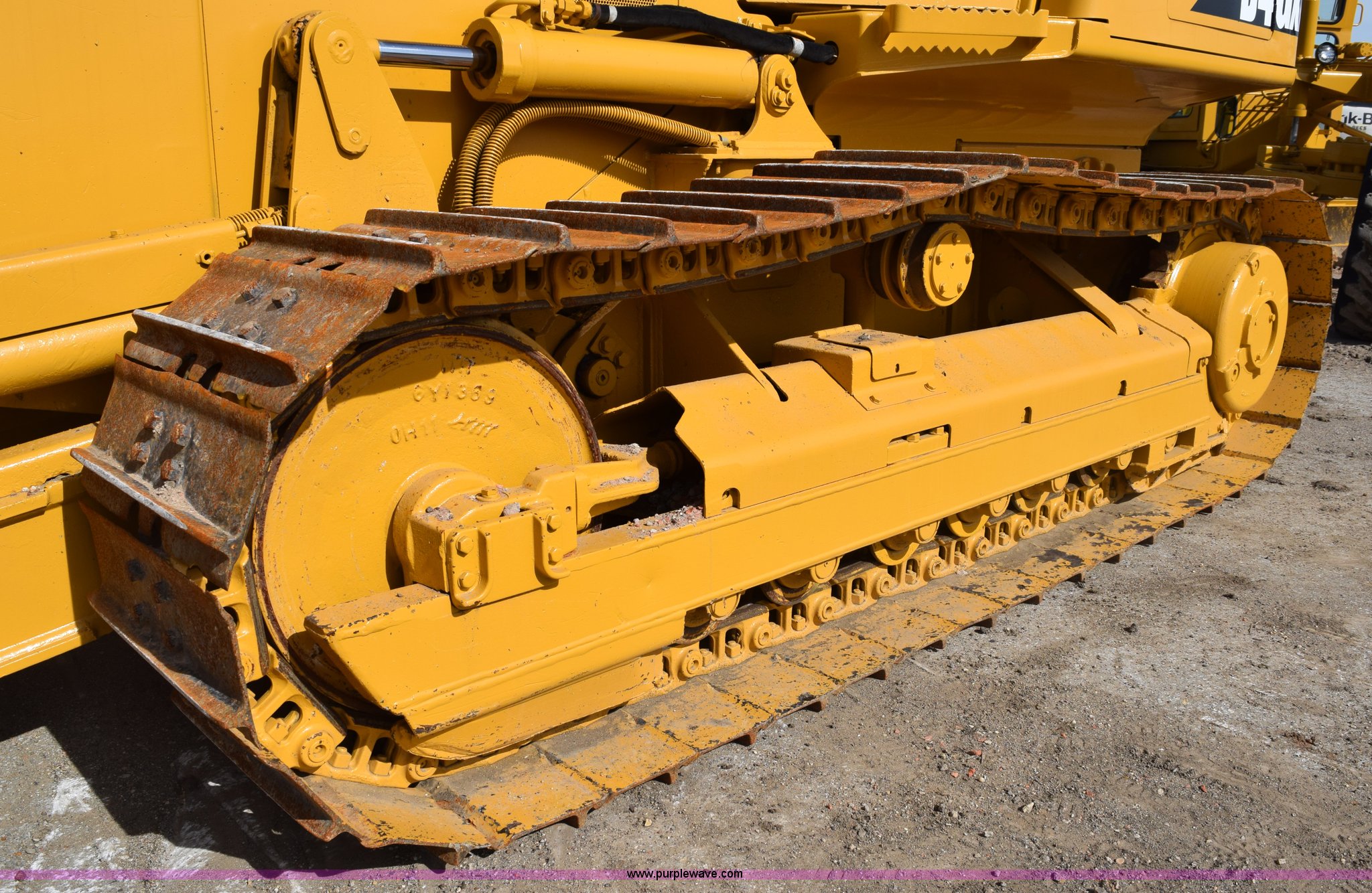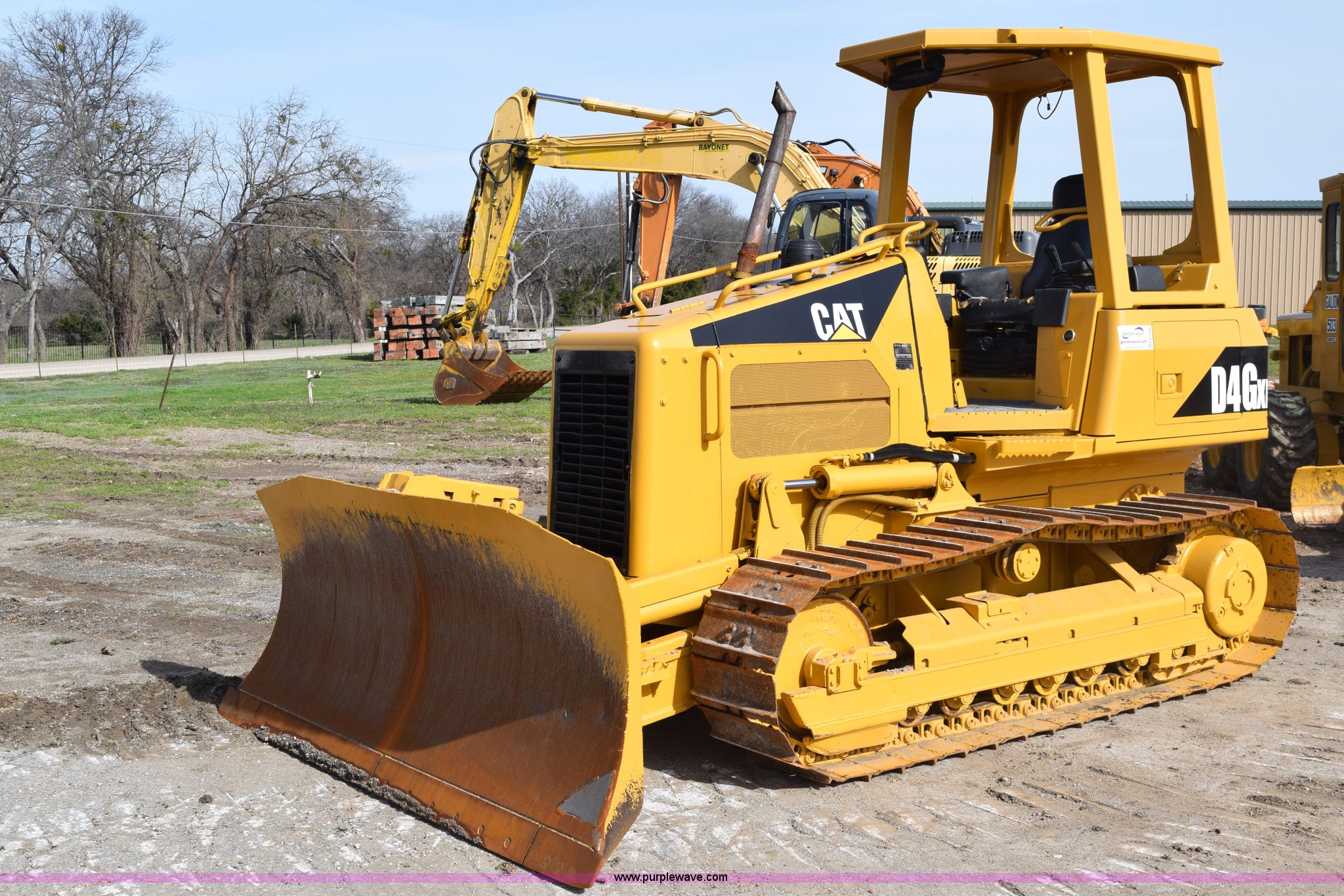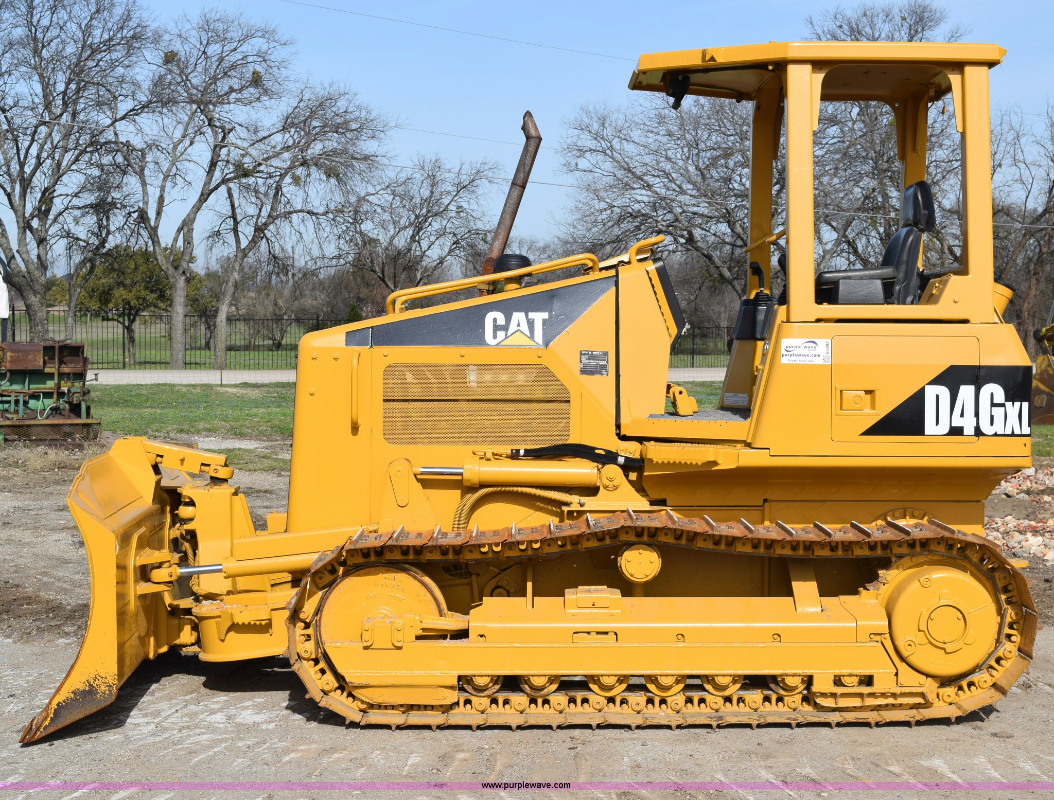 Purple Wave is selling a used Crawler Dozer in Texas. This item is a 2003 Caterpillar D4G XL dozer with the following: 192 hours on meter, Caterpillar 3046T 305 C.I.D. six cylinder diesel engine, 87 HP, Hydrostatic transmission, Canopy, Heat, Vents, Suspension seat, Joystick steering, Joystick dozer control, Engine enclosures, 104"W dozer face, 40"H, Angle, Tilt, 48.6 gallon fuel capacity, Seven bottom rollers, 18"W steel single grouser track pads, 13'2"L x 6'5"W x 9'H, 17,317 lbs. base operating weight, Serial CAT00D4GACFN00603