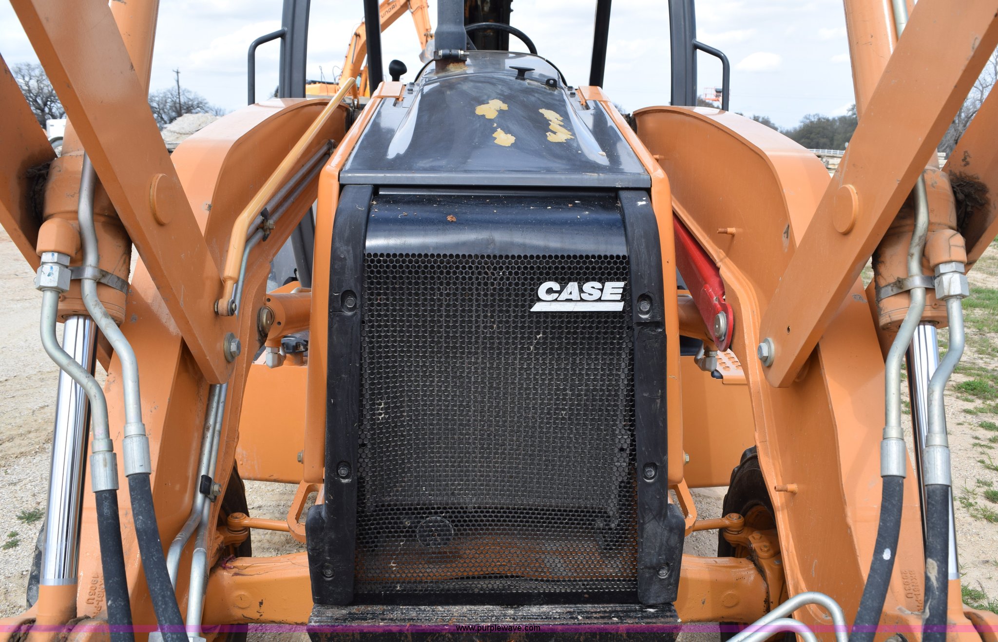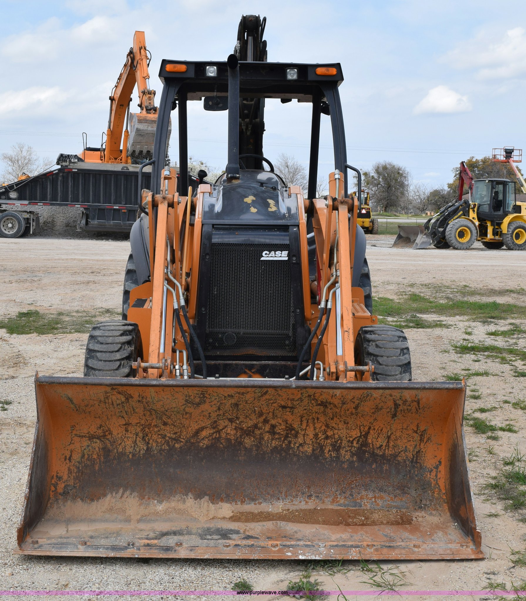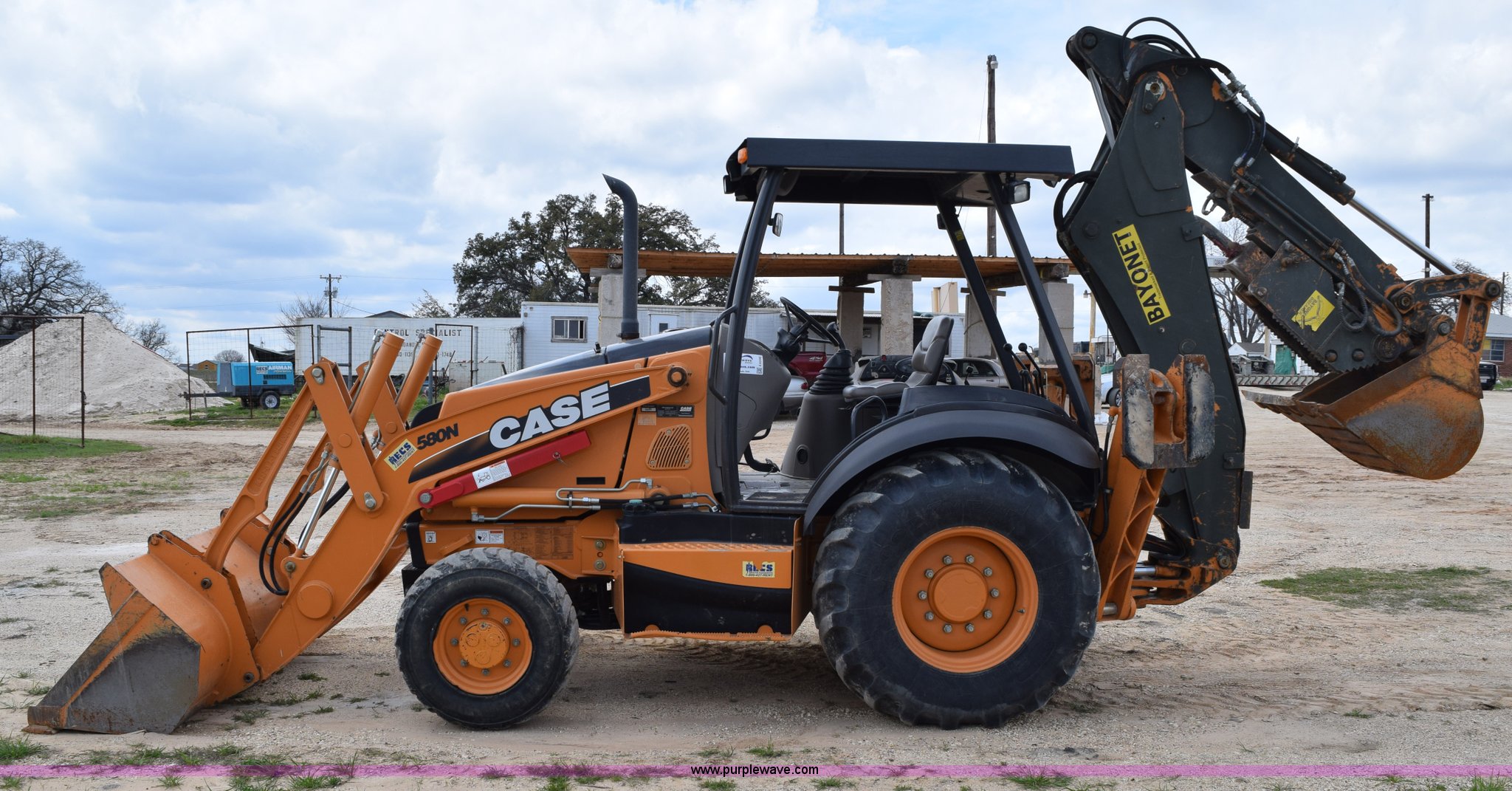 Purple Wave is selling a used Tractor Loader Backhoe in Texas. This item is a 2011 Case 580N backhoe with Bayonet Breaker with the following: 941 hours on meter, Case 445T 4.5L four cylinder turbo diesel engine, 85 HP, Power shuttle synchromesh transmission, 4F-4R gears, Four wheel drive, ROPS, Spring suspension seat, Four stick backhoe controls, Front and rear work lights, Standard front end loader, 82"W bucket, 0.88 cubic yard capacity, Bolt-on cutting edge, 22"W backhoe bucket, Bolt-on cutting edge, 14'9" maximum digging depth, 18'4" reach from swivel, Corporal Bayonet breaker attachment, 800 foot lbs blow class, 800 lbs working weight, 23'4"L x 6'9"W x 10'10"H, 7' wheelbase, 12 x 16.5 front tires, Goodyear 19.5L-24 rear tires, Serial JJGN580NJBC541743