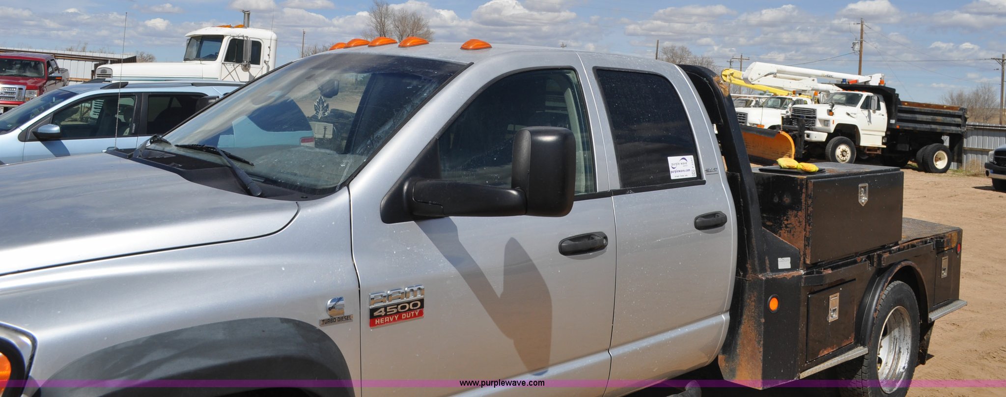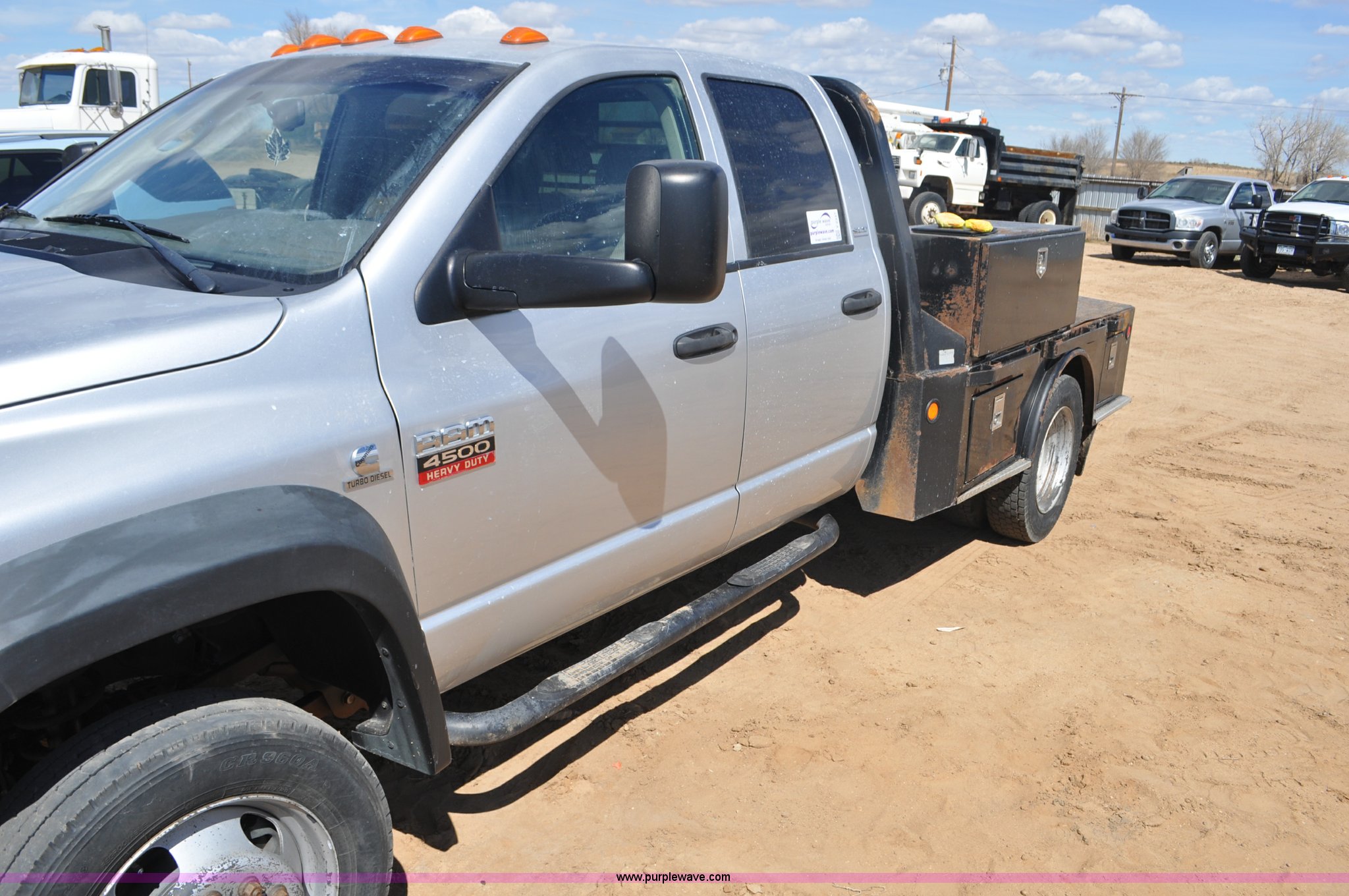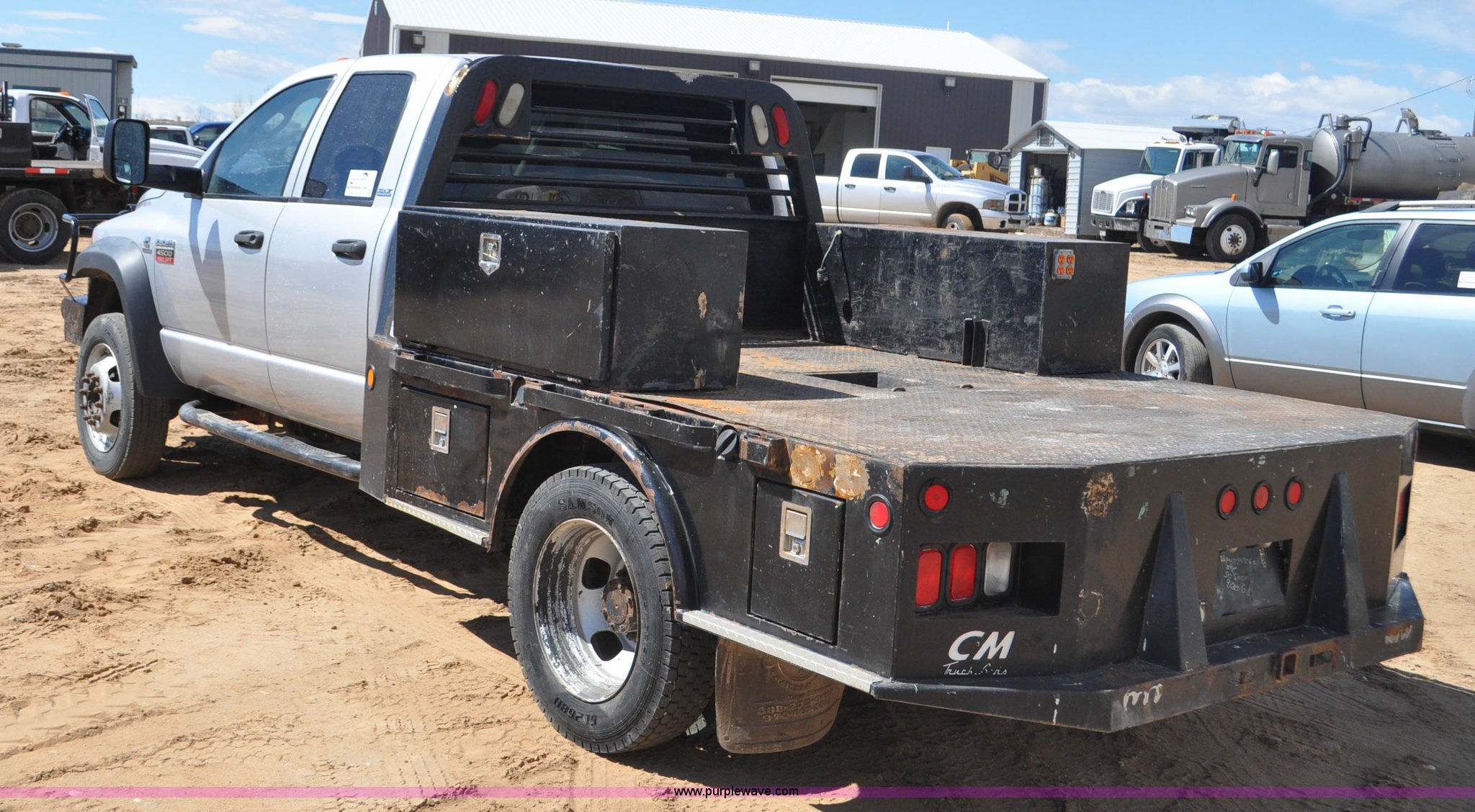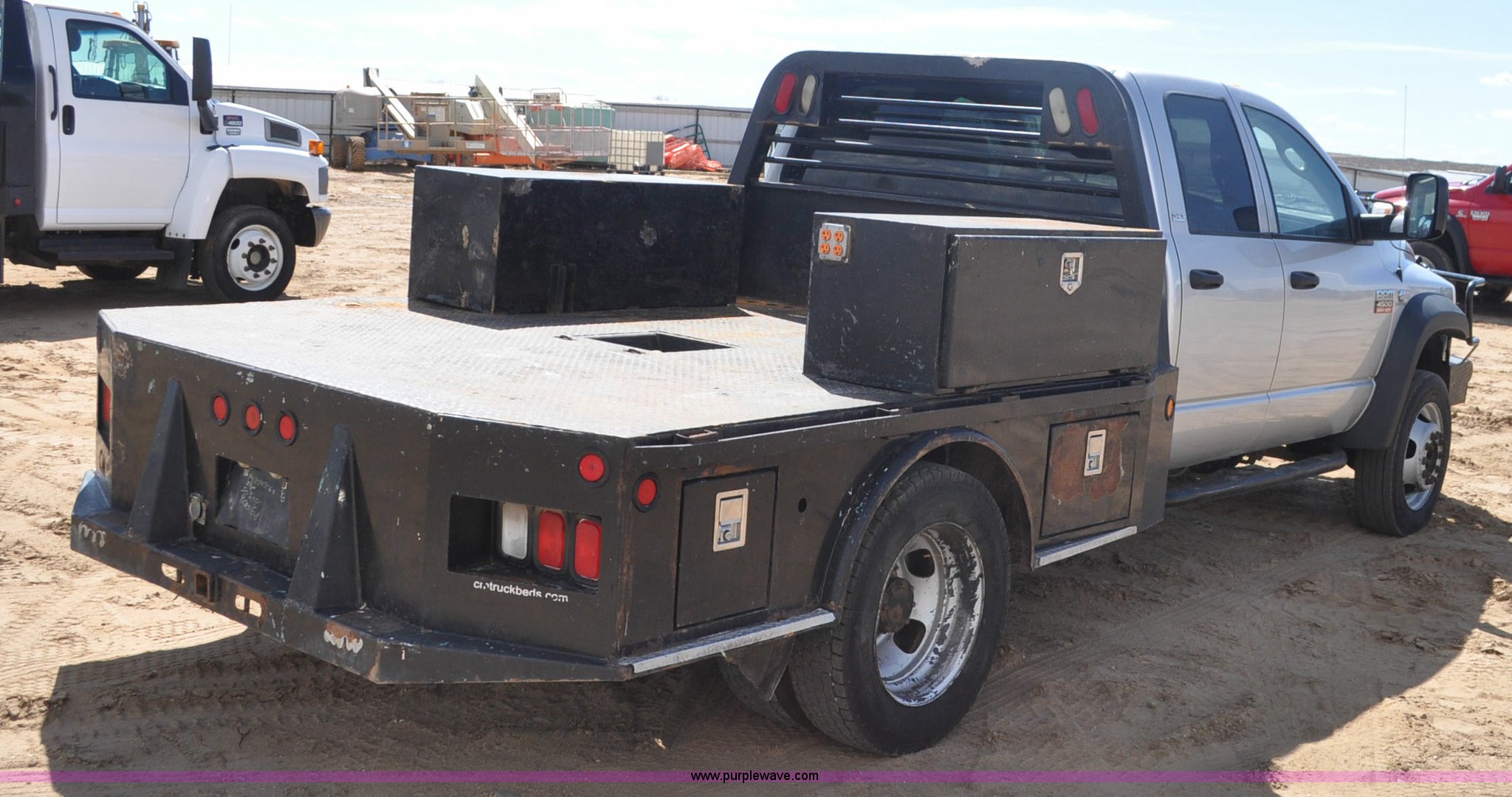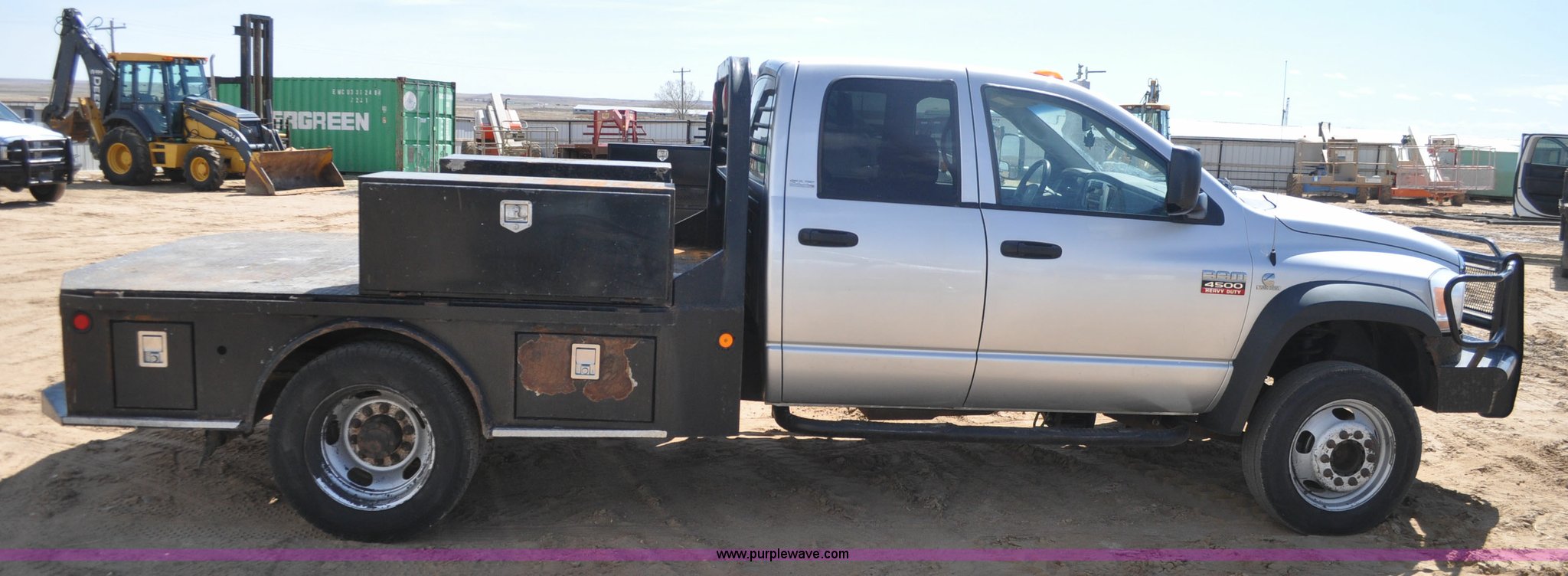 Purple Wave is selling a used Flat Bed Truck in Colorado. This item is a 2009 Dodge Ram 4500HD SLT Quad Cab flatbed truck with the following: 143,628 miles on odometer, 6.7L L6 OHV 24V turbo diesel engine, Automatic transmission, Four wheel drive, Tilt, Cruise, AM/FM/CD, Power windows, locks, mirrors, and seats, Cloth interior, 112"L x 94"W flatbed, Gooseneck hitch, (4) built-in toolboxes, (2) mounted toolboxes, Grill guard, Running boards, Receiver hitch, Trailer wiring, 225/70R19.5 tires, Recently replaced rear window, Interior/exterior cosmetic damage