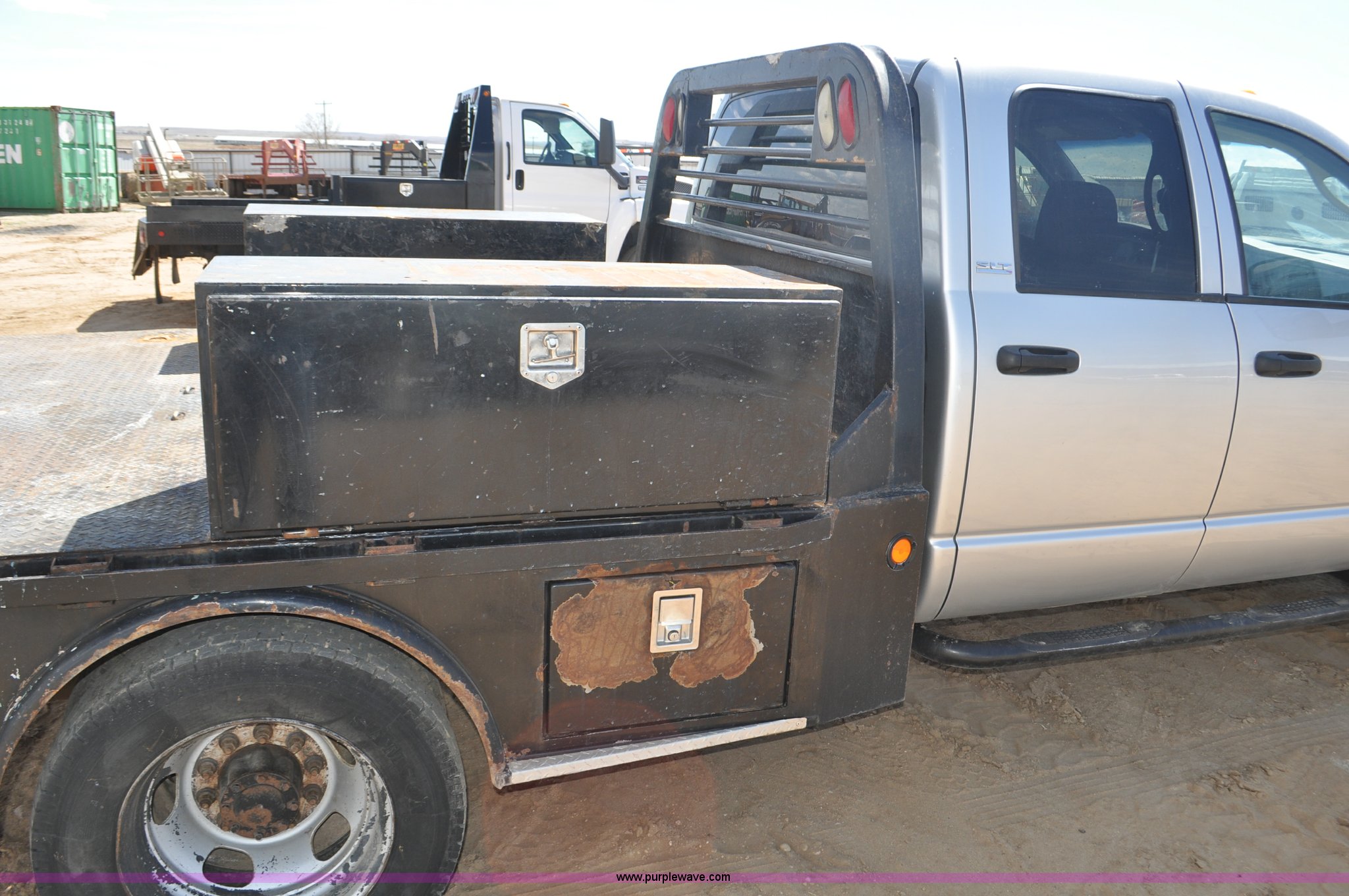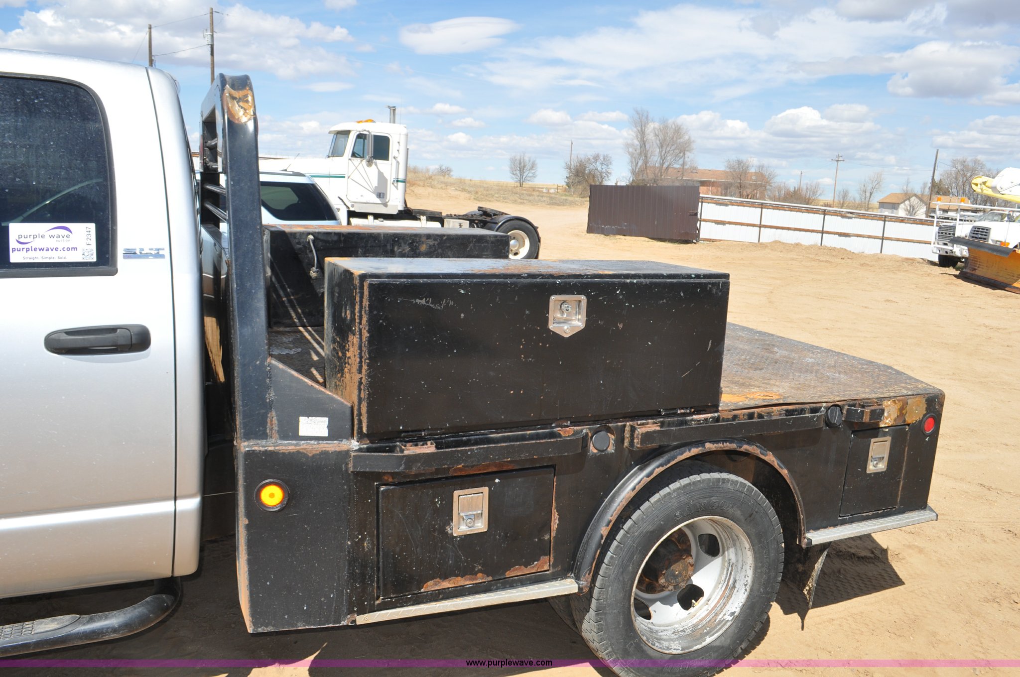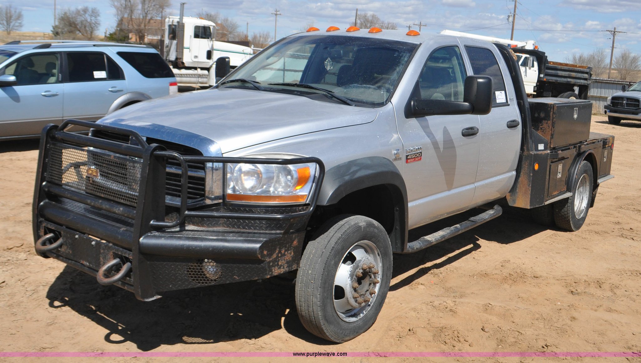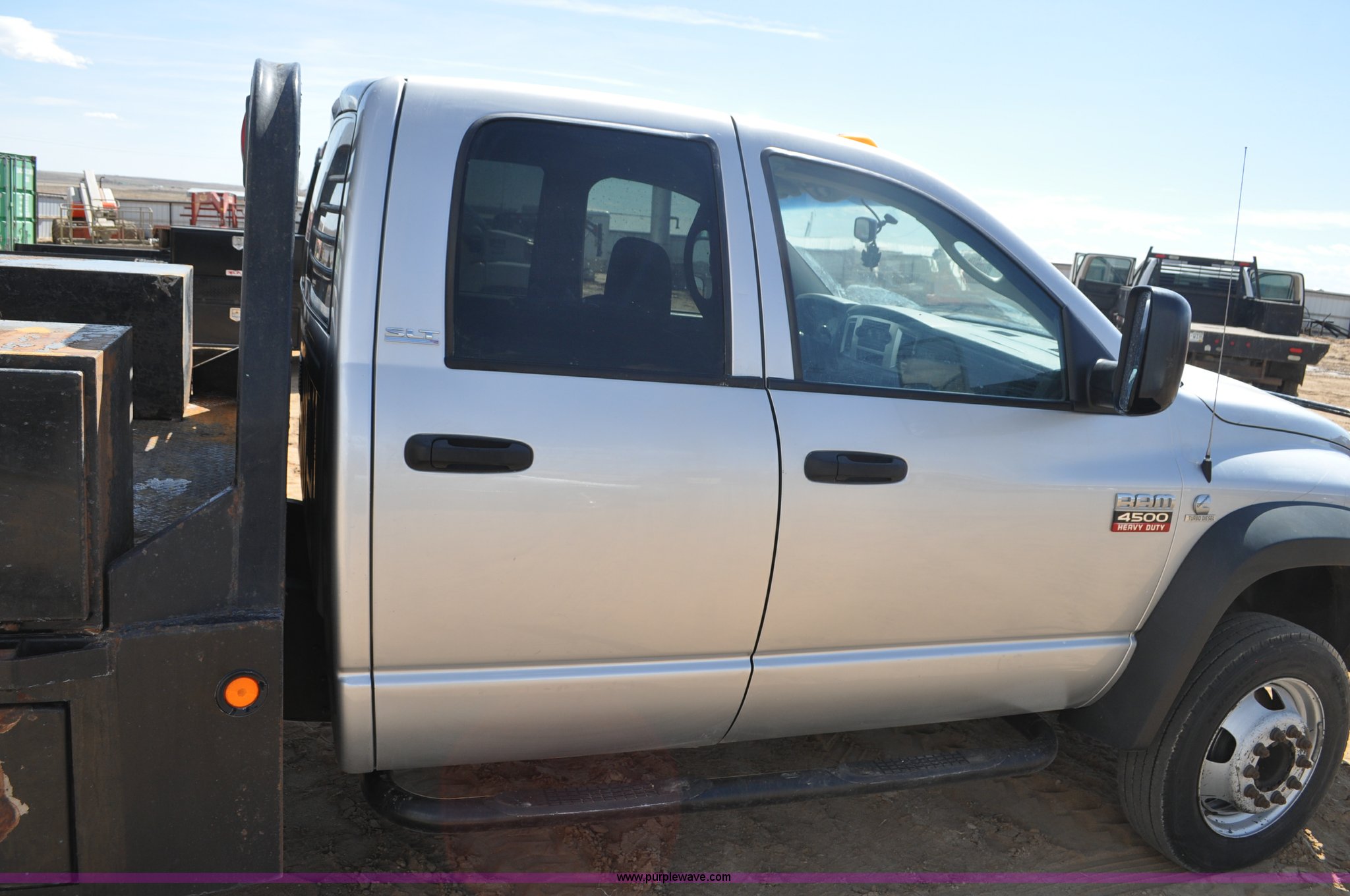 Purple Wave is selling a used Flat Bed Truck in Colorado. This item is a 2009 Dodge Ram 4500HD SLT Quad Cab flatbed truck with the following: 143,628 miles on odometer, 6.7L L6 OHV 24V turbo diesel engine, Automatic transmission, Four wheel drive, Tilt, Cruise, AM/FM/CD, Power windows, locks, mirrors, and seats, Cloth interior, 112"L x 94"W flatbed, Gooseneck hitch, (4) built-in toolboxes, (2) mounted toolboxes, Grill guard, Running boards, Receiver hitch, Trailer wiring, 225/70R19.5 tires, Recently replaced rear window, Interior/exterior cosmetic damage