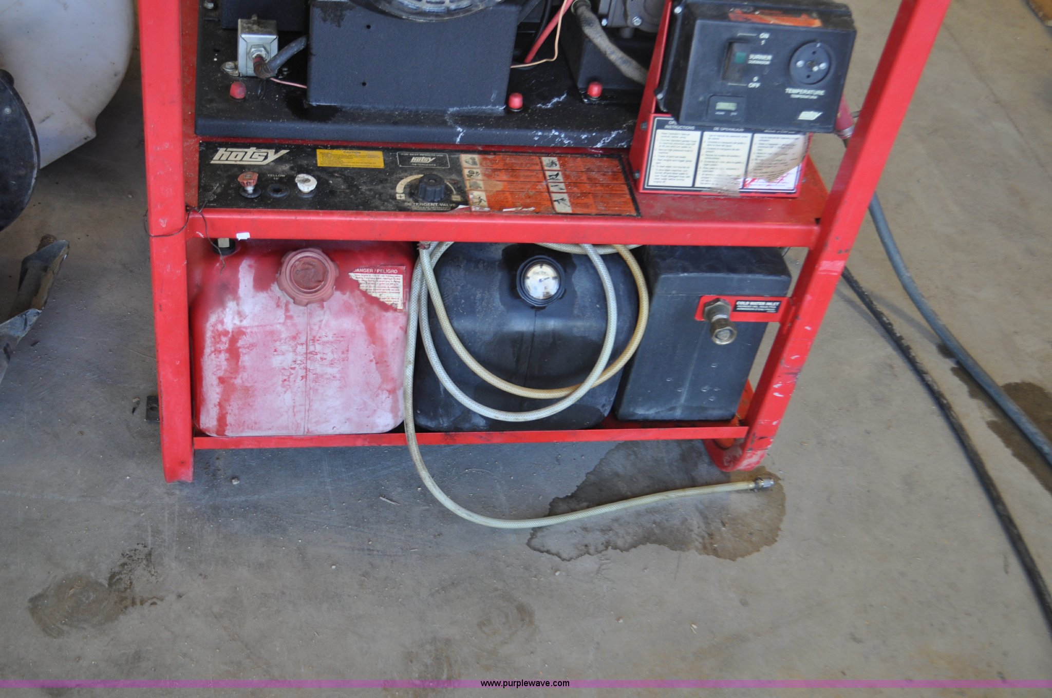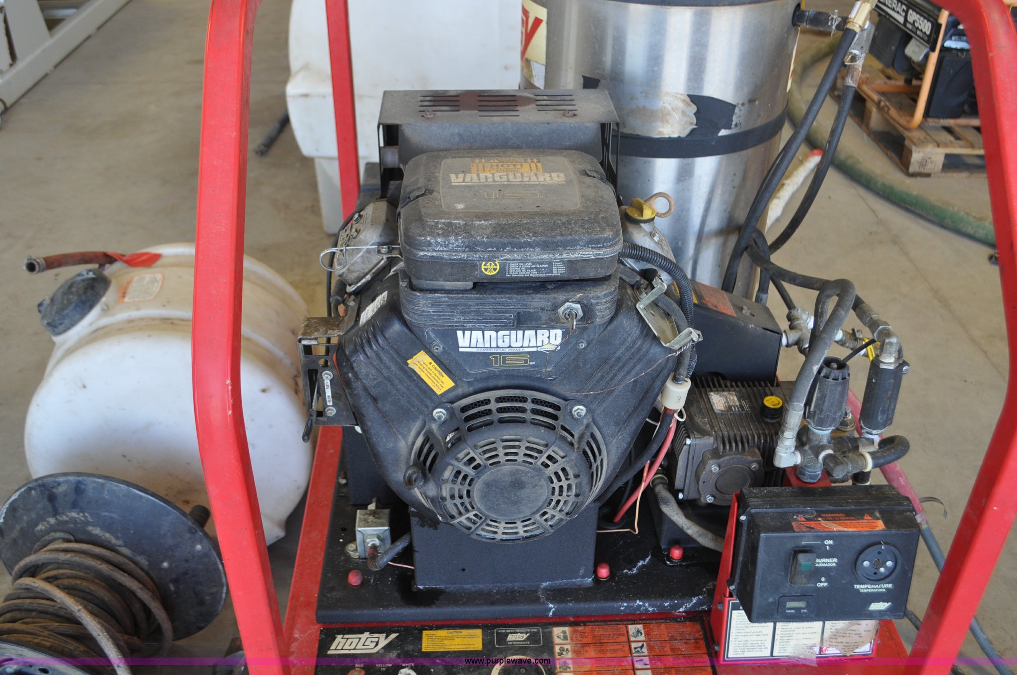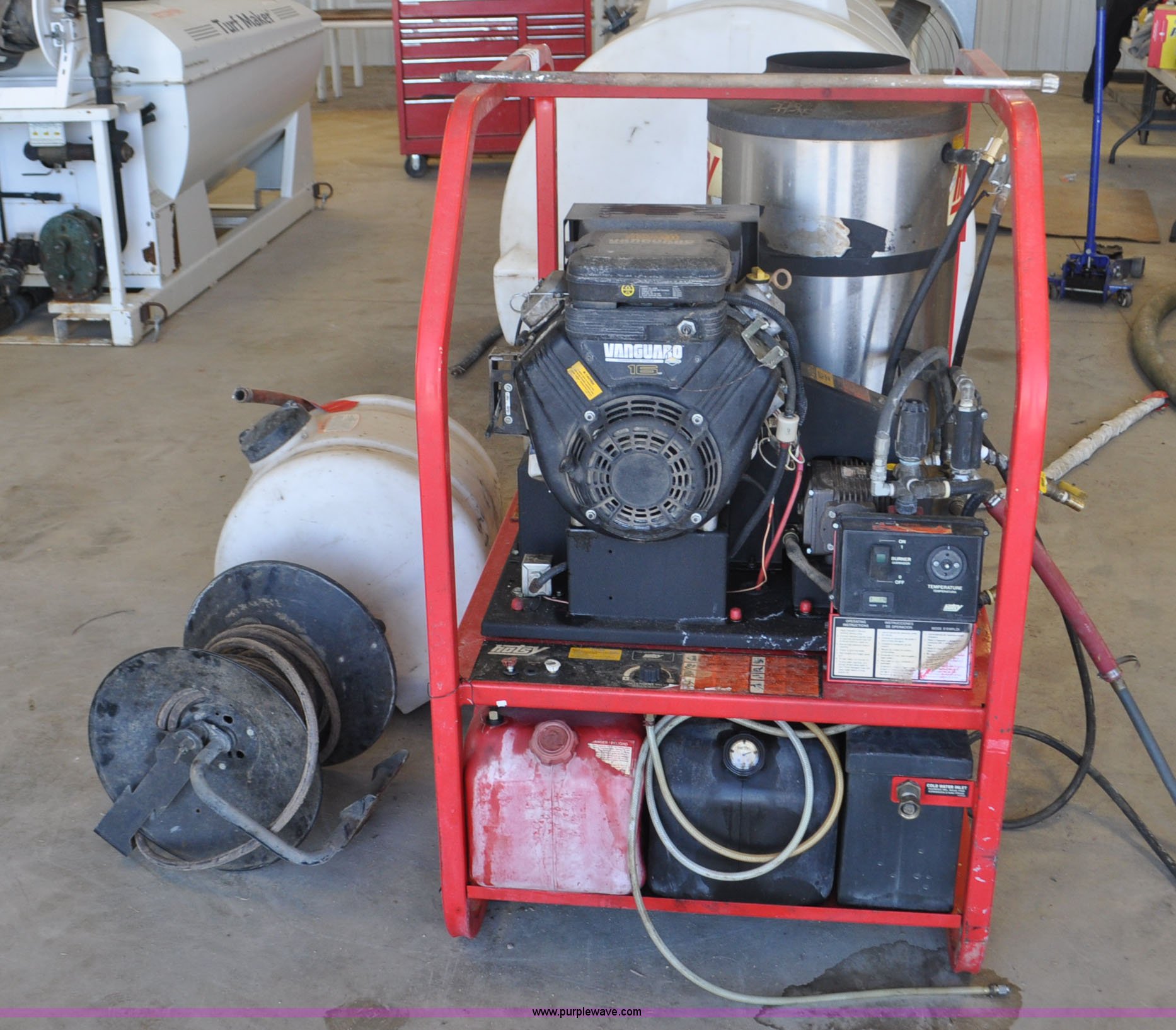 Purple Wave is selling a used Pressure Washer in Colorado. This item is a Hotsy pressure washer with the following: Briggs & Stratton Vanguard V-twin gas engine, 16 HP, 110V generator, Diesel fired burner, Hose reel, 3,000 psi, 4.3 gallon per minute capacity, 398,400 BTU, 30 gallon poly winterization tank, 1,000 gallon poly water tank, Wands, Serial 11105350-162200